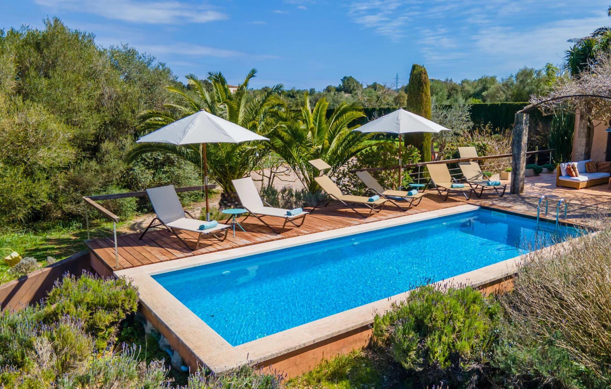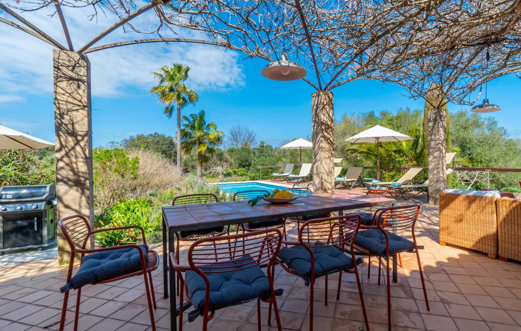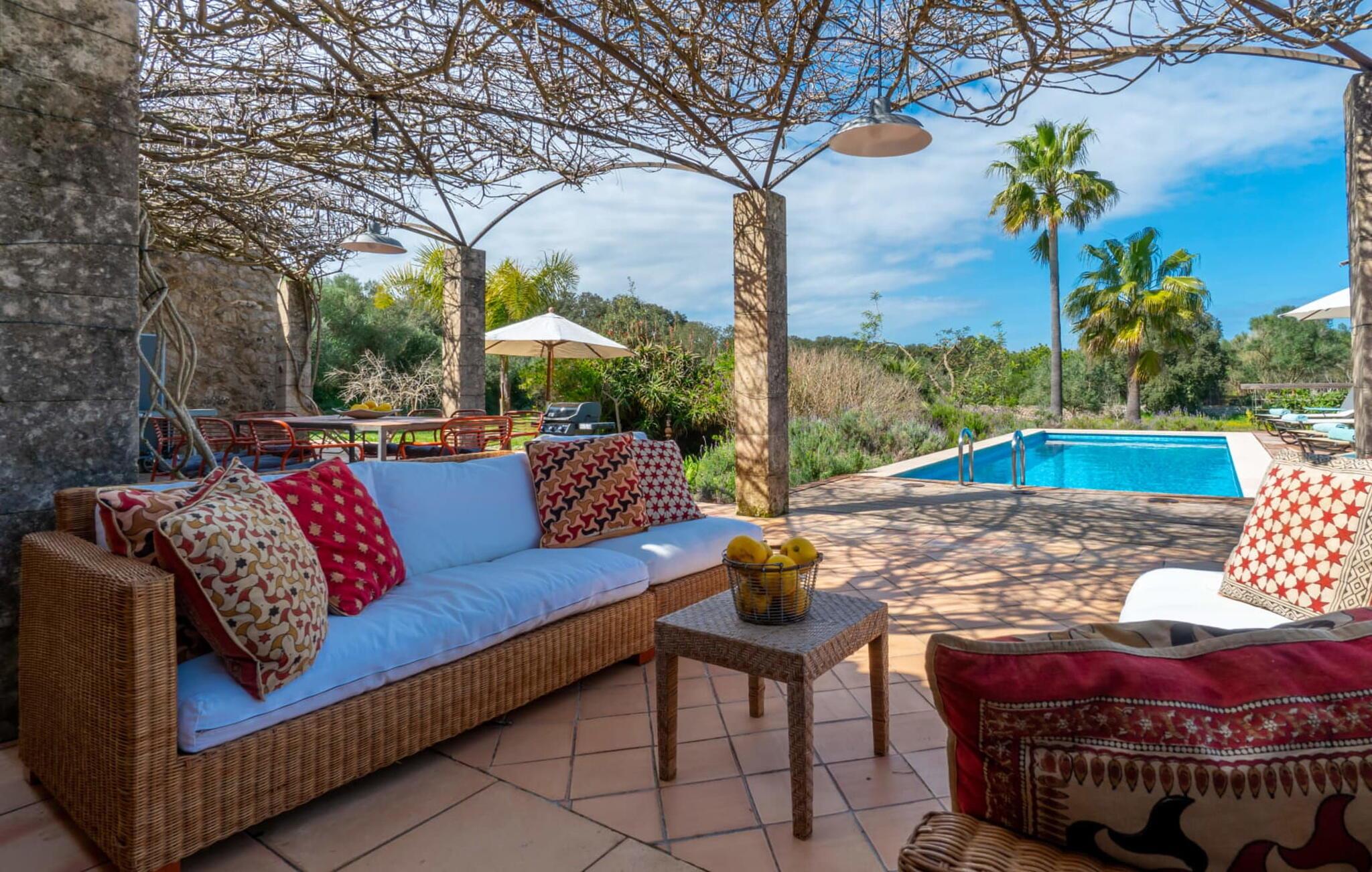 Rustikal und charmant liegt die Villa „Casa Alma“ eingebettet in die traumhafte Landschaft der Ostseite der Insel. Das typisch mallorquinische Haus steht auf einem 7.000 m² großen Grundstück in absolut ruhiger Lage nur 2 km südlich der Stadt Artà. Es ist von ausgedehnten Oliven- und Mandelbäumen umgeben und sein authentischer Landhausstil passt perfekt zur lokalen Inselumgebung. Umgeben von einem großen, naturbelassenen Garten verfügt dieses Ferienhaus über 300 m² abwechslungsreiche Terrassen, die an der Nordseite des Gebäudes einen Pool beherbergen. Dieser ist leicht erhöht und von einer schönen Holzterrasse (mit Geländer) umschlossen. Es sieht aus wie ein hübsches Sonnendeck an Bord. Zum Haus hin geht die Holzoberfläche in Stein über, der sich über die gesamte Breite des Grundstücks erstreckt. Unter einer Weinlaube befindet sich ein gemütlicher Esstisch, der ideale Ort zum gemeinsamen Essen. Es gibt auch einen soliden gemauerten Außengrill, sodass Sie Ihr Abendessen im Freien genießen können. Was gibt es Schöneres als eine laue Sommernacht auf Mallorca?