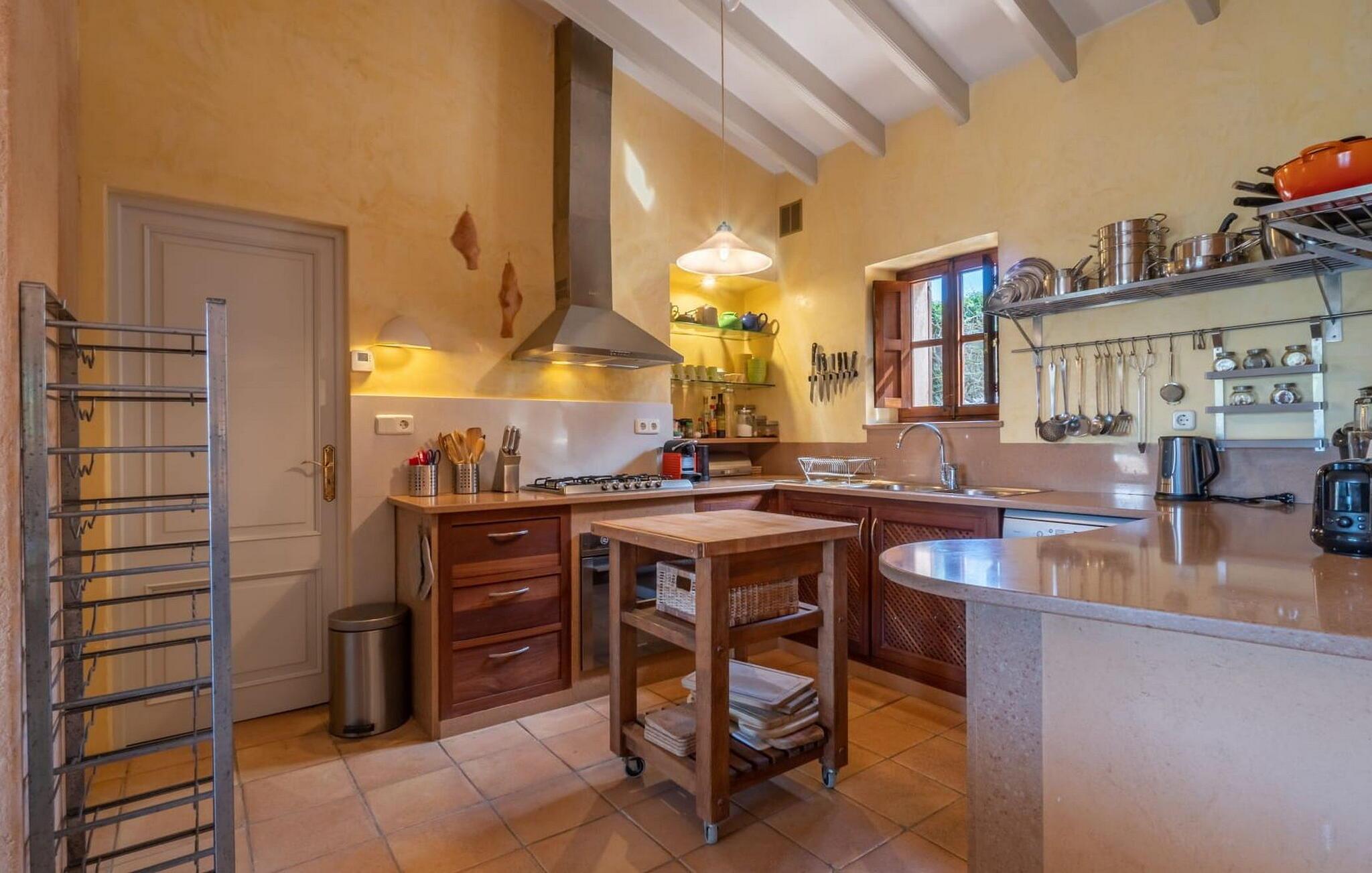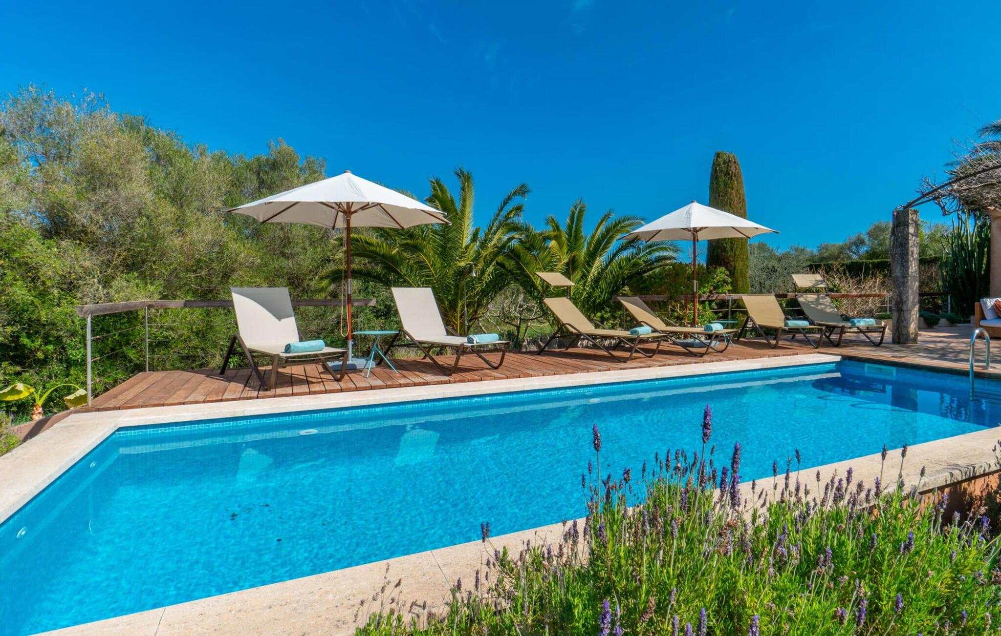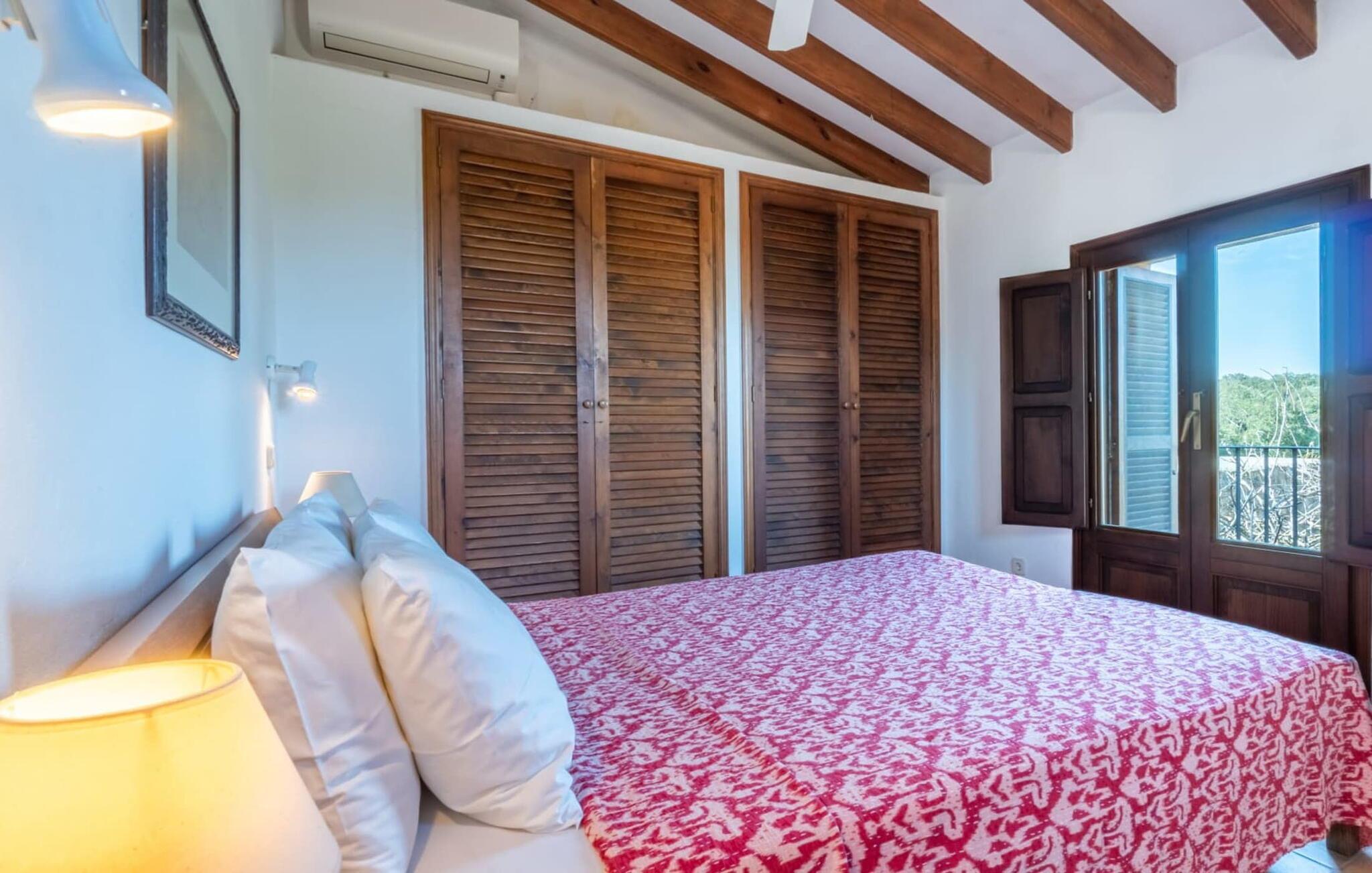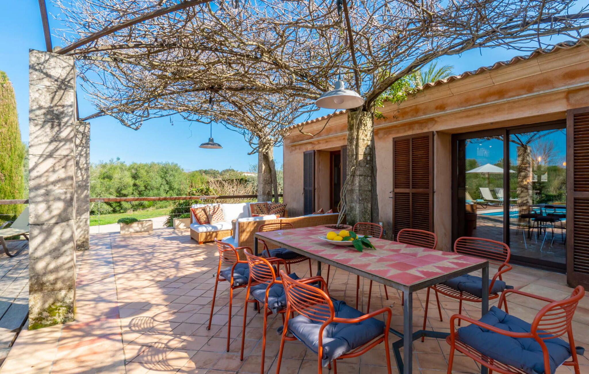 Rustikal und charmant liegt die Villa „Casa Alma“ eingebettet in die traumhafte Landschaft der Ostseite der Insel. Das typisch mallorquinische Haus steht auf einem 7.000 m² großen Grundstück in absolut ruhiger Lage nur 2 km südlich der Stadt Artà. Es ist von ausgedehnten Oliven- und Mandelbäumen umgeben und sein authentischer Landhausstil passt perfekt zur lokalen Inselumgebung. Umgeben von einem großen, naturbelassenen Garten verfügt dieses Ferienhaus über 300 m² abwechslungsreiche Terrassen, die an der Nordseite des Gebäudes einen Pool beherbergen. Dieser ist leicht erhöht und von einer schönen Holzterrasse (mit Geländer) umschlossen. Es sieht aus wie ein hübsches Sonnendeck an Bord. Zum Haus hin geht die Holzoberfläche in Stein über, der sich über die gesamte Breite des Grundstücks erstreckt. Unter einer Weinlaube befindet sich ein gemütlicher Esstisch, der ideale Ort zum gemeinsamen Essen. Es gibt auch einen soliden gemauerten Außengrill, sodass Sie Ihr Abendessen im Freien genießen können. Was gibt es Schöneres als eine laue Sommernacht auf Mallorca?