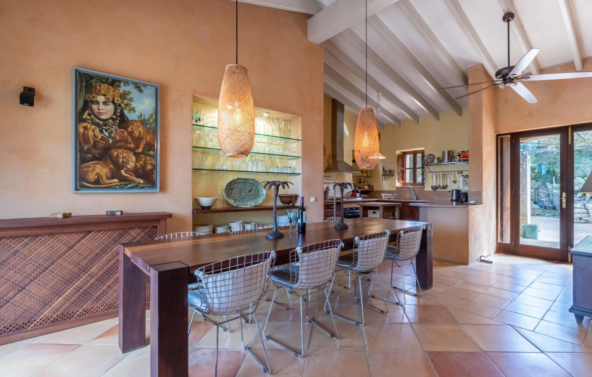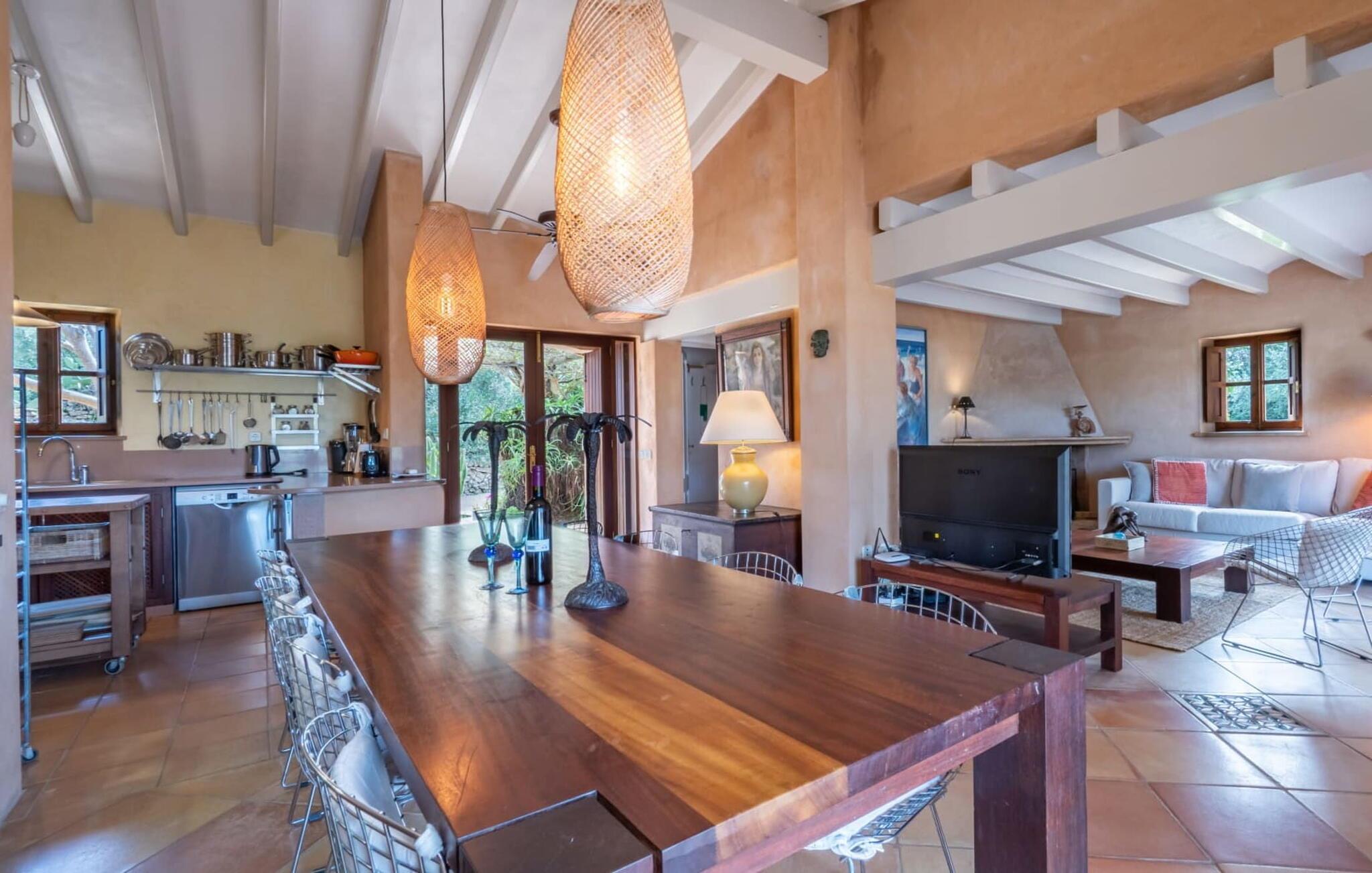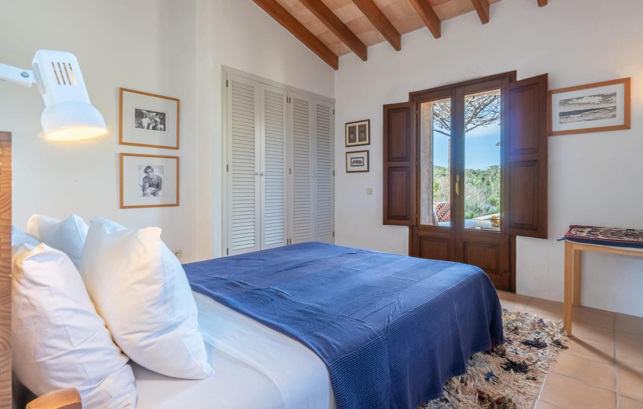 Ein in die Wand eingebautes Glasregal, Messingfiguren, chinesische Wandteller, Natursteinversätze, ästhetische Möbel – all diese Details und mehr spiegeln den gekonnten Stil wider, mit dem diese Villa dekoriert ist. Das Anwesen wurde von einem auf der Baleareninsel Formentera lebenden Architekten entworfen und gebaut und hat mit viel Liebe zum Detail dieses kleine Stück Paradies zum Leben erweckt. Das macht jeden Aufenthalt hier zu einem besonderen Erlebnis. Durch große Glastüren öffnet sich die Terrasse in den riesigen Wohnbereich des Hauses, während sich der eigentliche Eingangsbereich auf der Südseite des Grundstücks befindet. Der Wohnraum verbindet die offene Küche mit einem Essbereich und einer großen Sofaecke im arabischen Stil mit TV, CD-Player und Klimaanlage. Auch im Innenbereich ist der massive Tisch ein toller Ort für gemeinsames Essen. Die Küche ist selbstverständlich komplett ausgestattet mit einer Spülmaschine und einem großen Kühlschrank mit Gefrierfach. Hinter der Küche befindet sich ein übersichtlicher Hauswirtschaftsraum mit Waschmaschine. Vom offenen Wohnbereich gibt es einen direkten Zugang zu den drei Schlafbereichen, die sich im Erdgeschoss diametral gegenüberliegen und den Gästen ein hohes Maß an Privatsphäre bieten. Jedes dieser ruhigen Zimmer im Erdgeschoss besteht aus einem Doppelzimmer mit eigenem Bad en-suite. Der dritte Schlafbereich, ein weiteres Doppelzimmer mit Bad en-suite, befindet sich im Obergeschoss. Dieses hat eine Klimaanlage. Vom Wohnbereich führt die Treppe hinauf in die obere Ebene. Hervorheben möchten wir auch den außergewöhnlichen Preis pro Nacht, der angesichts des Gesamtstils der Villa hervorragend ist. Daher empfehlen wir dieses Haus für eine Familie mit Kindern (ab 6 Jahren), die bei einem strandnahen Urlaub auf Mallorca Wert auf hohe Qualität legen.