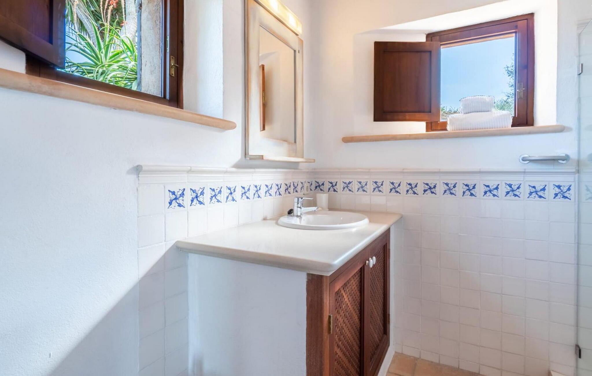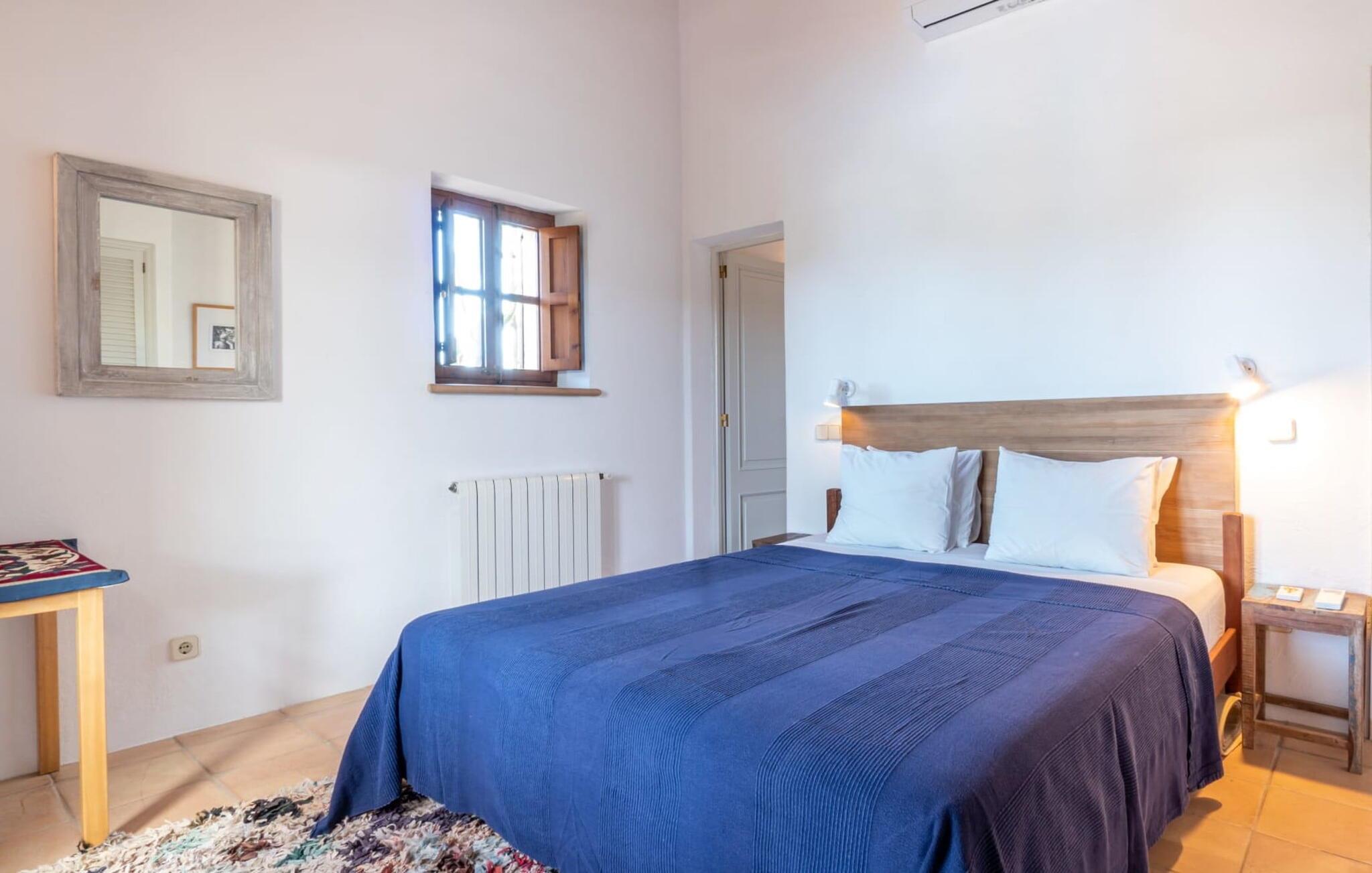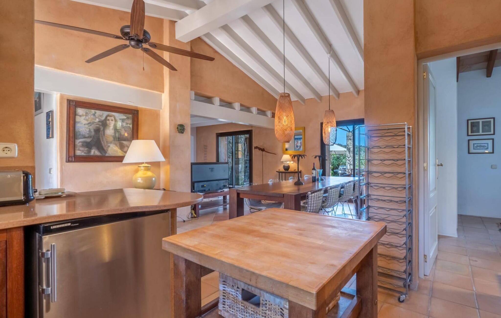 Ein in die Wand eingebautes Glasregal, Messingfiguren, chinesische Wandteller, Natursteinversätze, ästhetische Möbel – all diese Details und mehr spiegeln den gekonnten Stil wider, mit dem diese Villa dekoriert ist. Das Anwesen wurde von einem auf der Baleareninsel Formentera lebenden Architekten entworfen und gebaut und hat mit viel Liebe zum Detail dieses kleine Stück Paradies zum Leben erweckt. Das macht jeden Aufenthalt hier zu einem besonderen Erlebnis. Durch große Glastüren öffnet sich die Terrasse in den riesigen Wohnbereich des Hauses, während sich der eigentliche Eingangsbereich auf der Südseite des Grundstücks befindet. Der Wohnraum verbindet die offene Küche mit einem Essbereich und einer großen Sofaecke im arabischen Stil mit TV, CD-Player und Klimaanlage. Auch im Innenbereich ist der massive Tisch ein toller Ort für gemeinsames Essen. Die Küche ist selbstverständlich komplett ausgestattet mit einer Spülmaschine und einem großen Kühlschrank mit Gefrierfach. Hinter der Küche befindet sich ein übersichtlicher Hauswirtschaftsraum mit Waschmaschine. Vom offenen Wohnbereich gibt es einen direkten Zugang zu den drei Schlafbereichen, die sich im Erdgeschoss diametral gegenüberliegen und den Gästen ein hohes Maß an Privatsphäre bieten. Jedes dieser ruhigen Zimmer im Erdgeschoss besteht aus einem Doppelzimmer mit eigenem Bad en-suite. Der dritte Schlafbereich, ein weiteres Doppelzimmer mit Bad en-suite, befindet sich im Obergeschoss. Dieses hat eine Klimaanlage. Vom Wohnbereich führt die Treppe hinauf in die obere Ebene. Hervorheben möchten wir auch den außergewöhnlichen Preis pro Nacht, der angesichts des Gesamtstils der Villa hervorragend ist. Daher empfehlen wir dieses Haus für eine Familie mit Kindern (ab 6 Jahren), die bei einem strandnahen Urlaub auf Mallorca Wert auf hohe Qualität legen.