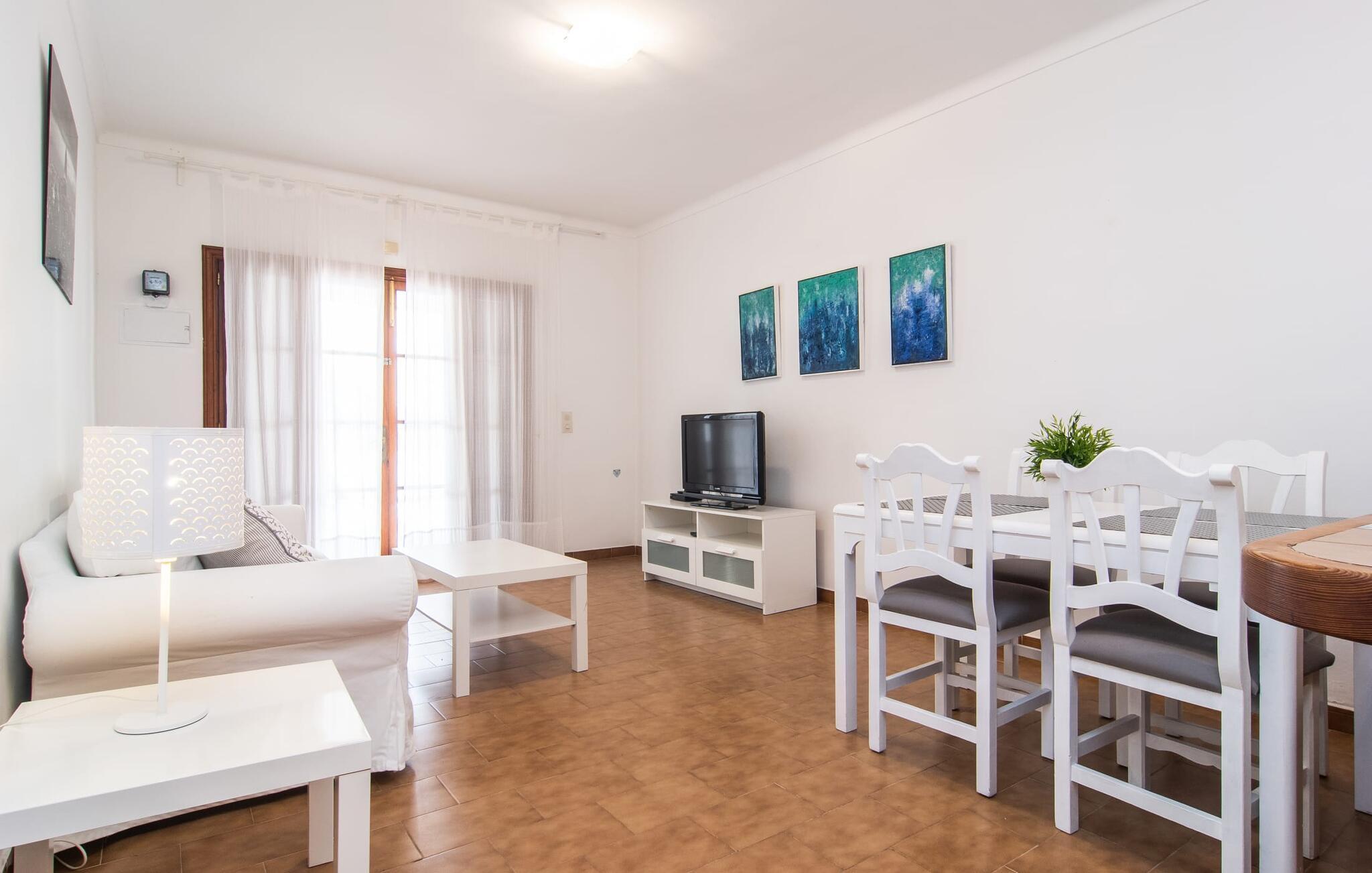Ein bodentiefes Fenster bildet den Übergang zwischen Außen und Innen und führt in den gefliesten Freiraum, in dem Wohnen, Essen und Kochen untergebracht sind. Sofa und Fernseher sind hier ebenso selbstverständlich wie ein Esstisch für Mahlzeiten im Innenbereich. Selbstverständlich ist auch drahtloses, schnelles Internet verfügbar. Helle Wände und Möbel sorgen in Kombination mit dekorativen Wandgemälden für ein freundliches Flair. Die praktische, voll ausgestattete Küche eignet sich perfekt für die Selbstversorgung während Ihres Urlaubs auf Mallorca. In den beiden gemütlichen Schlafzimmern, die jeweils mit einem Deckenventilator ausgestattet sind, können Sie gut schlafen. Ein Badezimmer mit Dusche rundet den Wohnkomfort in dieser Ferienwohnung auf unserer Lieblingsinsel ab. Das Ferienhaus „Casa Ángela II Terraza“ befindet sich in urbaner Lage am Rande des Stadtteils Es Pelats. Das Wohngebiet bietet Einkaufs- und Gastronomiemöglichkeiten in fußläufiger Entfernung. Die schöne Promenade und das Hafengebiet mit Cafés laden abends zum Bummeln ein. Hübsche Sandbuchten wie Cala Agulla oder Cala Gat sind mit dem Mietwagen in wenigen Minuten erreichbar. Cala Rajada bietet auch attraktive Aktivitäten wie Reiten oder Bootsfahrten.