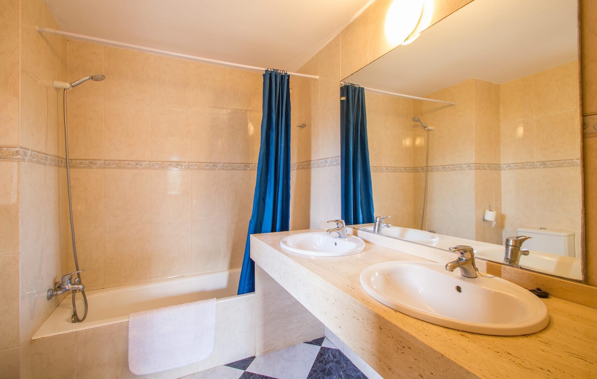 Der charmante und geschmackvoll eingerichtete Innenbereich erstreckt sich über großzügige 420 m². Im Erdgeschoss befindet sich der bis ins kleinste Detail liebevoll gestaltete Wohnbereich. Wenn Sie diese herrliche Casa von der Terrasse aus betreten, fällt Ihr Blick sofort auf den beeindruckend langen Esstisch aus Holz. Eine gemütliche Sofalandschaft inklusive großem Flachbildfernseher lädt zum Entspannen ein. Das offene Feuer hält Sie an kälteren Abenden warm und angenehm. Eine geschickte Mischung aus rustikalen Möbeln, modernen Gegenständen und mallorquinischen Akzenten haben „Casa Campillos“ in ein wahres Wohnparadies verwandelt. Ein besonderes Highlight dieser Villa ist die große, voll ausgestattete Küche, in der Sie die Feinheiten der mallorquinischen Küche entdecken und nach Herzenslust kreative Menüs zaubern können. Direkt hinter der Küche verbirgt sich ein Loungebereich mit gemütlichem Sofa und Kamin: der perfekte Ort zum gemeinsamen Beisammensein. Im Erdgeschoss befinden sich außerdem ein Gäste-WC sowie ein Schlafzimmer mit einem 1,35 m breiten Doppelbett, eigenem Bad und direktem Zugang zum Garten. Im ersten Stock finden Sie vier weitere geschmackvoll eingerichtete Schlafzimmer. Drei Doppelzimmer mit 1,35 m bzw. 1,50 m breiten Doppelbetten, eines davon auch mit eigenem Bad, sowie ein Schlafzimmer mit zwei Einzelbetten (90 x 190 cm) haben alle direkten Zugang zu einer hübschen Terrasse mit unglaublichem Ausblick die Landschaft. Die Zimmer im Obergeschoss teilen sich ein geräumiges Badezimmer mit großem Waschbecken und Badewanne. Um Schweißbildung in den Sommermonaten zu vermeiden, sind alle Schlafzimmer klimatisiert.
