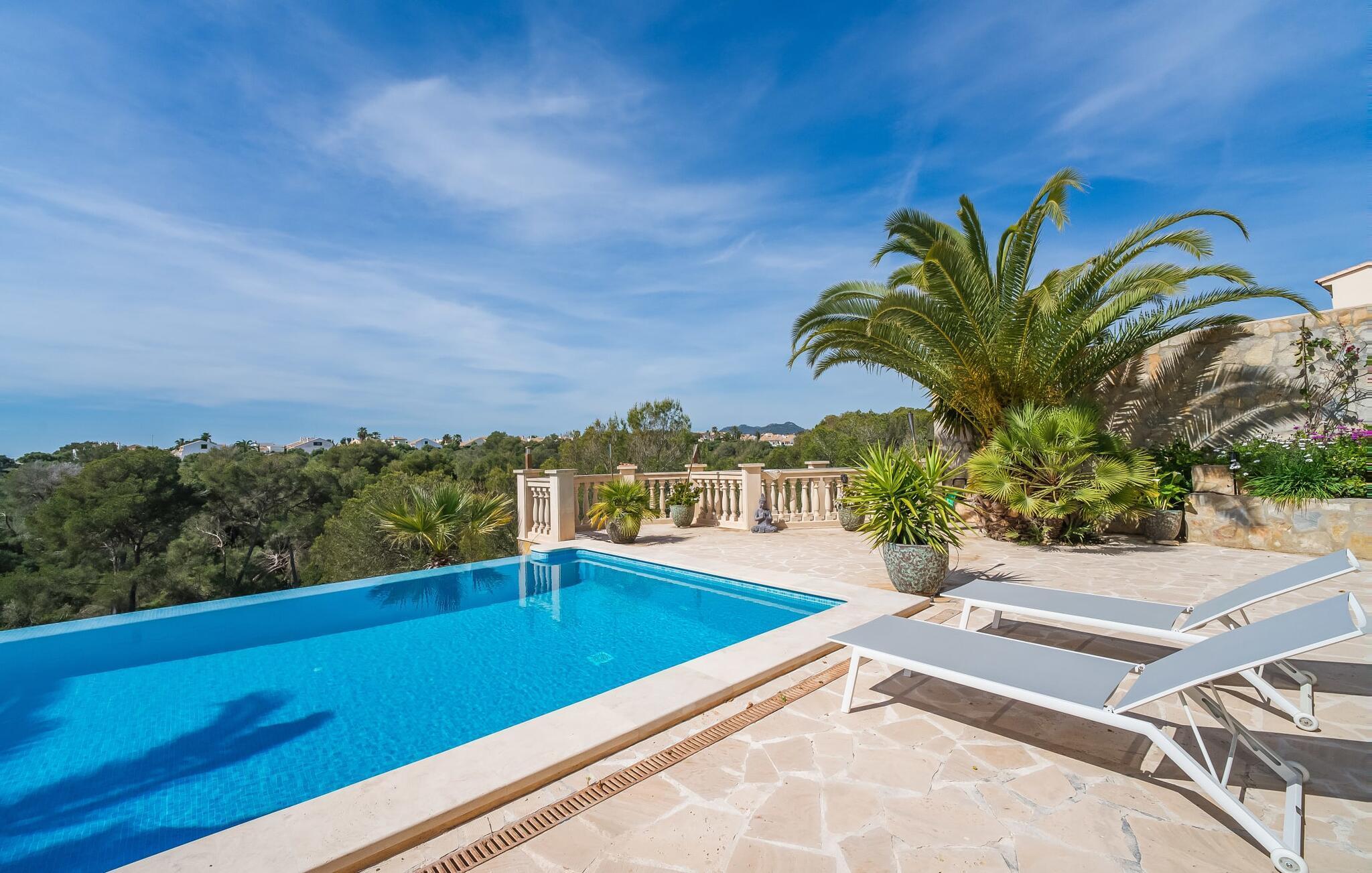 Erleben Sie das Paradies in der luxuriösen Villa „Casa Crefeld Vall d’Aran 21“. Dieses atemberaubende Anwesen verfügt über einen wunderschön gestalteten Außenbereich, der mallorquinischen Luxus verkörpert, komplett mit Palmen und atemberaubender Aussicht.