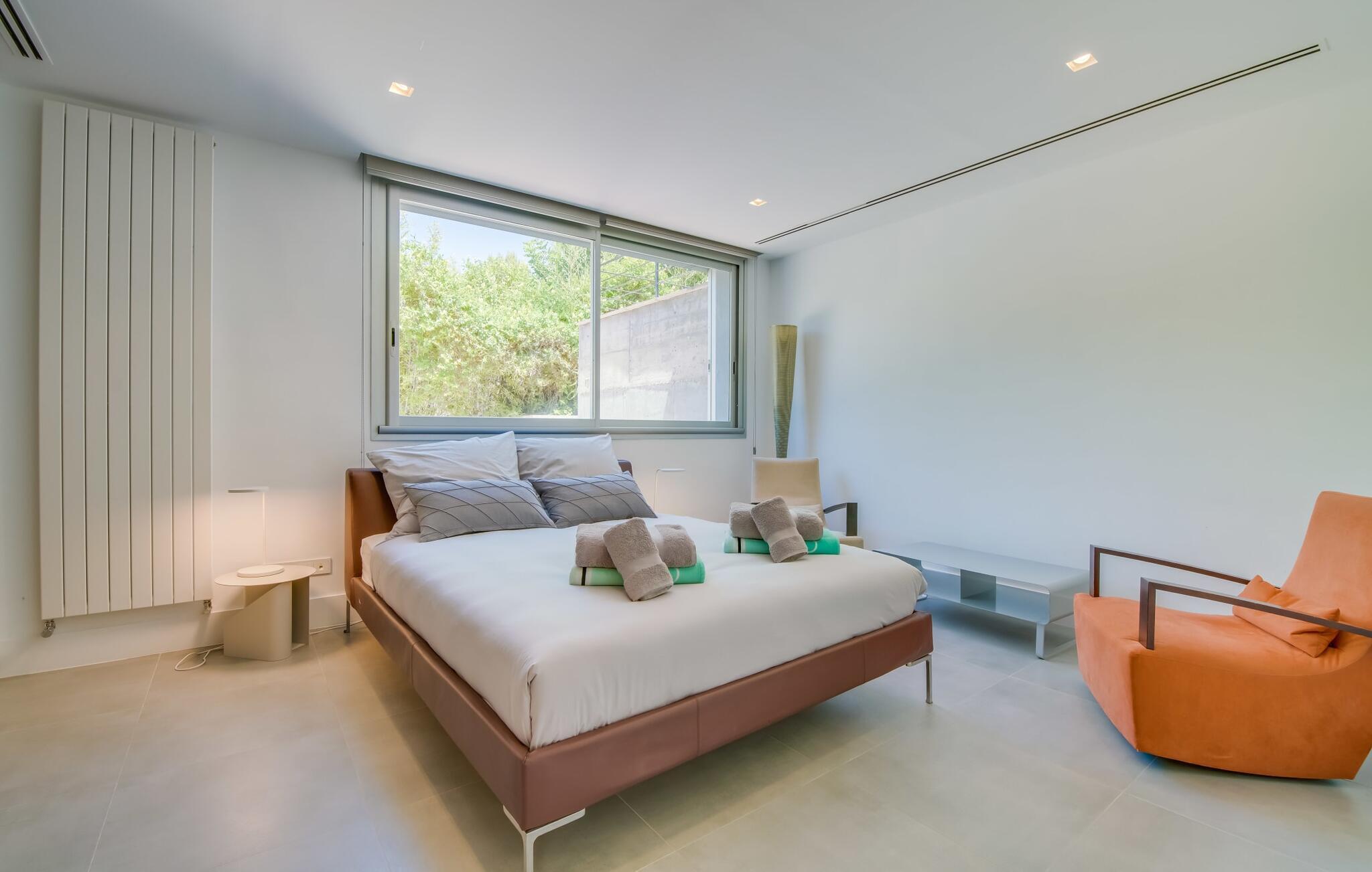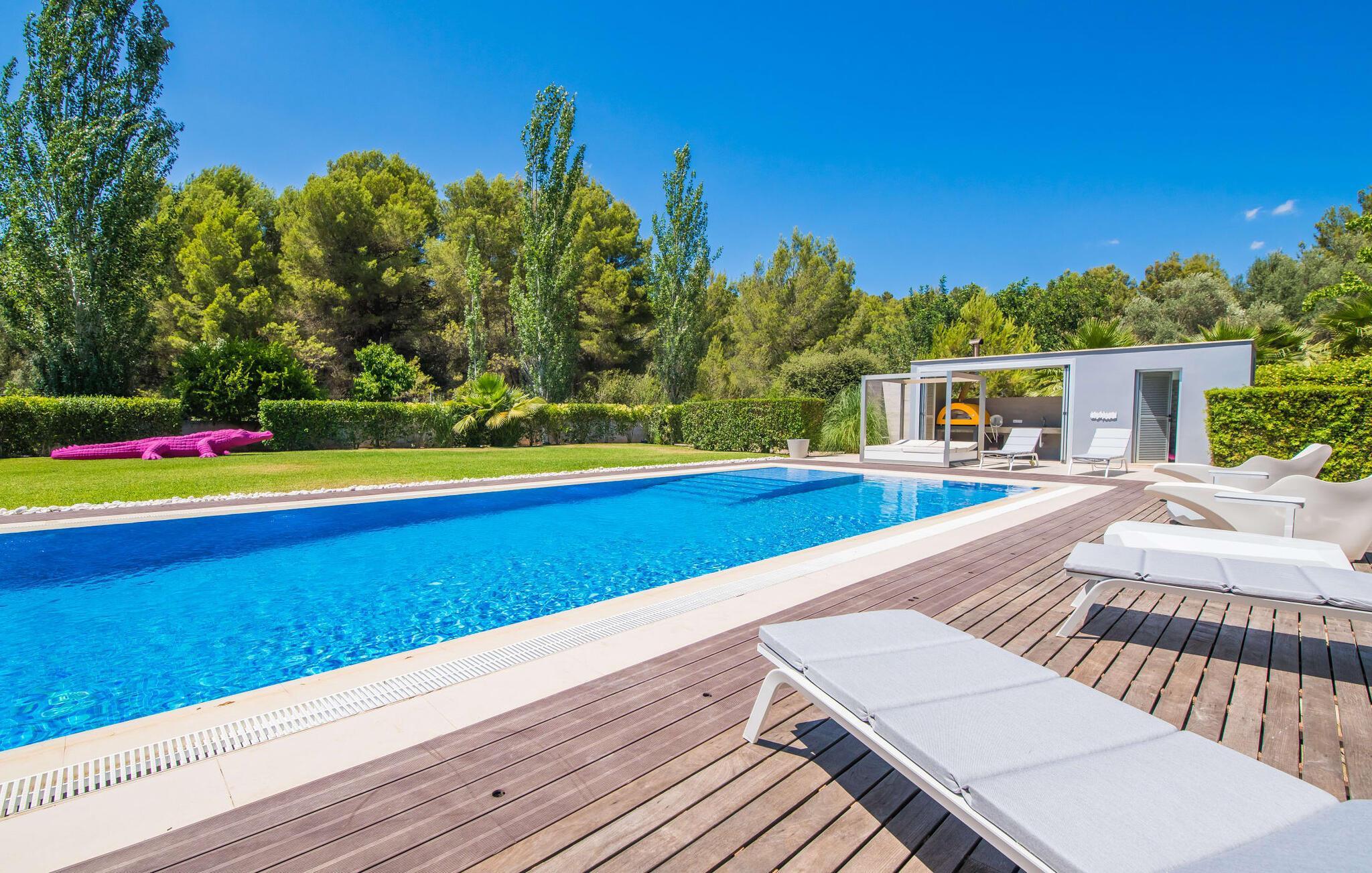 Überzeugend am „Casa Croc“ ist außerdem die absolut stimmige Design- und Architekturlinie, die sich auch im Innendesign dokumentiert. Bis ins kleinste Detail. Von den Dekorationsgegenständen über die Möbel im offenen Wohn- und Esszimmer bis hin zur durch eine Glasscheibe abgetrennten Gaggenau-Küche – alles ist absolut hochwertig und der innovativen Designlinie treu. Bei der hochwertigen Vollausstattung wird jeder (Hobby-)Koch aus Leidenschaft das Herz höher schlagen lassen. Farben spielen bei der Gestaltung eine große Rolle, ohne dass das Interieur zu bunt, sondern angenehm lebendig und ausgesprochen fröhlich wirkt. Sie erleben also keine Reizüberflutung, sondern einfach ein super Ferienhaus mit mallorquinischen Wurzeln, das absolut ausgewogen wirkt. Das gilt natürlich auch für die vier fantastischen, klimatisierten Schlafzimmer und die drei individuellen Innenbäder mit begehbarer Dusche oder freistehender Badewanne. Die entspannte Atmosphäre färbt ab und ermöglicht es Ihnen, mit einer weiteren Familie oder Freunden – insgesamt bis zu acht (erwachsenen) Personen – einen erstklassigen Urlaub zu genießen – mit einem exklusiven Gefühl von gestalterischer Raffinesse und Top-Lage. Mehr geht nicht! Das ausdrucksstarke Bauernhaus „Casa Croc“ beweist, dass Design und Familienfreundlichkeit kein Widerspruch sein müssen. Der abwechslungsreich gestaltete Außenbereich mit Pool, Terrassen, Außenküche und Bad ist trotz der Lage innerhalb einer Urbanisation mit ausschließlich Wohnverkehr angenehm privat. Zum Einkaufen können Sie in das hügelige Dorf Bunyola in den Bergen fahren. Zwischen Bergen und Meer genießen Sie die Nähe zur Inselhauptstadt Palma und damit auch zu den Stränden der Westküste wie dem Passeig del Molinar. Beide sind etwa 25 Autominuten entfernt.