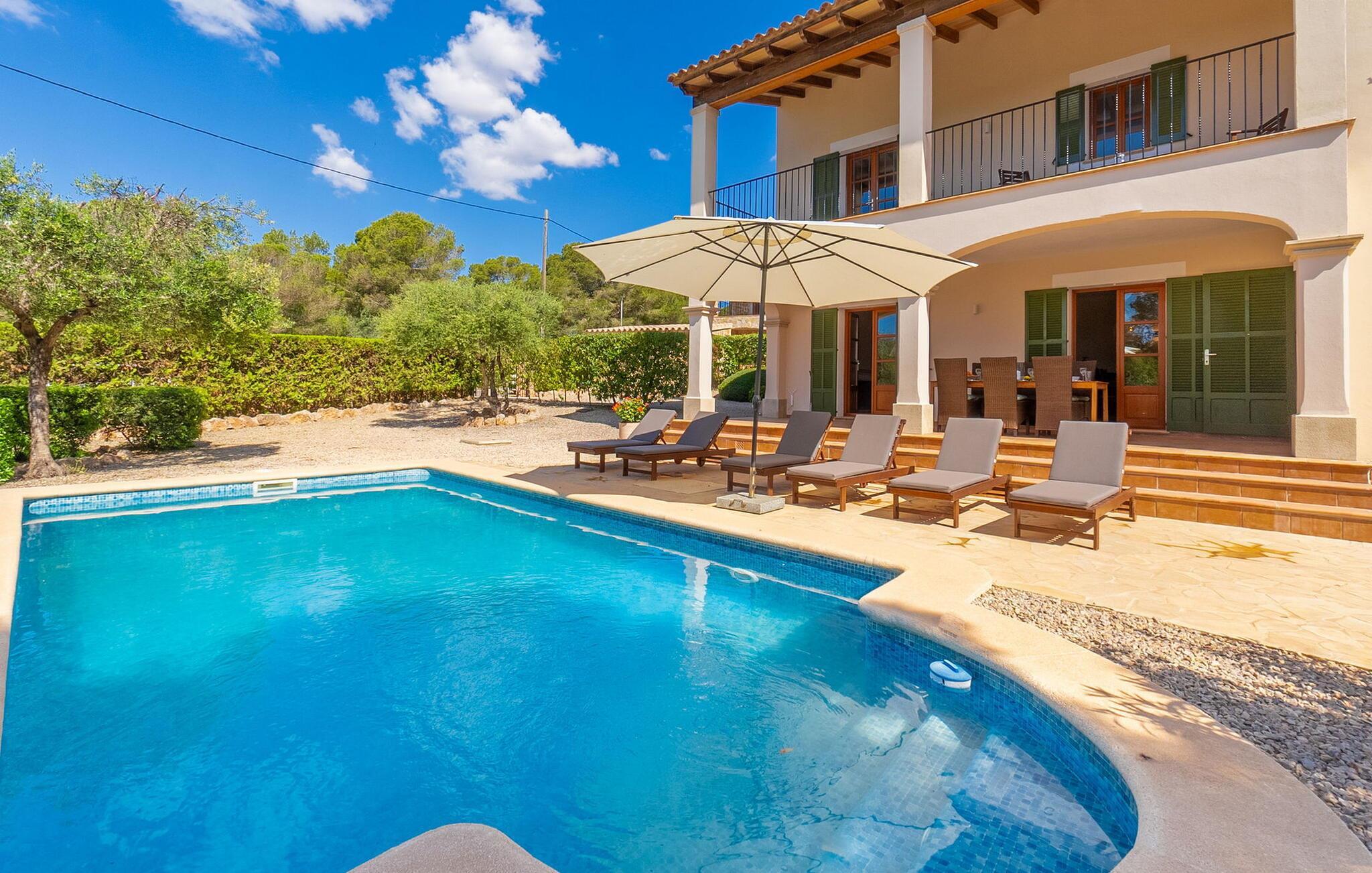 Die Villa „Casa Ferie“ an der Südküste Mallorcas wurde kürzlich von den Eigentümern der Nachbarvilla „Clafé“ innen und außen renoviert und aufgewertet. Weitläufige Sitzbereiche im Freien bieten einen atemberaubenden Meerblick und bilden einen lebendigen Kontrast zum tiefblauen Himmel. Der mit mediterranen Pflanzen geschmückte Außenbereich wurde neu gestaltet und verfügt nun über Kies, Fliesen und Naturstein. Im Gartenbereich wurden neue Hecken gepflanzt. Darüber hinaus wurden ein neuer Steingarten, ein Außengrill mit Weg und eine Außendusche hinzugefügt. Von der charmanten, mit Säulen geschmückten Veranda mit Meerblick und einem Essbereich im Freien genießen Sie einen tollen Blick auf den 28 m² großen Pool und die nach Süden ausgerichtete Sonnenterrasse. Bequeme Liegen und ein großer Sonnenschirm laden zum Entspannen ein. Auf gleicher Grundfläche, eine Etage höher, ist der Meerblick noch exklusiver. Auch diese Etage bietet schöne Sitzmöbel. Auf der Ostseite des Hauses befindet sich ein weiterer Balkon.