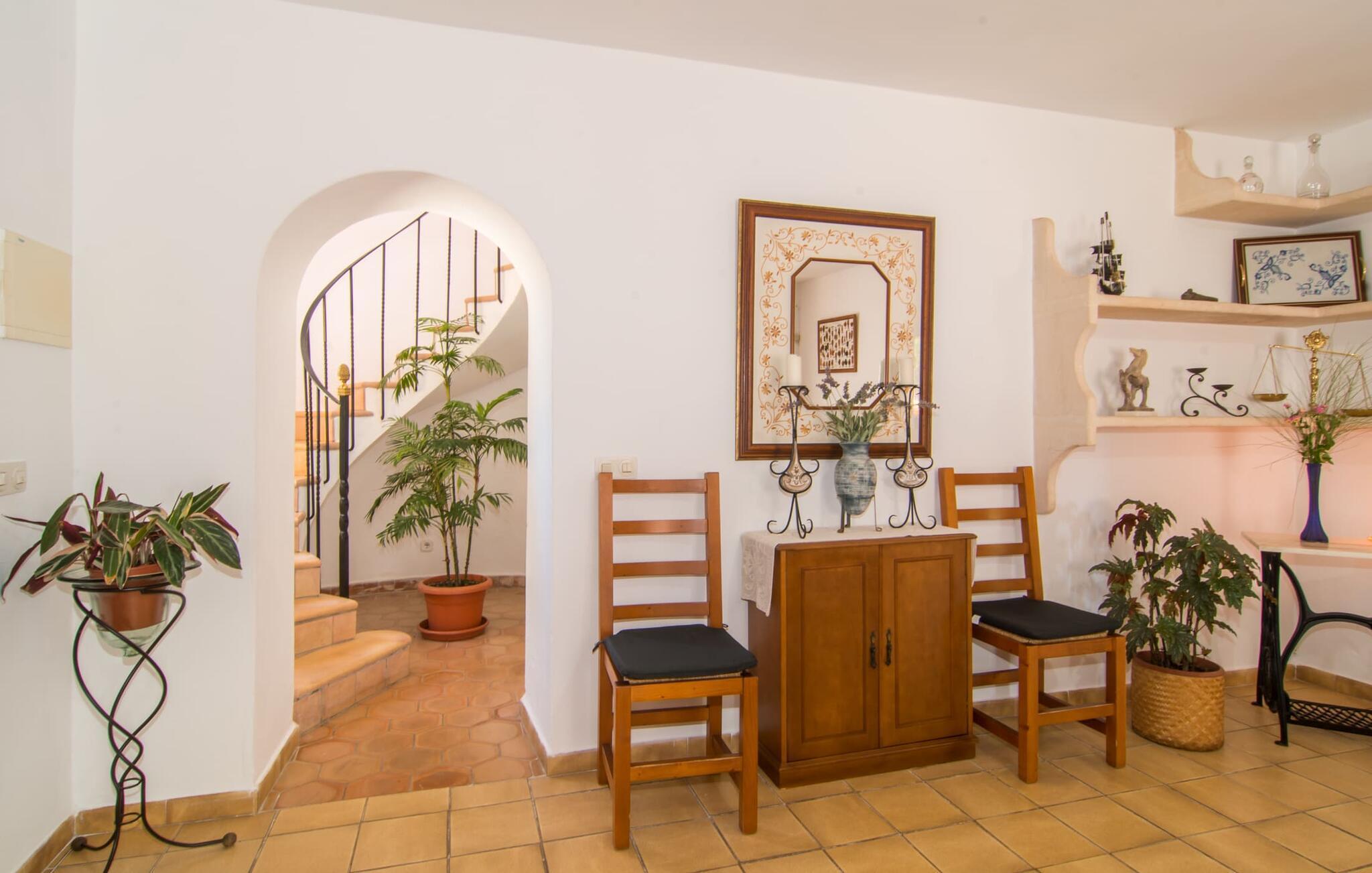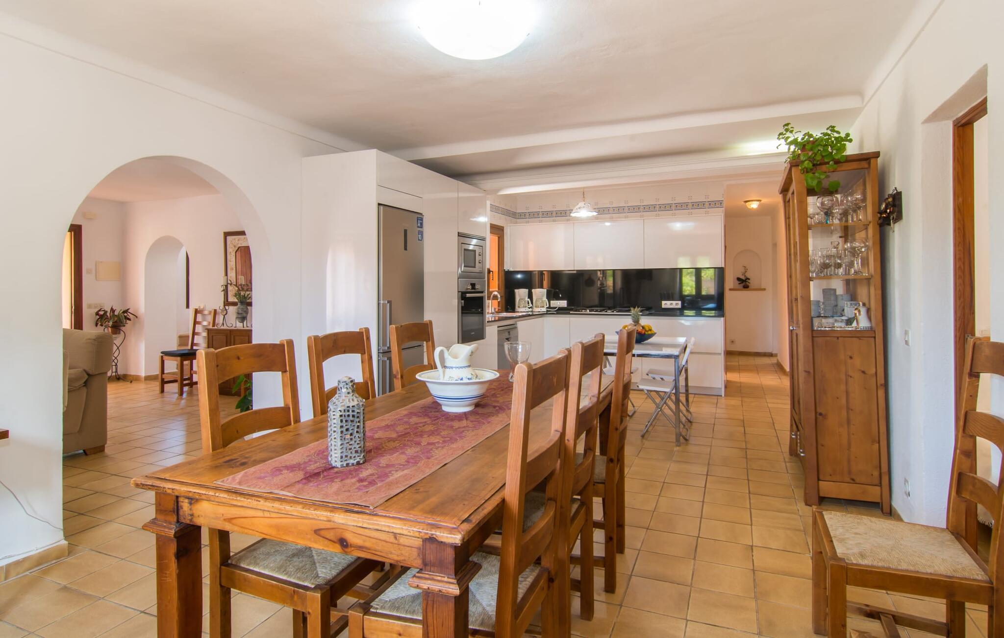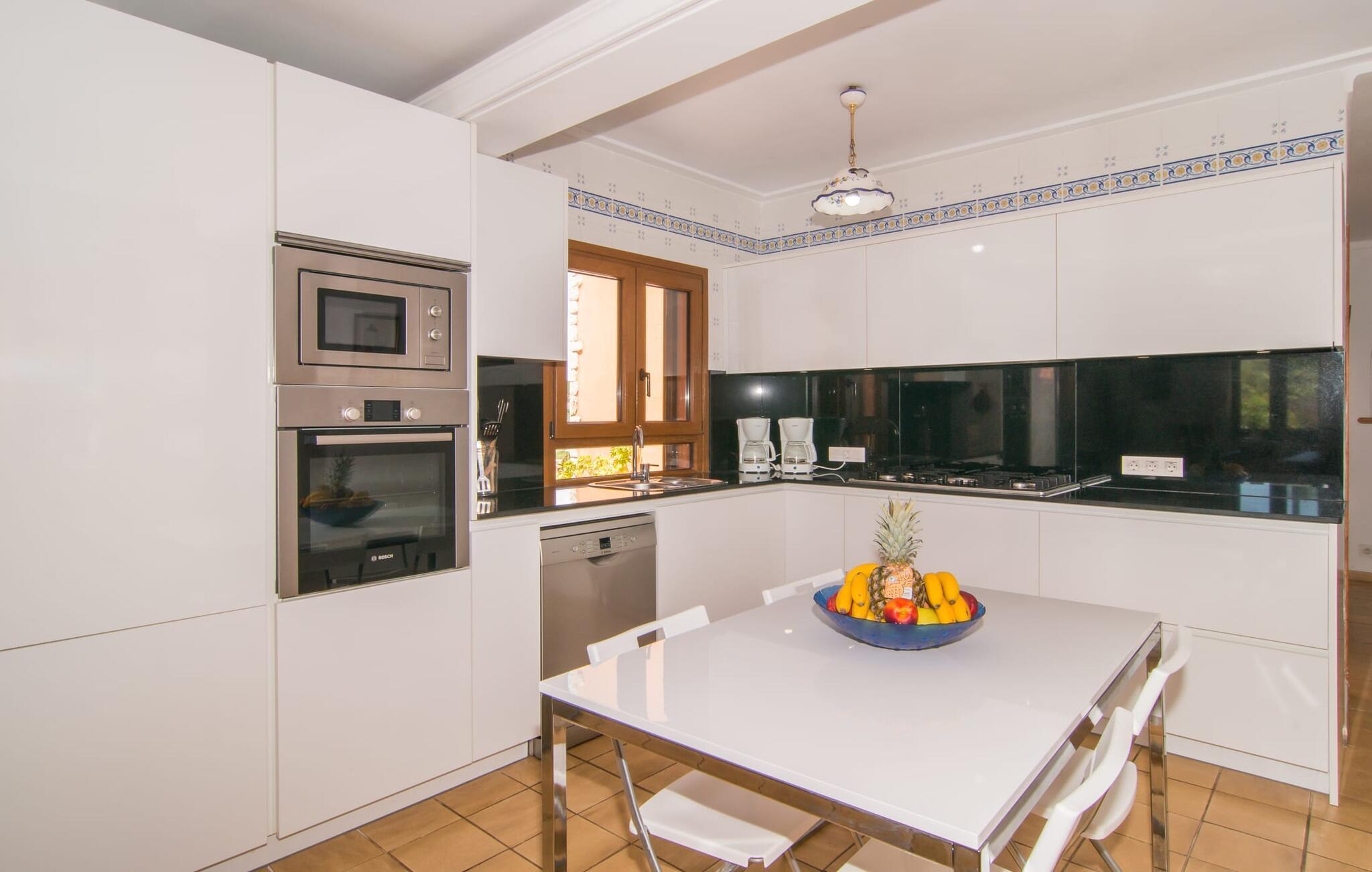 Ihre elegant-komfortable Villa „Casa Fina“ in warmer Sandsteinoptik kann getrost zu den Landsitzarten gezählt werden. Mit seinem Turm versprüht es den typisch mallorquinischen Charme. Zum Haus führt eine gepflegte Auffahrt, vor der bequem mehrere Autos geparkt werden können. Auf der anderen Seite erstreckt sich der weitläufige, liebevoll angelegte Garten mit Pool. Umgeben von Orangenbäumen und Palmen können Sie auf der Sonnenliege oder den bequemen Kissen rund um den Pool herrlich entspannen. Entspannen Sie sich auf der luftigen, schattigen Terrasse am Haus, auf der leuchtend lilafarbene Bougainvilleen wachsen, oder spielen Sie eine Partie Tischtennis. Die gemütliche Außenküche mit Grill und großem Esstisch ist in einem kleinen, offenen Steinhäuschen untergebracht und eignet sich hervorragend zum Grillen an herrlich lauen, nicht enden wollenden Sommerabenden.