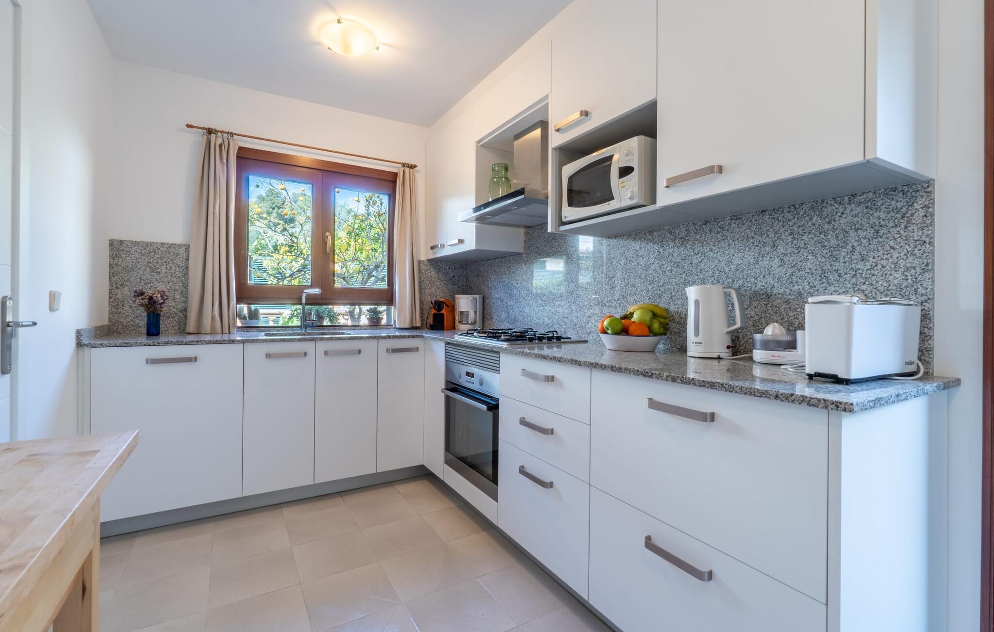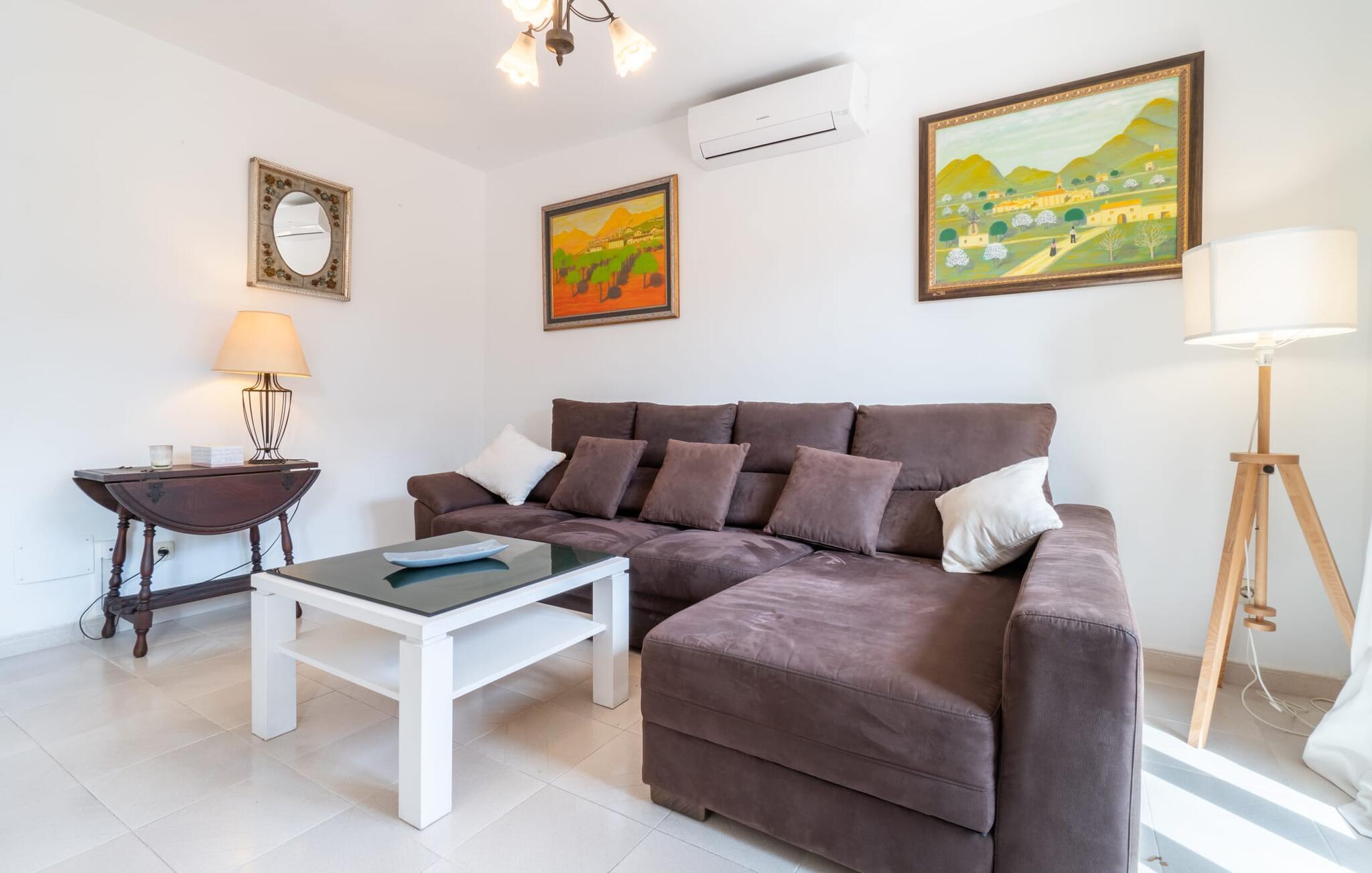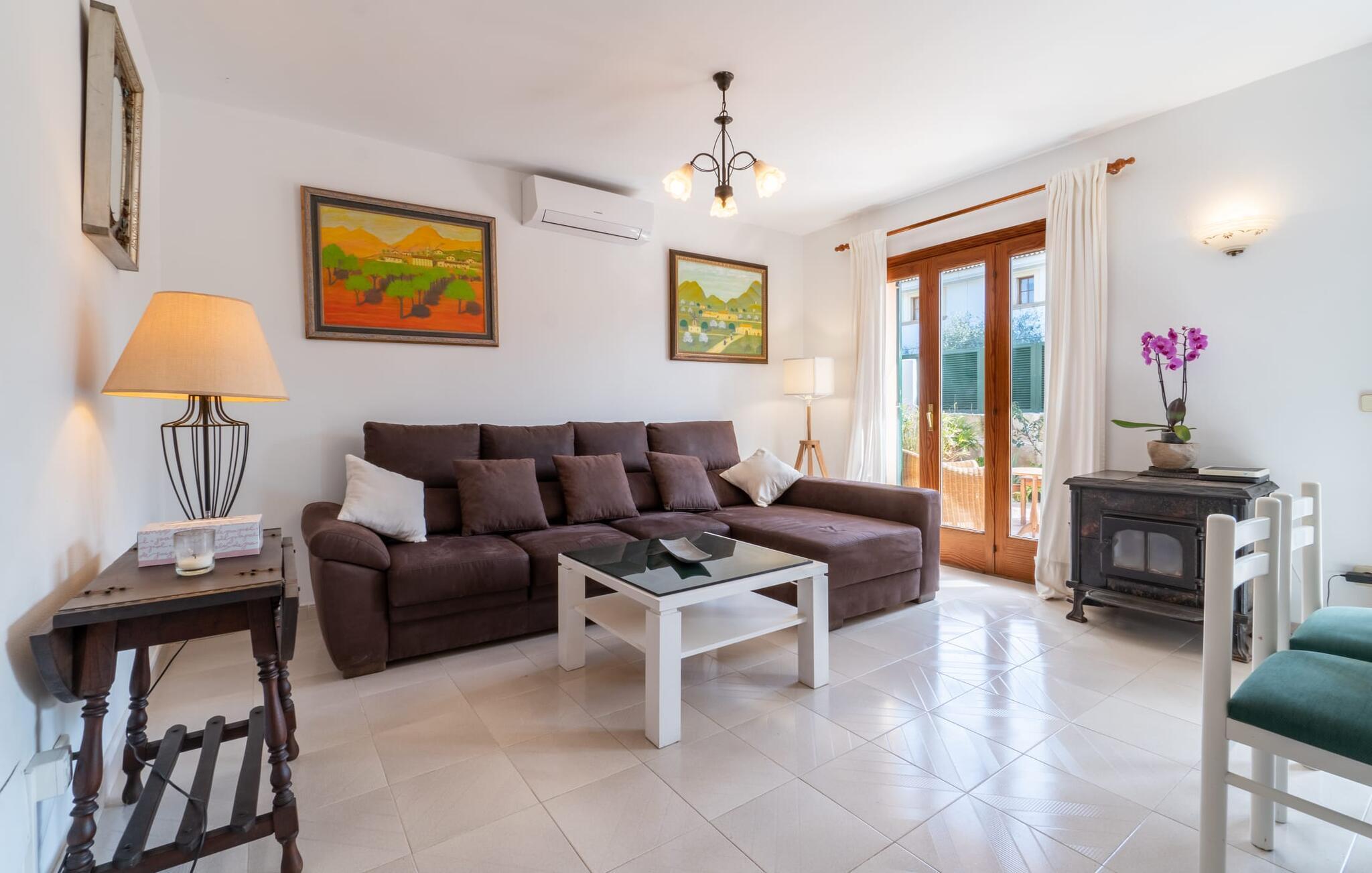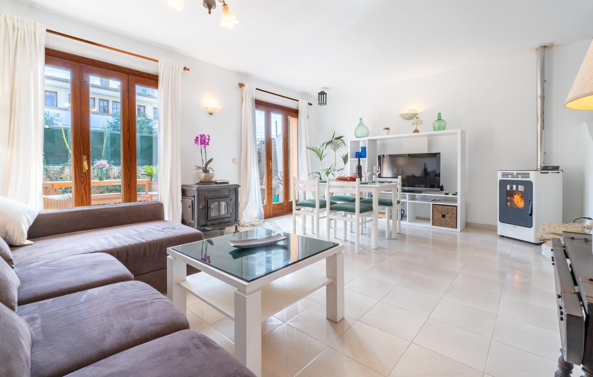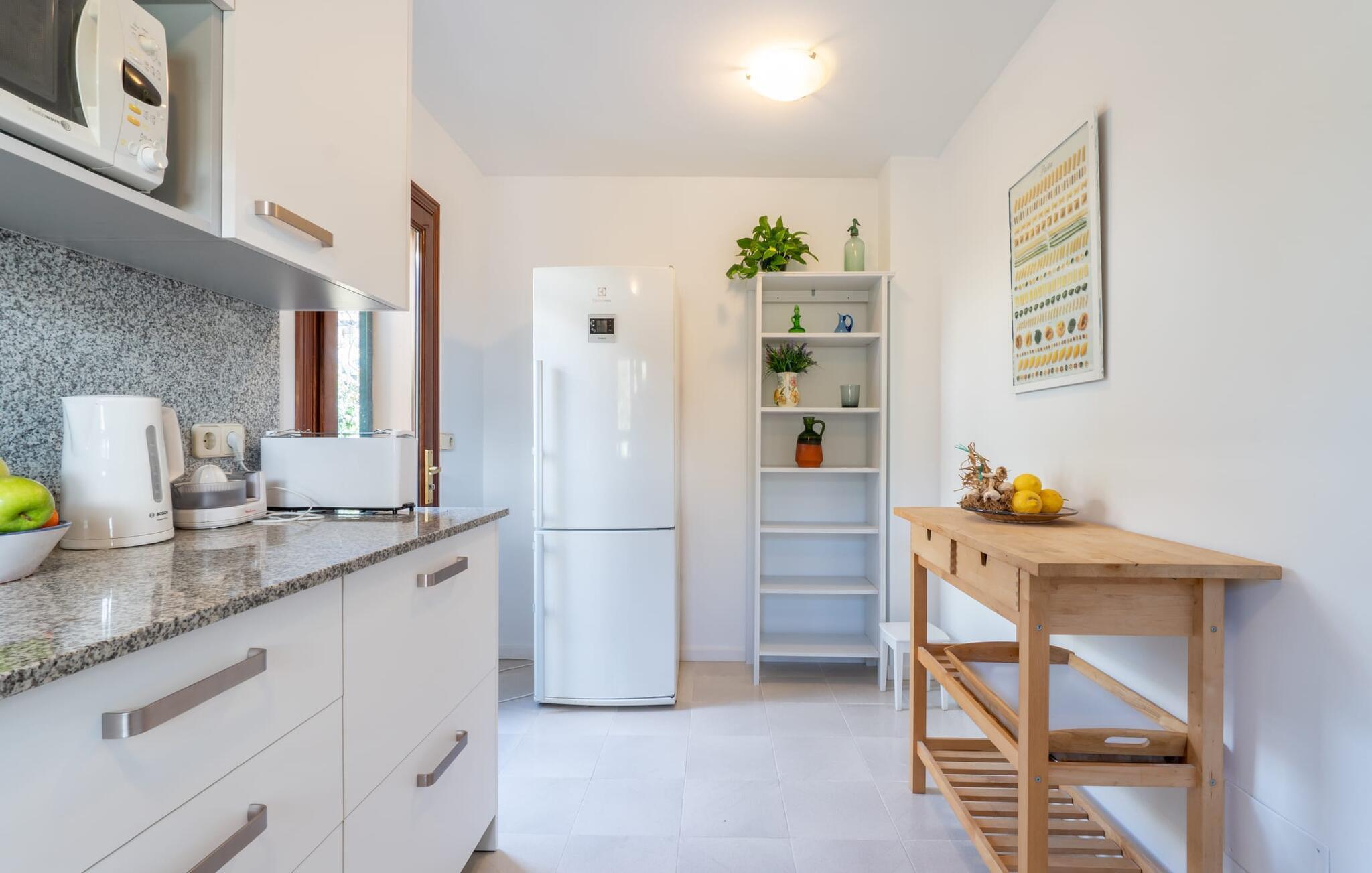 Im Inneren verbindet das geräumige Wohnzimmer Fliesenböden mit hellen, weißen Wänden und schafft eine frische, luftige Atmosphäre. Ein bequemes Sofa, mehrere von der Natur inspirierte Gemälde, ein Panoramafernseher und ein Kamin tragen zum Komfort bei, während sich die großen französischen Türen öffnen lassen, um den Raum mit Licht zu füllen. Die voll ausgestattete Küche ist ideal für Selbstversorger. Im Obergeschoss befinden sich zwei Schlafzimmer mit Doppelbett und ein kleines Zimmer mit Balkon, ideal als Kinderzimmer. "Casa Ginebro" bietet sowohl Komfort als auch Charakter für einen erholsamen Urlaub.