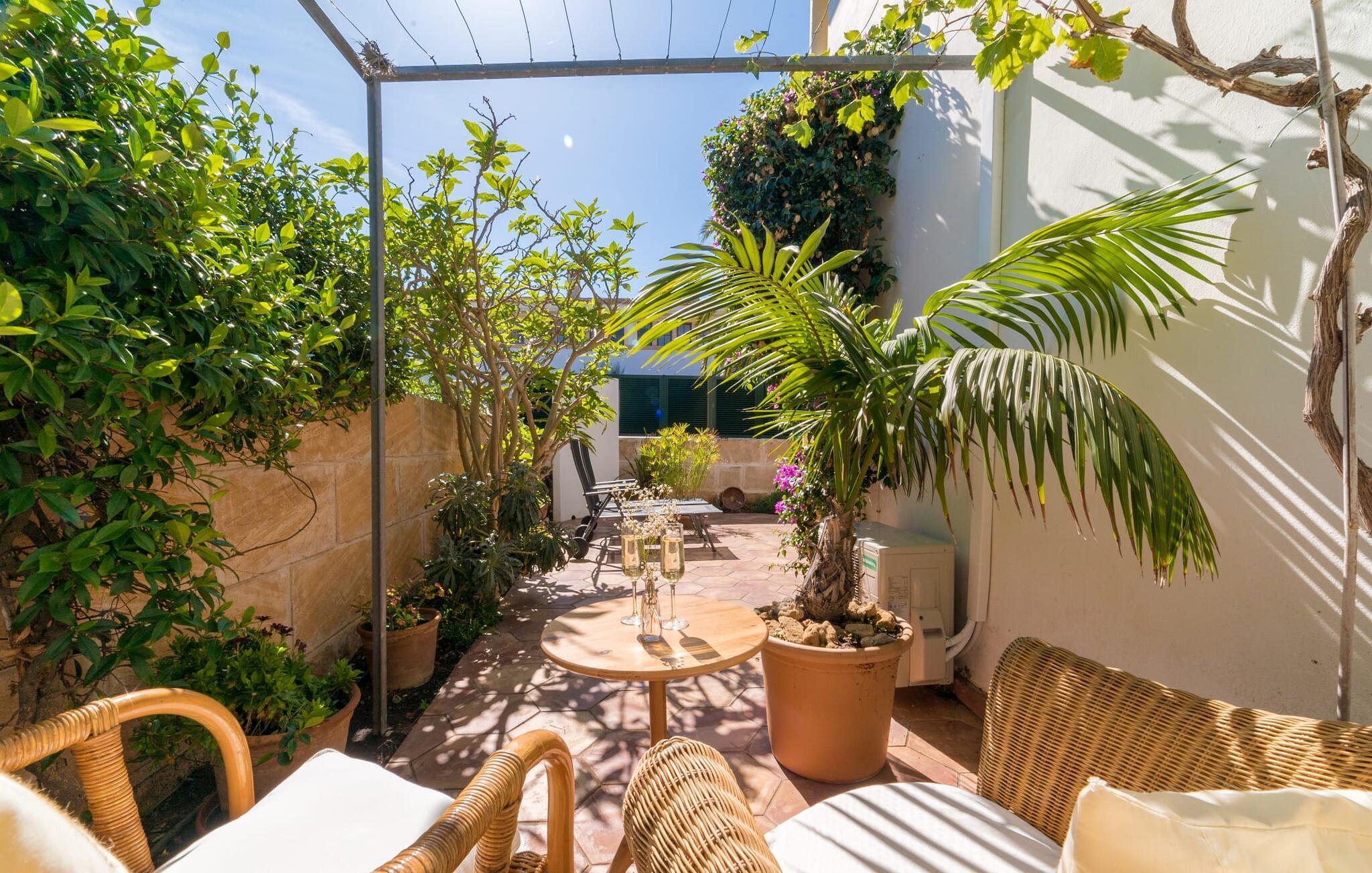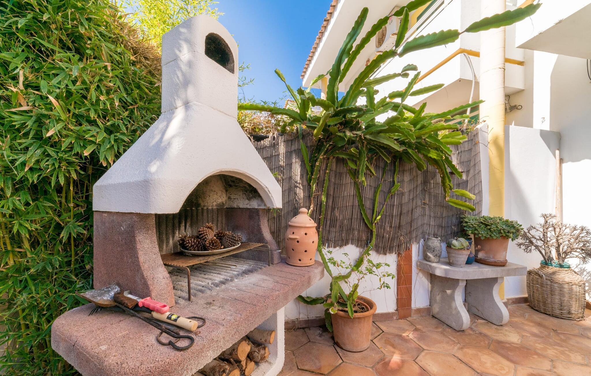 Eine Steinbank und zwei blaue Liegen, umgeben von Topfpflanzen und Kakteen, bieten ein ruhiges Plätzchen im Schatten, um den Duft frischer Zitronen zu genießen. Auf der Rückseite des Hauses befindet sich eine charmante Terrasse im Innenhofstil mit einem Esstisch mit Holzbänken sowie einem gemauerten Grill für perfekte Abende unter freiem Himmel. Grüne Fensterläden, eine gelb-weiße Fassade und Korbstühle unter einer Pergola runden den mediterranen Charme ab. Nach einem Tag am Strand können Sie sich in der privaten Außendusche abspülen und die Seele baumeln lassen.