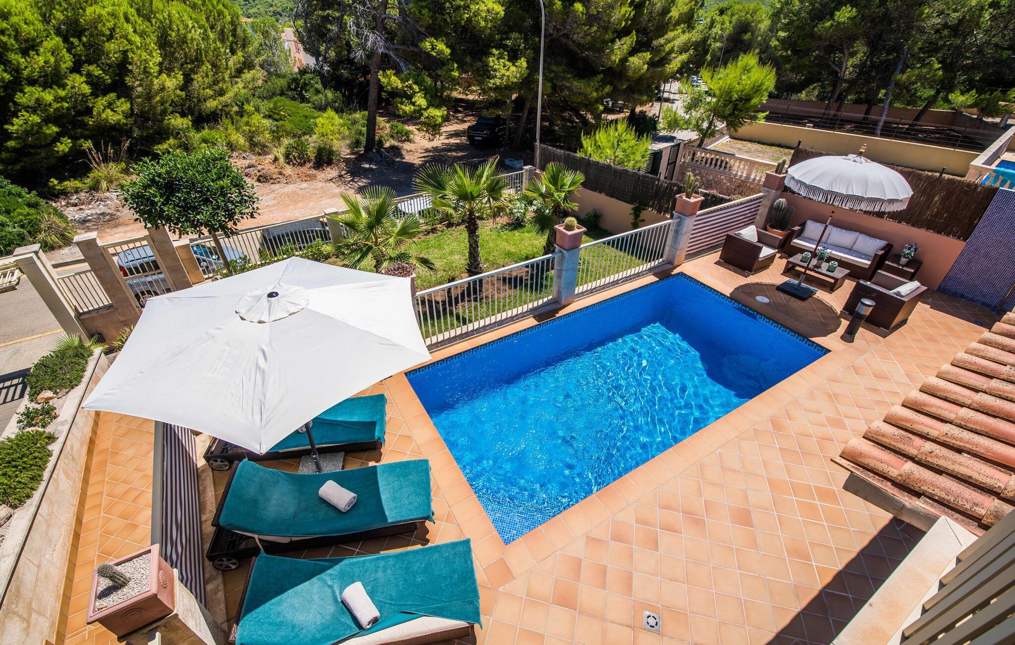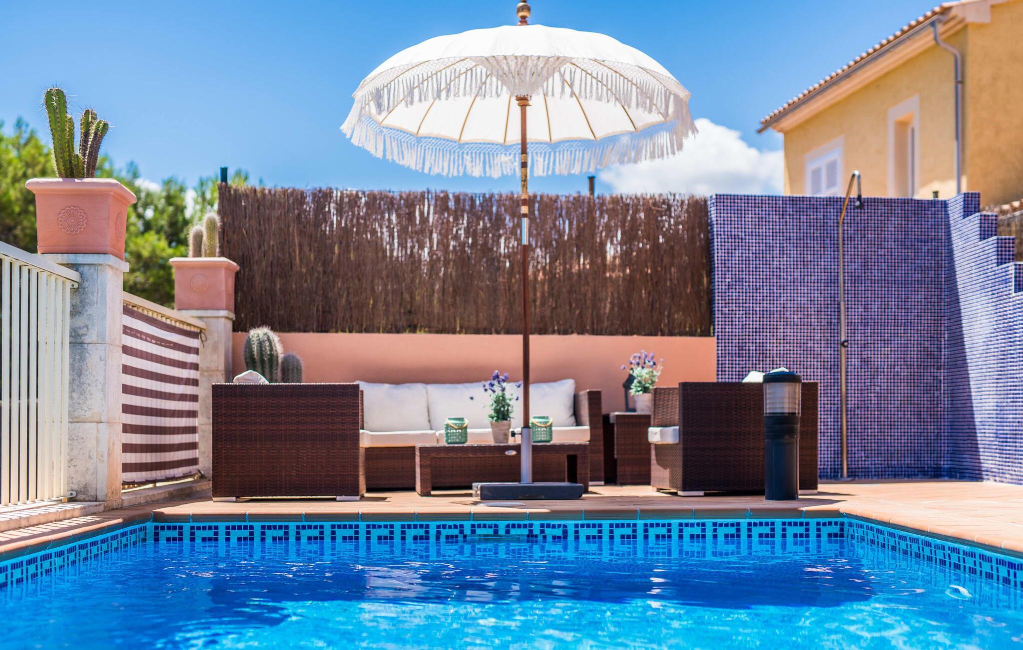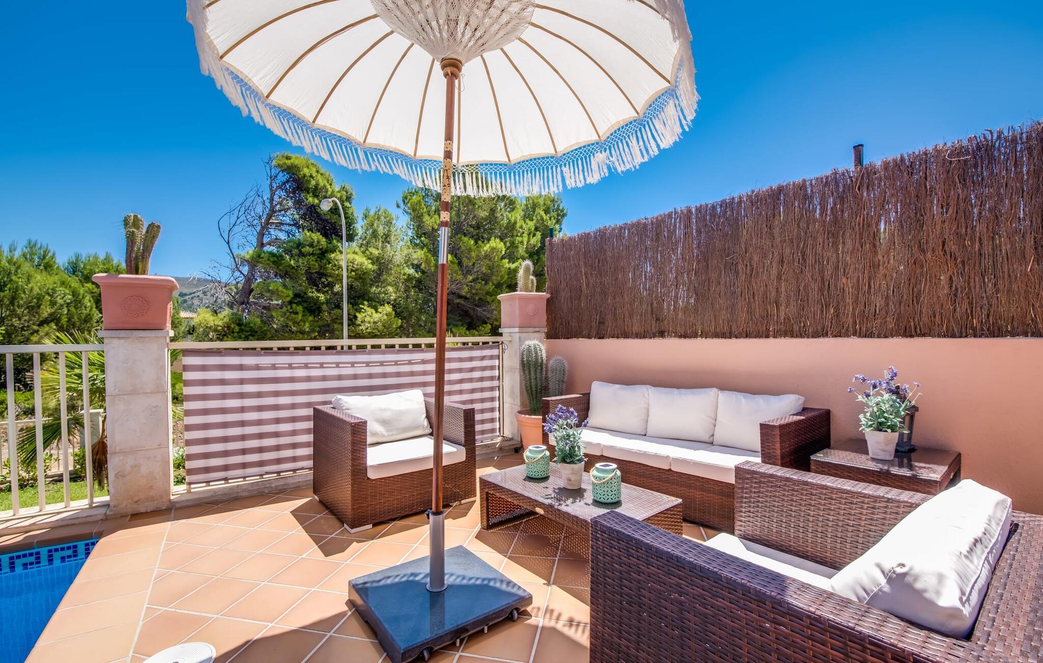 Ein Urlaub zwischen Meer und Bergen – wo sonst als auf Mallorca gibt es das? Die terrakottafarbene Villa mit der weißen Persiana versprüht den maritimen Charme eines ganz besonderen Ferienhauses auf unserer Lieblingsinsel. Der herrliche Ausblick auf die Llevant-Berge und die gleichzeitigen sanften Überschwemmungen an der Cala Mesquida zeichnen die Lage aus. Auch der Außenbereich der zweistöckigen Villa im Osten der Insel nahe Capdepera und Cala Ratjada überzeugt durch seine grüne Vielseitigkeit. Da weniger Nachbarn vorhanden sind, ist das gesamte Anwesen wunderbar privat, sodass Sie das luxuriös gestaltete Grundstück mit gefliestem Außenpool, Sonnenterrasse, Lounge und Liegen sowie dem völlig sichtgeschützten Whirlpool in aller Ruhe genießen können. Ein Grill und eine überdachte Terrasse auf der Veranda des familienfreundlichen modernen Ferienhauses mit maritimem Charakter runden das Verwöhnprogramm ab. Die hübschen Palmen und der mallorquinische Zierbrunnen sind nur einige der Details, die dieser exquisiten mallorquinischen Villa ihren Esprit verleihen.