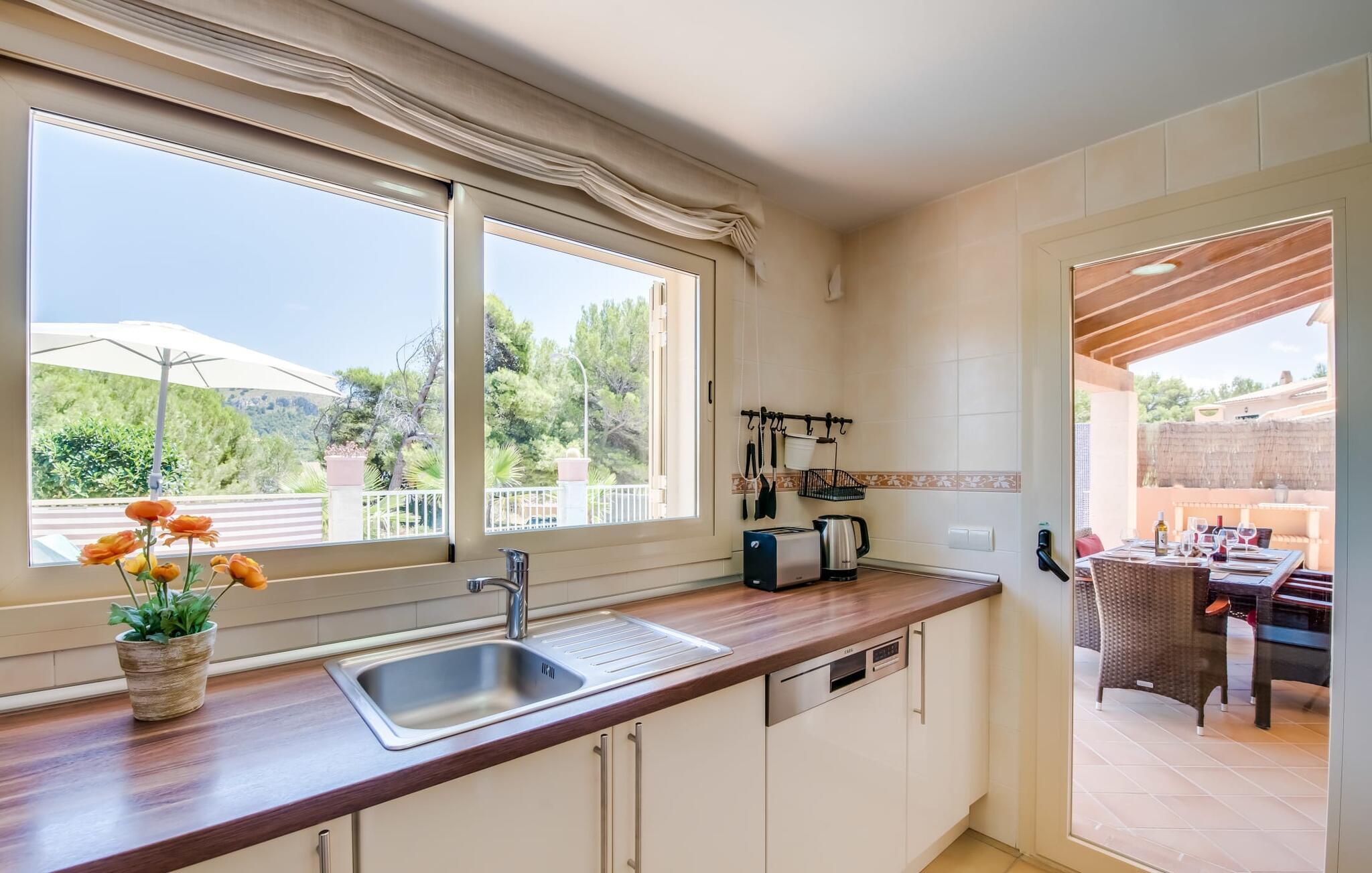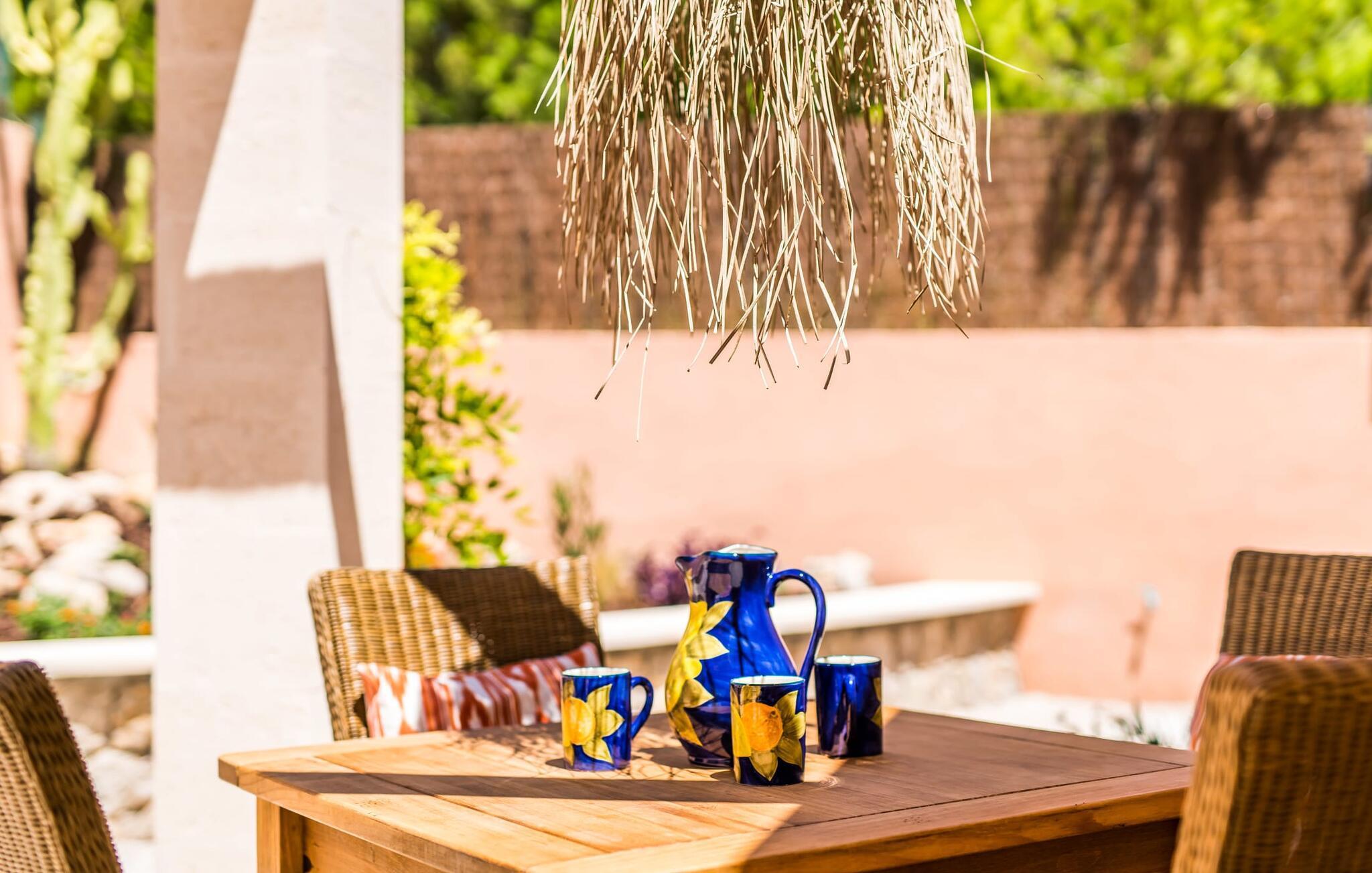 Der balearische Geist der Leichtigkeit spiegelt sich auch im hellen Innenraum des Strandhauses wider. Die Terrasse mit dem Polyrattan-Essbereich ist der zentrale Treffpunkt, denn vom großzügigen Wohn- und Esszimmer sowie von der separaten Küche aus haben Sie direkten Zugang zum Essbereich im Freien. Hohe Räume, natürliche Farben wie Terrakotta und warme Holztöne bestimmen den Wohlfühlcharakter und verleihen gleichzeitig eine zeitgemäße Schwerelosigkeit. Moderne Technik darf jedoch weder in der voll ausgestatteten Küche noch in den schicken Badezimmern (eines mit begehbarer Dusche en Suite im Obergeschoss und das zweite mit Badewanne im Erdgeschoss) fehlen. Für eine erholsame Nachtruhe stehen Ihnen die drei klimatisierten Schlafzimmer zur Verfügung. Eines der Schlafzimmer verfügt über einen kleinen Balkon und einen begehbaren Kleiderschrank. „Casa León de Cala Mesquida“ ist nicht nur ideal für eine oder zwei Familien, sondern auch für eine Gruppe von Freunden, die wissen, dass man sich nicht immer zwischen Meer und Bergen entscheiden muss, um einen perfekten Urlaub auf Mallorca zu verbringen.
