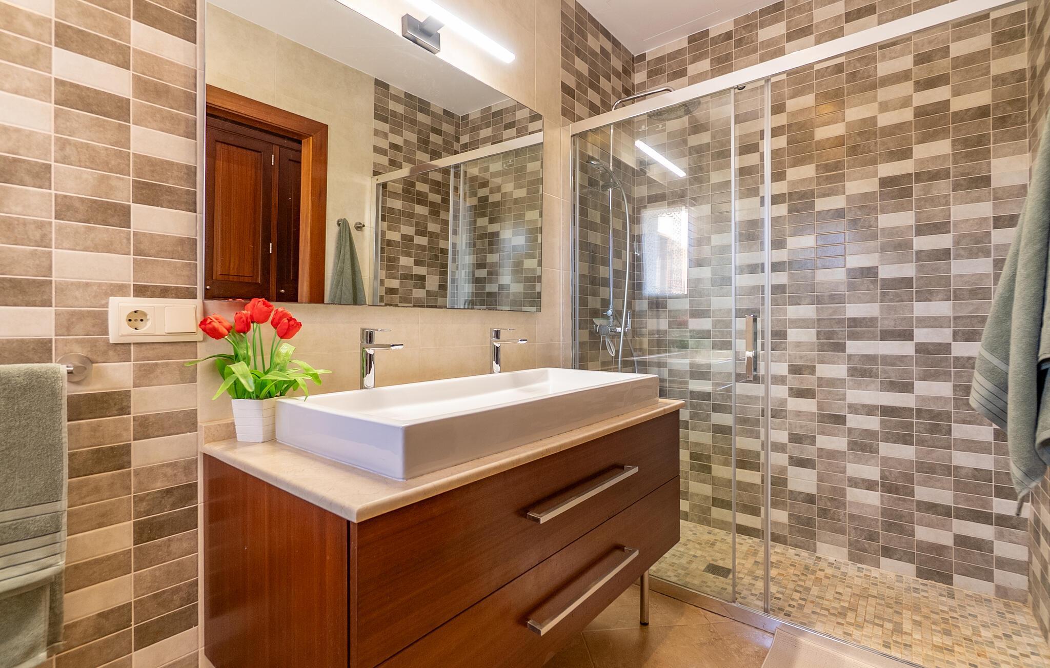 Das Interieur von „Casa Maria“ ist klassisch mit modernen Elementen. Viel warmes Holz, kombiniert mit hellen Wänden und Fliesenböden, dazu hochwertige Möbel, ein paar ausgewählte Dekorationsstücke und angenehme Beleuchtung: ein Urlaubsdomizil zum Wohlfühlen! Besonders praktisch, insbesondere für Familien mit kleinen Kindern, ist das Wohnen auf einer Ebene. Sie betreten das Haus durch einen großzügigen Eingangsbereich. Das gemütliche, offene Wohn- und Esszimmer lädt zum Entspannen und gemeinsamen Essen ein. Aber auch in der geräumigen, gut ausgestatteten Küche können Sie ohne Platzprobleme gemeinsam frühstücken. Die drei Doppelzimmer, alle geschmackvoll und dezent eingerichtet und mit Einbauschränken ausgestattet, bieten viel Privatsphäre. Ein Schlafzimmer verfügt über ein modernes Badezimmer en suite, ein weiteres Badezimmer komplettiert den Wohnbereich der Finca.