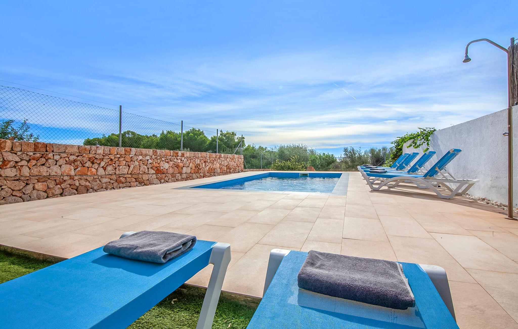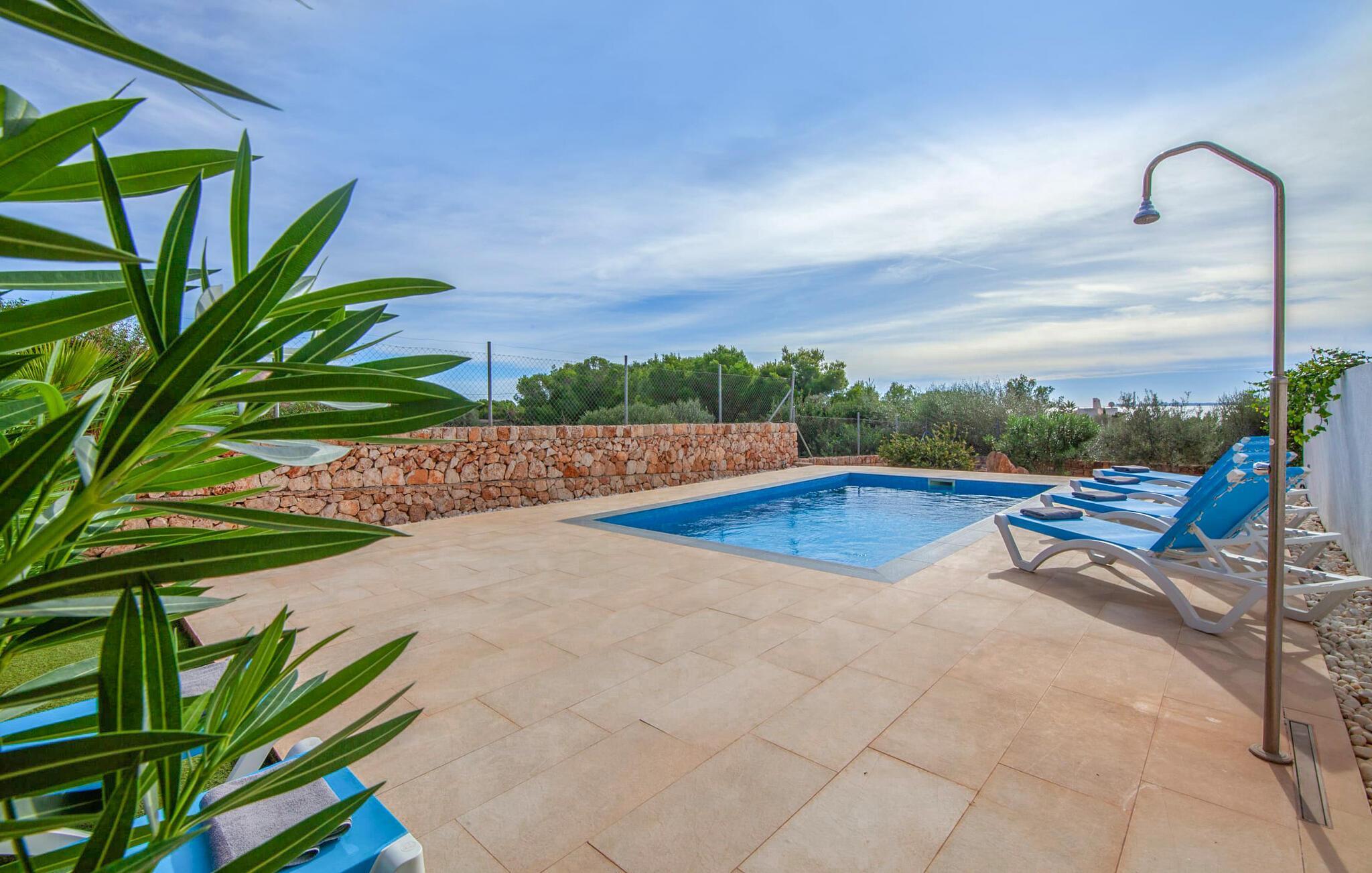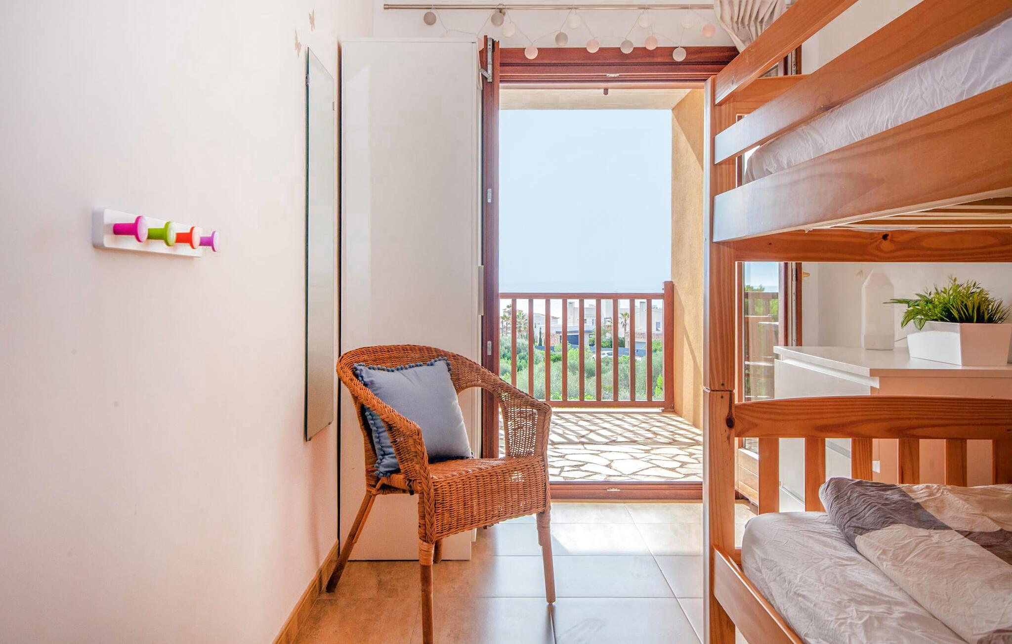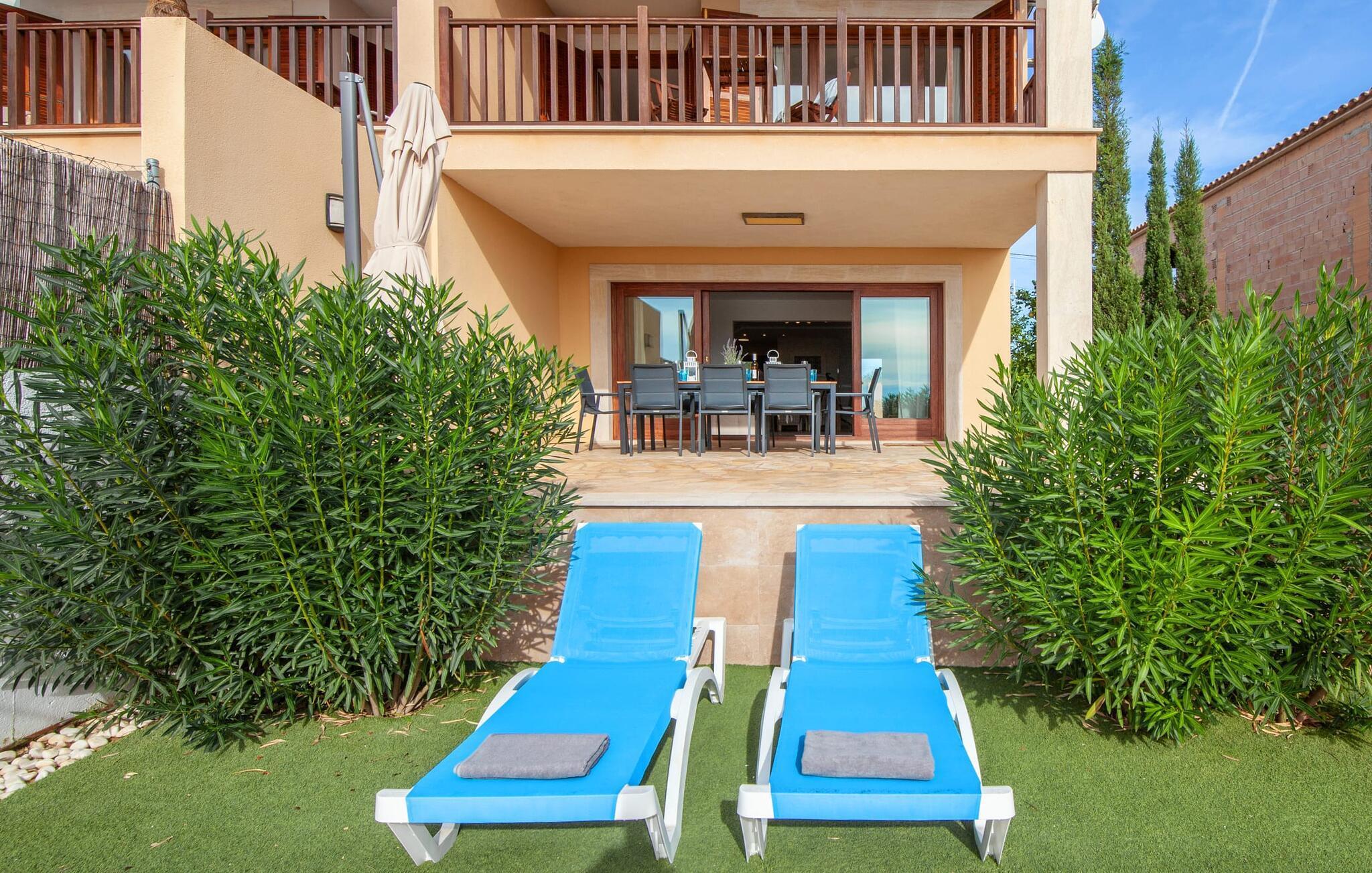 Einen tollen Blick auf das Meer genießen Sie, wenn Sie sich für diese Doppelhaushälfte entscheiden. Es liegt im wunderschönen Süden Mallorcas und bietet komfortable Unterkünfte für bis zu sieben Gäste für einen Urlaub am Meer. Auf dem 330 m² großen Grundstück haben Sie vielfältige Möglichkeiten, erholsame Stunden zu verbringen. Einer davon ist der schöne, leicht erhöhte Essbereich direkt am Haus oder, eine Etage darüber, der Balkon. Von dort aus hat man einen besonders schönen Blick auf das Meer. Für alle Sonnenhungrigen stehen bequeme Sonnenliegen zur Verfügung. Und das 10 Meter lange Flachwasserbecken sorgt an warmen Tagen für angenehme Erfrischung. Eine Außendusche und ein Holzkohlegrill runden die attraktive Außenanlage ab.