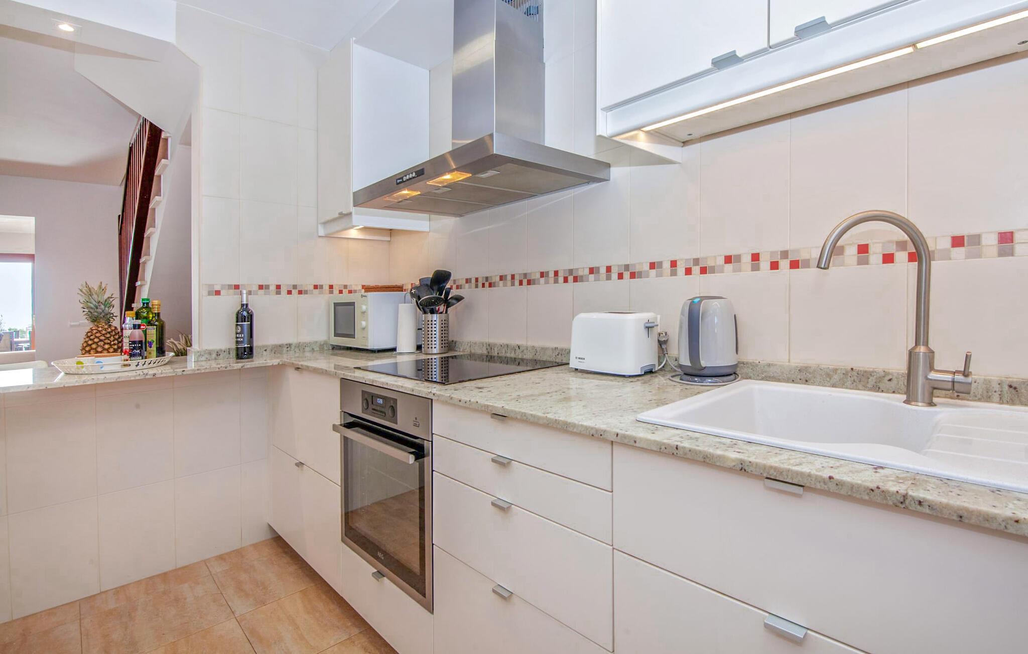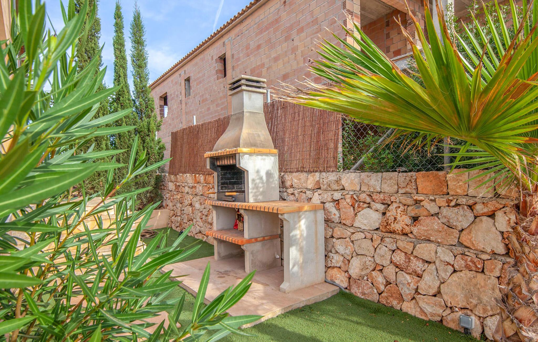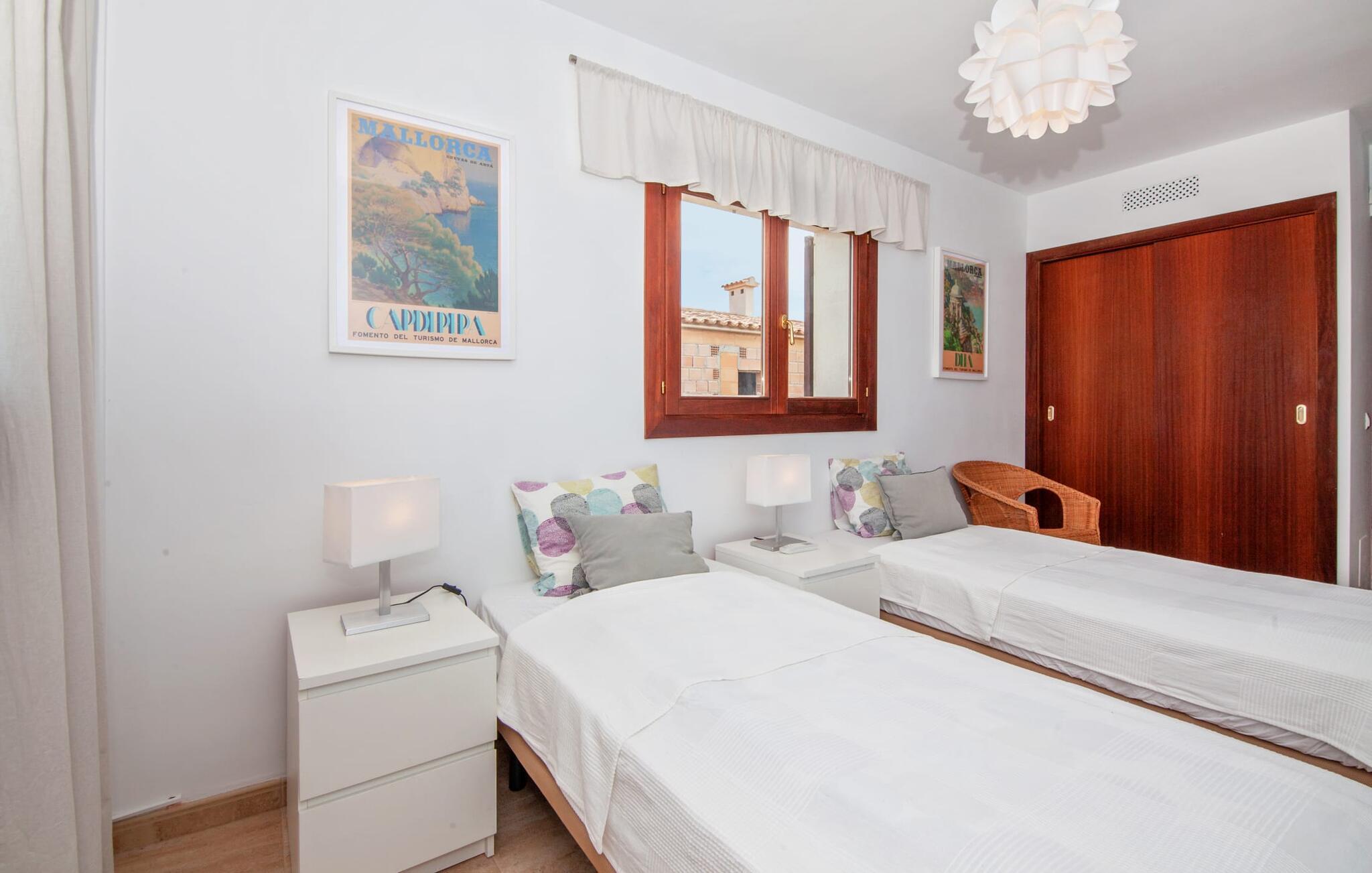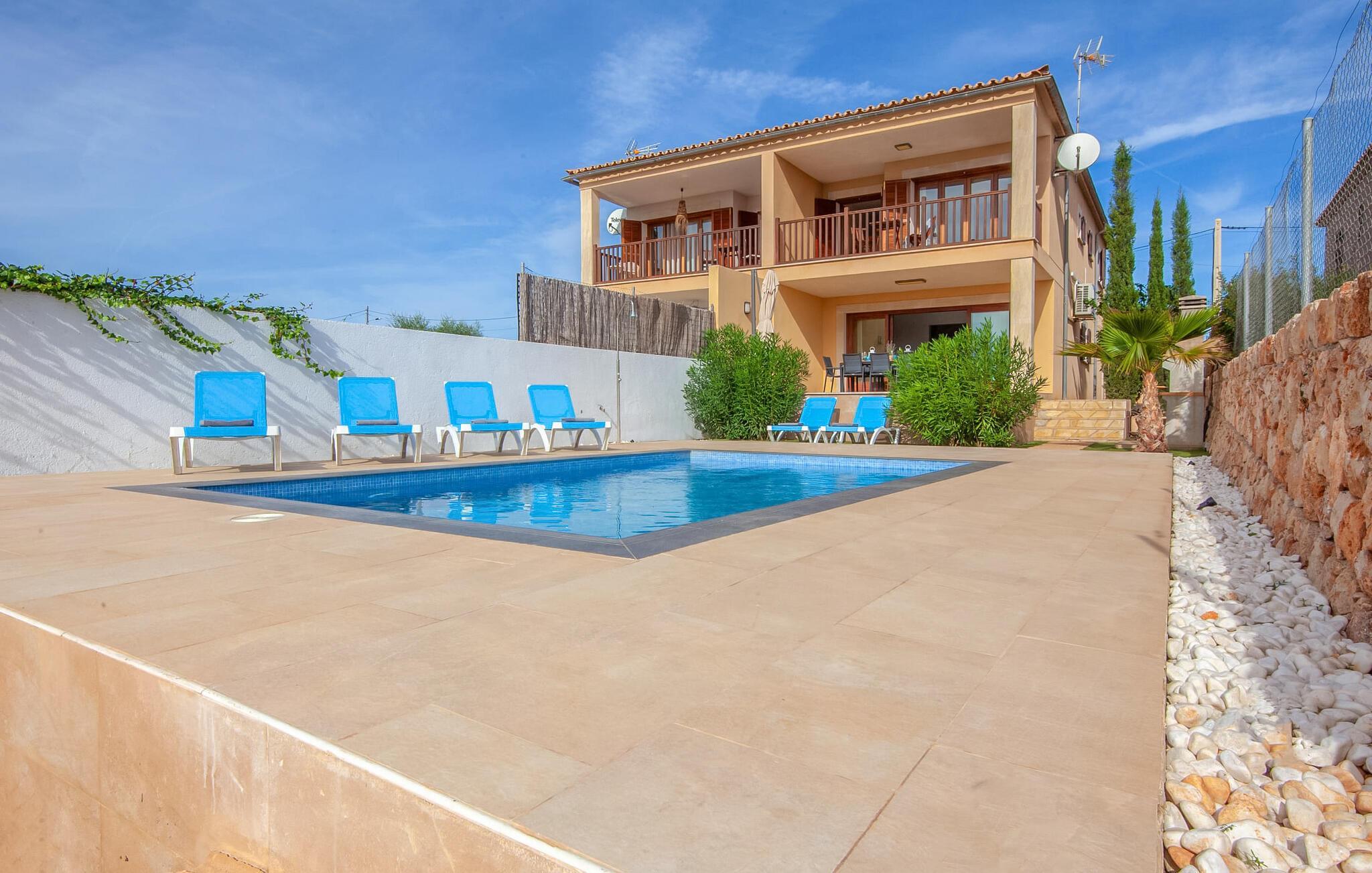 Einen tollen Blick auf das Meer genießen Sie, wenn Sie sich für diese Doppelhaushälfte entscheiden. Es liegt im wunderschönen Süden Mallorcas und bietet komfortable Unterkünfte für bis zu sieben Gäste für einen Urlaub am Meer. Auf dem 330 m² großen Grundstück haben Sie vielfältige Möglichkeiten, erholsame Stunden zu verbringen. Einer davon ist der schöne, leicht erhöhte Essbereich direkt am Haus oder, eine Etage darüber, der Balkon. Von dort aus hat man einen besonders schönen Blick auf das Meer. Für alle Sonnenhungrigen stehen bequeme Sonnenliegen zur Verfügung. Und das 10 Meter lange Flachwasserbecken sorgt an warmen Tagen für angenehme Erfrischung. Eine Außendusche und ein Holzkohlegrill runden die attraktive Außenanlage ab.