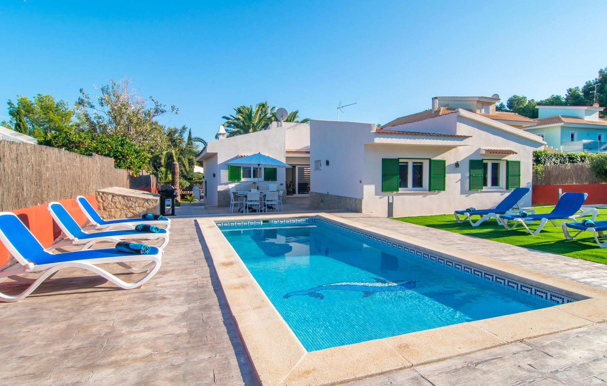 Diese charmante Villa verfügt über ein rotes Dach und grüne Fensterläden und liegt in einer gepflegten Urbanisation. Obwohl das Anwesen von Nachbarn umgeben ist, gewährleistet es Privatsphäre und ermöglicht einen ruhigen Rückzugsort. Die Villa verfügt über mehrere überdachte und sonnige Terrassen, die sich ideal zum Entspannen und Grillen eignen. Ein atemberaubender Pool, der mit einem Delfinmosaik geschmückt ist, bietet erfrischende Abkühlungen und Sonnenliegen laden zum anschließenden Aufwärmen in der Nähe ein. Die Lage ist ideal, lokale Restaurants, Lebensmittelgeschäfte und der Strand sind alle nur einen kurzen Fußweg entfernt.