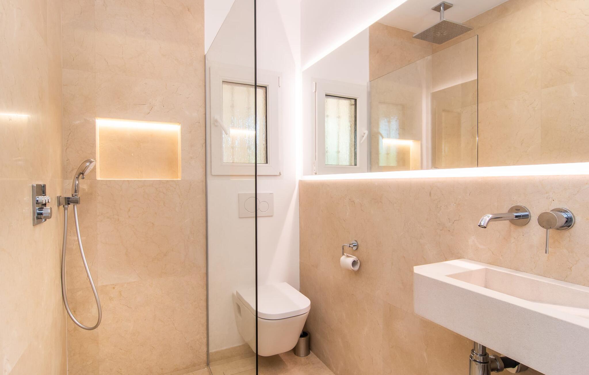 Von der überdachten Terrasse führen mehrere bodentiefe Fenster direkt in verschiedene Bereiche des Hauses. Der Standard wird im Innenraum konsequent fortgeführt und erstreckt sich auch auf alle Außenbereiche. Helle Böden, Wände, Decken und Stoffe sowie sorgfältig dosierte, stilvolle Accessoires, die das Ambiente wirkungsvoll aufpeppen, prägen das Wohnflair. Das kombinierte Wohn- und Esszimmer ist ein toller Ort, um Zeit mit Ihren Mitreisenden zu verbringen und trotzdem verschiedenen Aktivitäten nachgehen zu können. Nebenan befindet sich die geräumige, voll ausgestattete Küche, die auch über einen Ausgang zur Terrasse verfügt. Drei schöne Doppelzimmer beherbergen wunderbare Ruheinseln für erholsame Urlaubsnächte. Drei Duschbäder, davon zwei en suite, runden die Großzügigkeit dieser Mallorca-Villa ab, die wir allen empfehlen, für die die Nähe zum Meer und gehobener Komfort ganz oben auf der Urlaubswunschliste stehen.