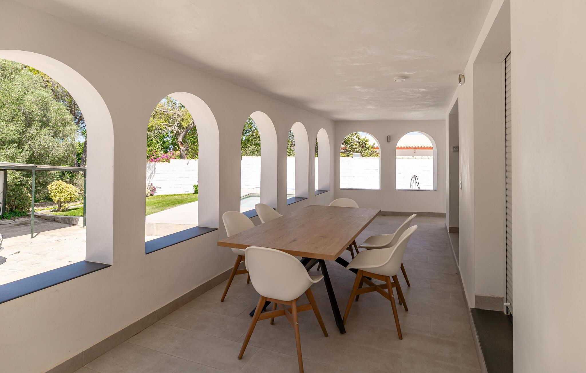 Ihr Ferienhaus bietet Ihnen den Luxus eines privaten Pools, der an warmen Sommertagen für angenehme Erfrischung sorgt. Entspannen Sie auf den komfortablen Liegestühlen und starten Sie den Tag mit einem gemütlichen Frühstück auf der einladenden, überdachten Terrasse, wo Sie Ihre Mahlzeiten im kühlen Schatten einnehmen können. Der elegant gestaltete Innenbereich des Hauses verfügt über ein gemütliches Wohnzimmer, das nach einem erlebnisreichen Tag zum Entspannen einlädt.