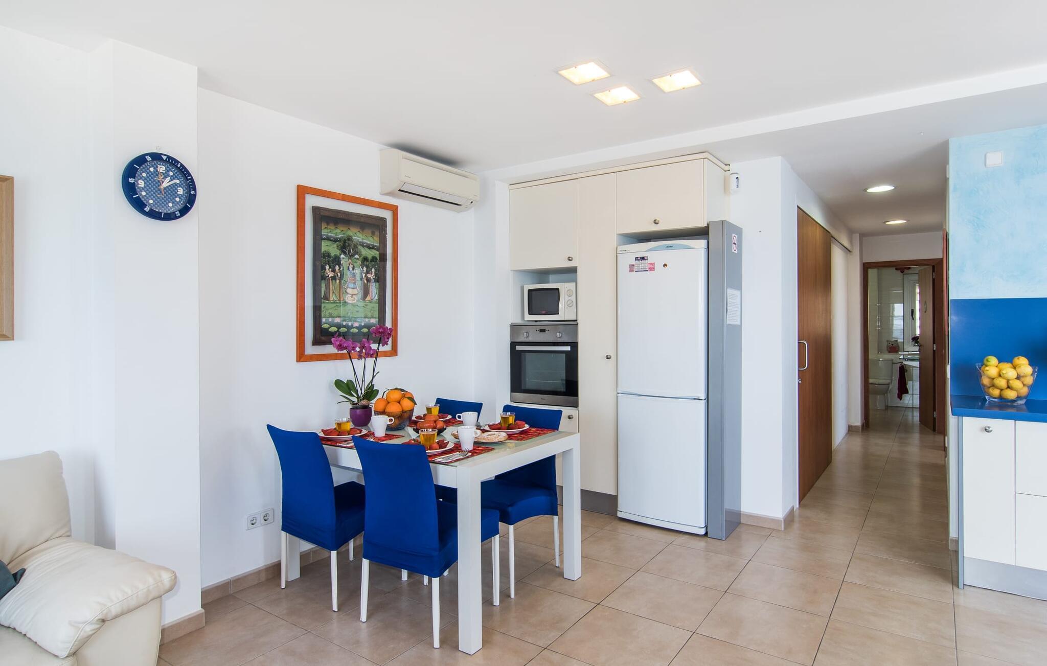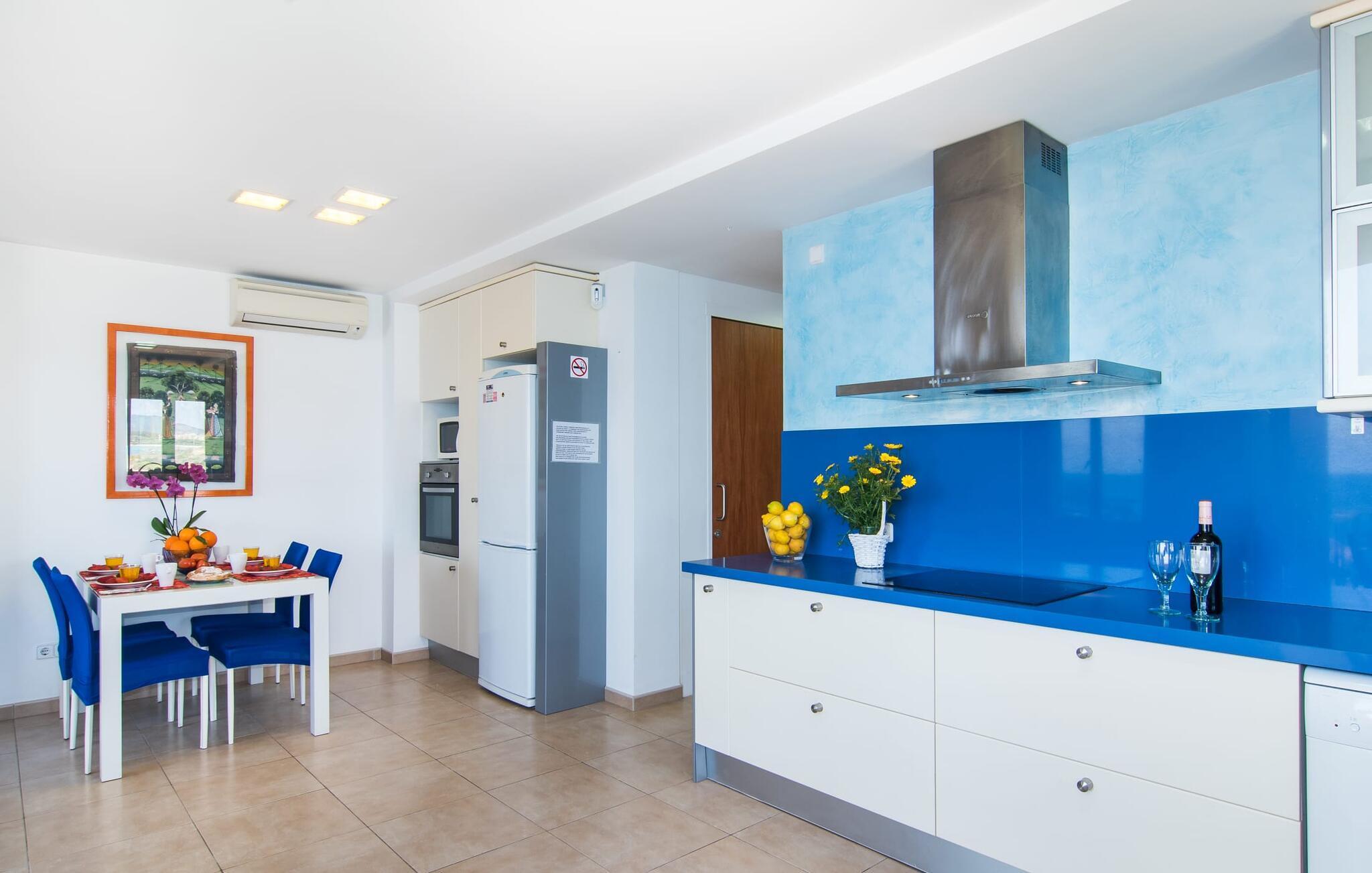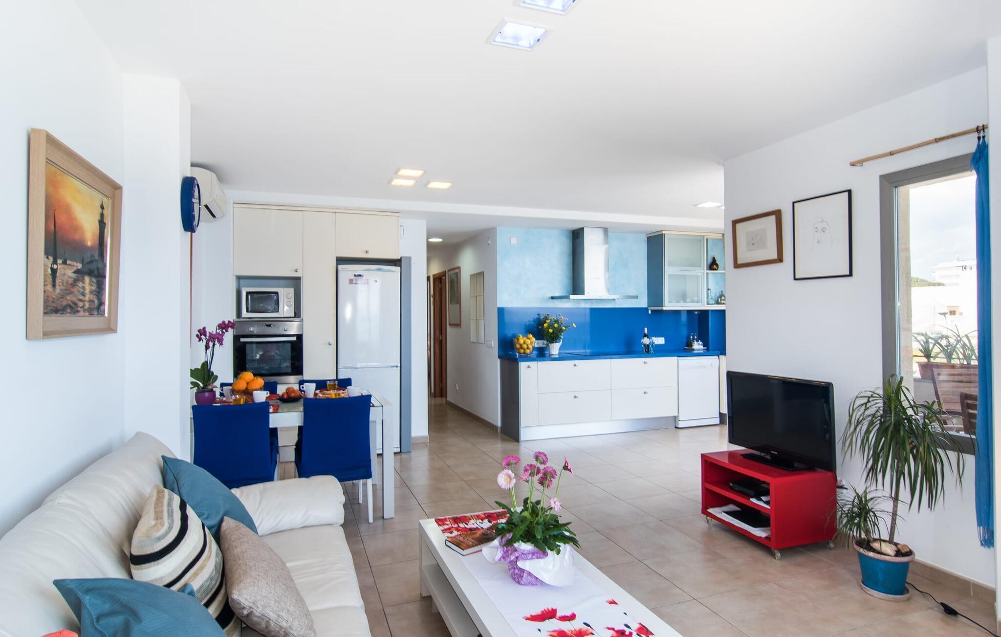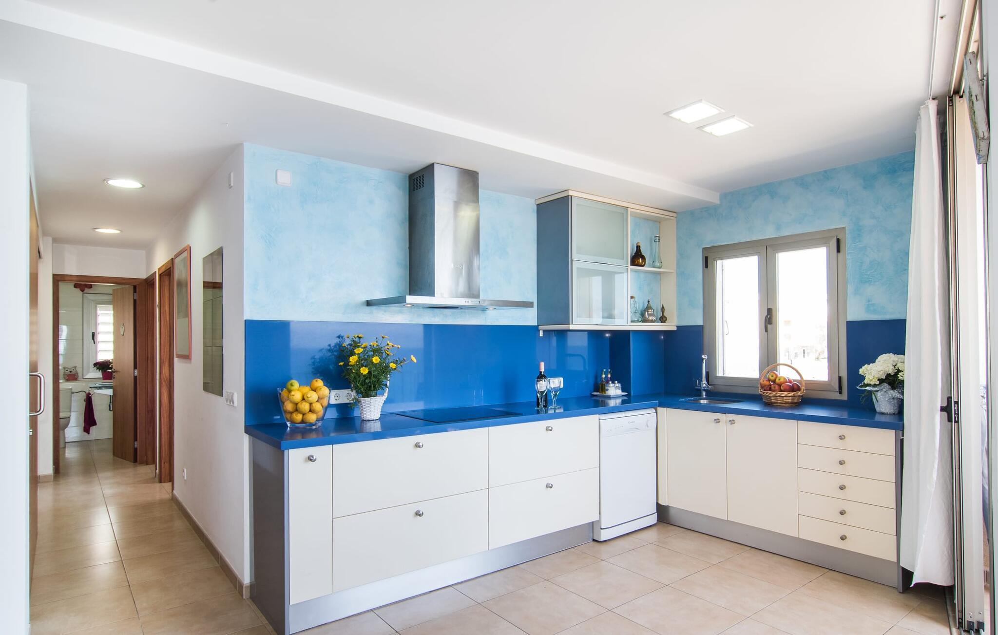 Das moderne Ferienhaus „Cielo Mar“ überzeugt mit angenehm maritimem Charme und einladender Fröhlichkeit, die sich besonders für eine Familie mit zwei Kindern eignet. Die Belegung ist jedoch völlig variabel, da Sie im Gästezimmer im Obergeschoss ein zusätzliches Bett reservieren können, das eine kostengünstige Möglichkeit zur Erweiterung Ihrer Gruppe darstellt, oder auch zu einem reduzierten Preis von einem Paar reserviert werden kann. Und das lässt sich auch das ganze Jahr über genießen, da die Unterkunft in ihrem zentralen Raum, nämlich dem wunderbar offenen Wohn-, Ess- und Küchenbereich, über eine Warm-/Kalt-Klimaanlage verfügt. Das bequeme Sofa vor dem LCD-Fernseher eignet sich hervorragend für einen entspannten Filmabend an kühleren Abenden. Weiß und Ultramarin sind die dominierenden Farben des hell eingerichteten und dekorierten Ess- und Küchenbereichs; Letzteres ist übrigens sehr praktisch, da es neben anderen Geräten auch mit einer Spülmaschine ausgestattet ist. Mit der Waschmaschine können Sie auch Ihre Urlaubsgarderobe schön sauber halten. Nach dem Kochen mit Blick auf das Meer können Sie auf den Balkon gehen, wo mindestens vier Personen Platz nehmen und gemeinsam ihre Mahlzeiten genießen können. Die Schlafzimmer befinden sich am Ende des Flurs, sodass Sie bei geöffnetem Fenster gut schlafen und das Meeresrauschen hören können – für manche Menschen ist es sogar beruhigender, als Schäfchen zu zählen. Der Stil der Wohnung ist durchweg fröhlich und hell. In so vielen kleinen Details spürt man sogar die Liebe, mit der dieser Ort für seine Gäste hergerichtet wurde, damit Sie sich rundum wohlfühlen können.