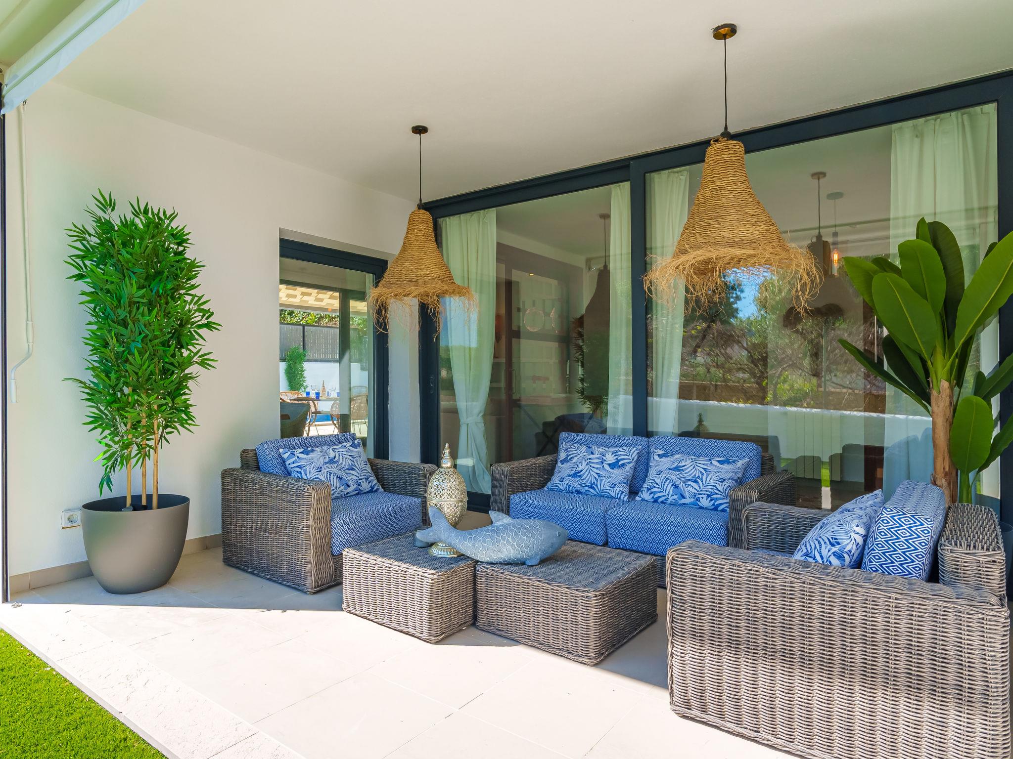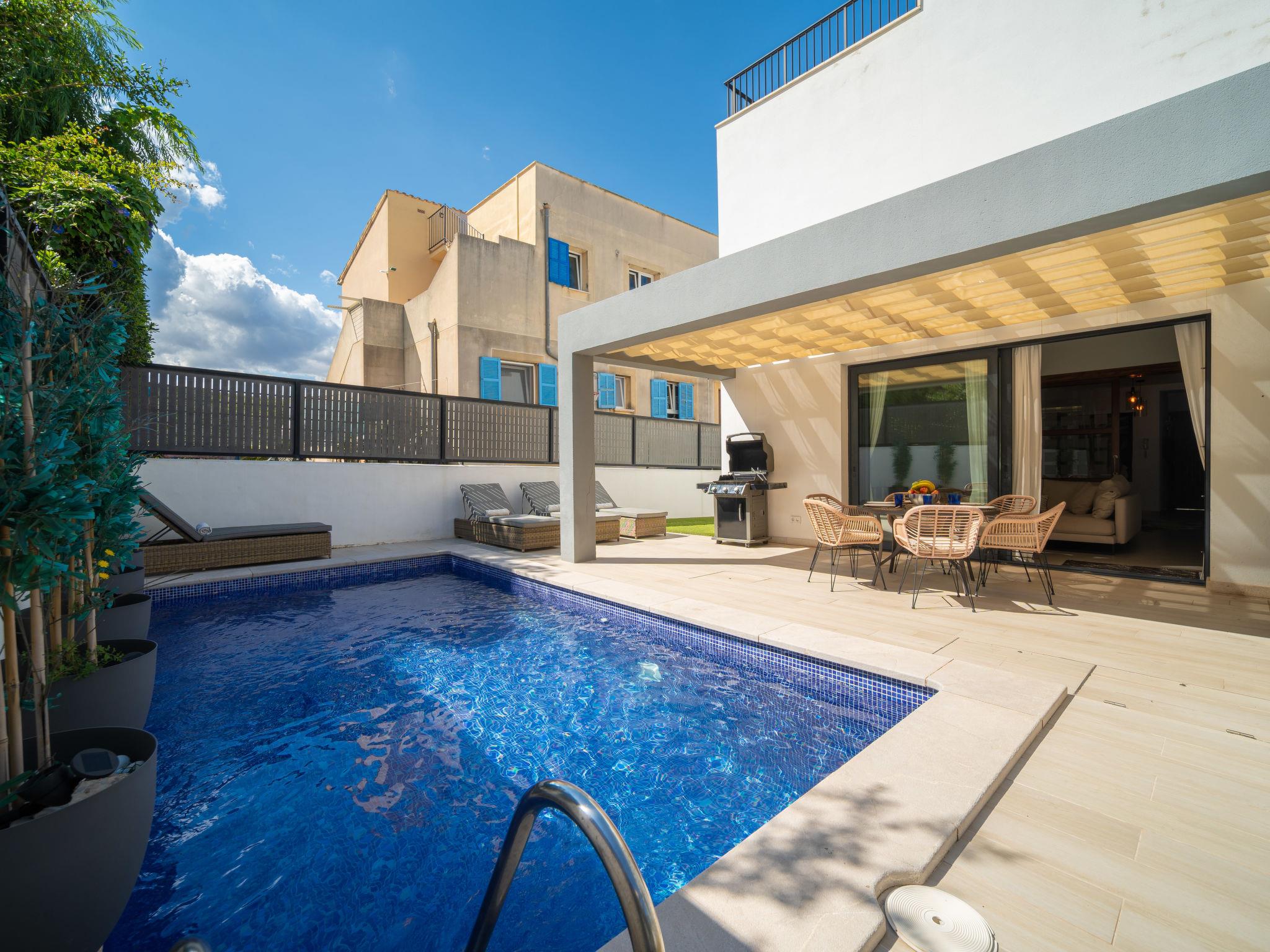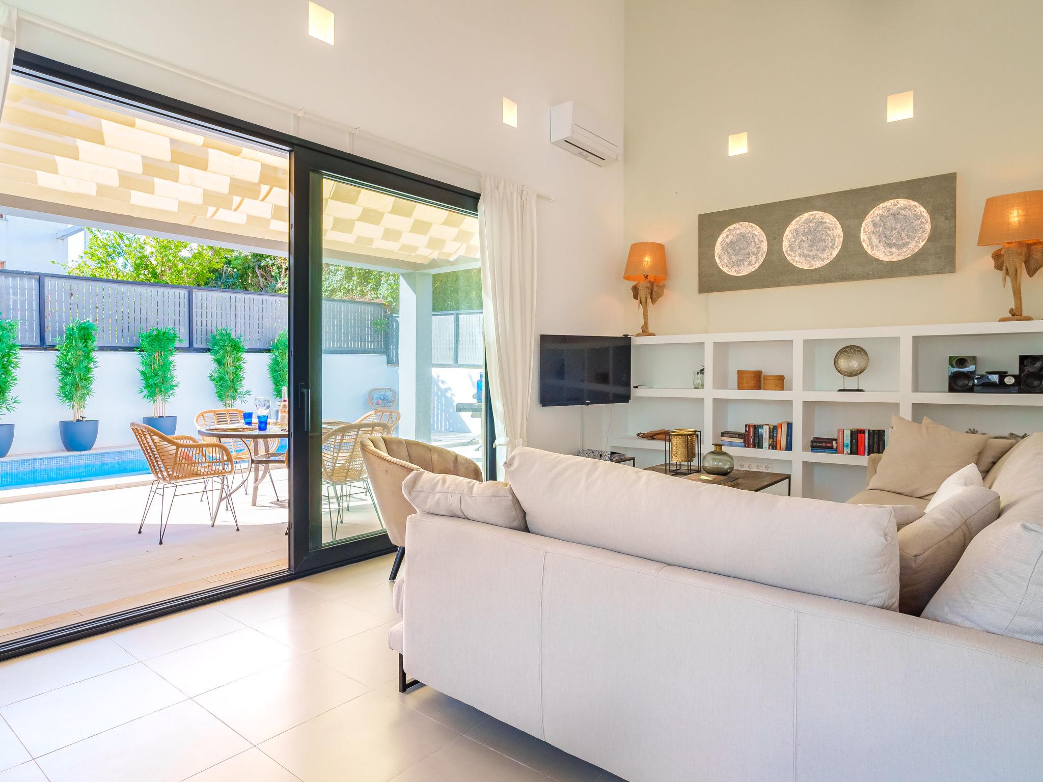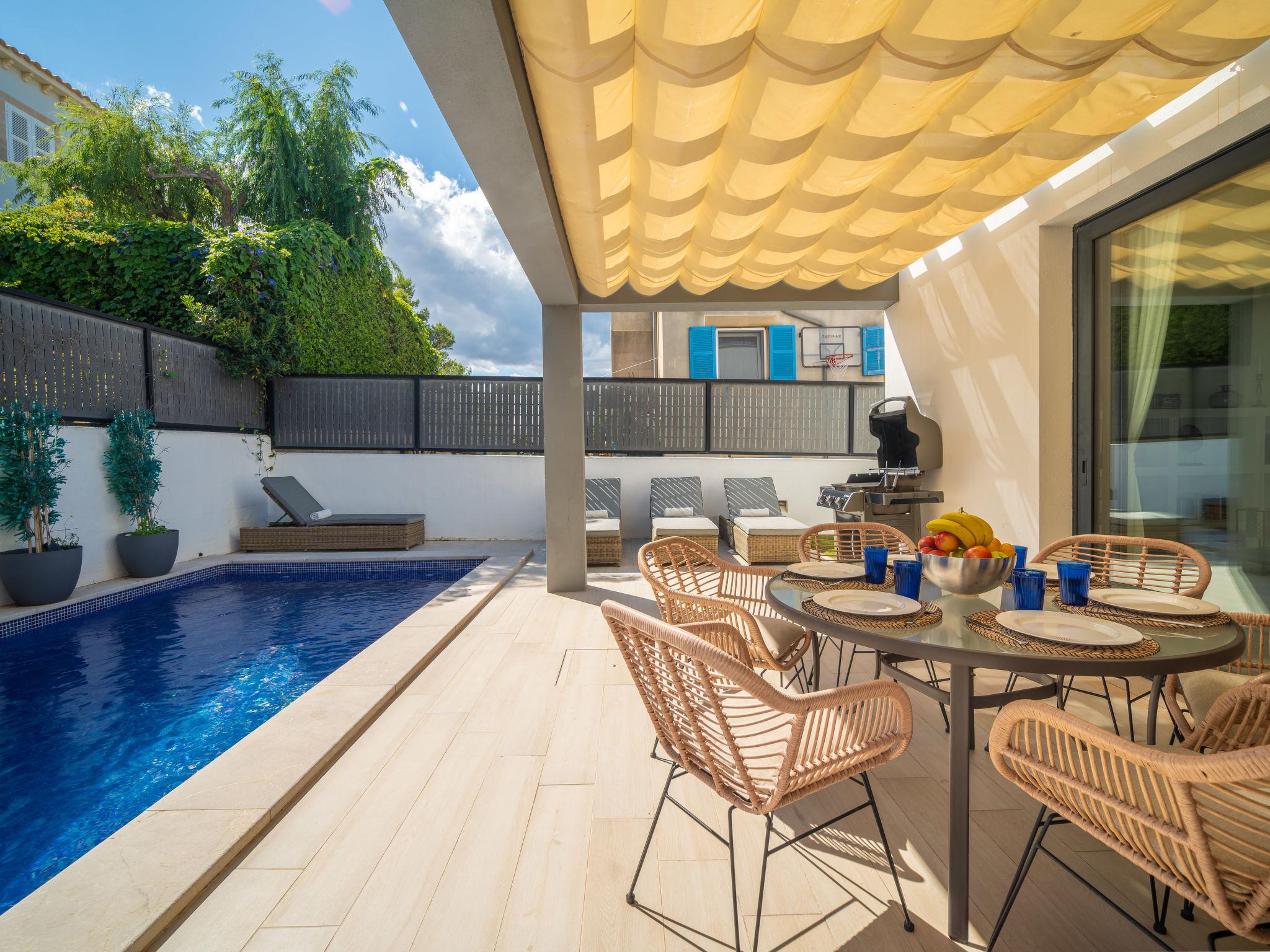 Colonia de Sant Pere 13 km from Artà: This extraordinary modern holiday oasis is located in the idyllic fishing village of Colonia St. Pere/Mont Farrutx. Here, in this wonderful north-east of the island of Mallorca, we would like to offer you, dear guests, an unforgettable holiday. Enjoy your precious time as a couple, with your family or with friends at Can Aruna. The completely renovated modern holiday home, located on a side street in the Farrutx settlement, offers its guests every amenity for a relaxing holiday. Coming home, feeling good, having a good time, under this maxim, your holiday enjoyment time, your personal quality time, sets in when you arrive at Can Aruna. Enjoy this unique view from the roof terrace, which stretches over the town, Mont Farrutx, the Bay of Alcudia and Cap Formentor. Enjoy your sundowner on the roof terrace or linger on the covered lounge terrace. After breakfast on the sheltered pool terrace, the pool invites you for the first refreshment of the day. The generously sized terraces on the bedrooms on the first floor are simply wonderful as a private retreat. Very large, modern, luxurious villa "Can Aruna", 2 storeys, renovated in 2023. In the resort 500 m from the centre of Colonia Sant Pere, in a quiet, sunny position residential area (villas), 2 km from the edge of the forest, 500 m from the sea, 800 m from the beach. Private: beautiful garden with wildlife garden, courtyard, swimming pool angular (6 x 4 m, depth 120 - 150 cm, seasonal availability: 01.Jan. - 31.Dec.). Outdoor shower, patio, arbour, pergola, garden furniture, barbecue, pool maintenance by the owner/gardener. In the house: internet access, WiFi, air conditioning, burglar alarm system, washing machine. Parking at the house on the premises. Shop 500 m, grocery 400 m, supermarket 700 m, restaurant 550 m, bar 550 m, bakery 600 m, café 550 m, pub garden 600 m, 5 minute walk to the centre, bus stop "Sa Colonia" 500 m, sandy beach "FFK Strand Sa Canova" 2.5 km, shingle beach "Caló des Parral" 600 m, rocky beach "Colonia Sant Pere" 500 m, diving center 700 m. Sports harbour 550 m, golf course (18 hole) 17 km, surf school 600 m, sailing school, walking paths from the house 2 km, cycle lane 700 m. Nearby attractions: Artá, Betlem, Can Picafort, Alcúdia, Cala Ratjada, Manacor. Hiking paths: Ermita de Betlem 3 km, Finca Son Real 10 km, Albufera de Alcúdia 17 km. Please note: car recommended. Suitable for seniors. Object suitable for 6 adults. The owner does not accept any groups. The owner does not accept any youth groups. Airfield 78 km from the property.