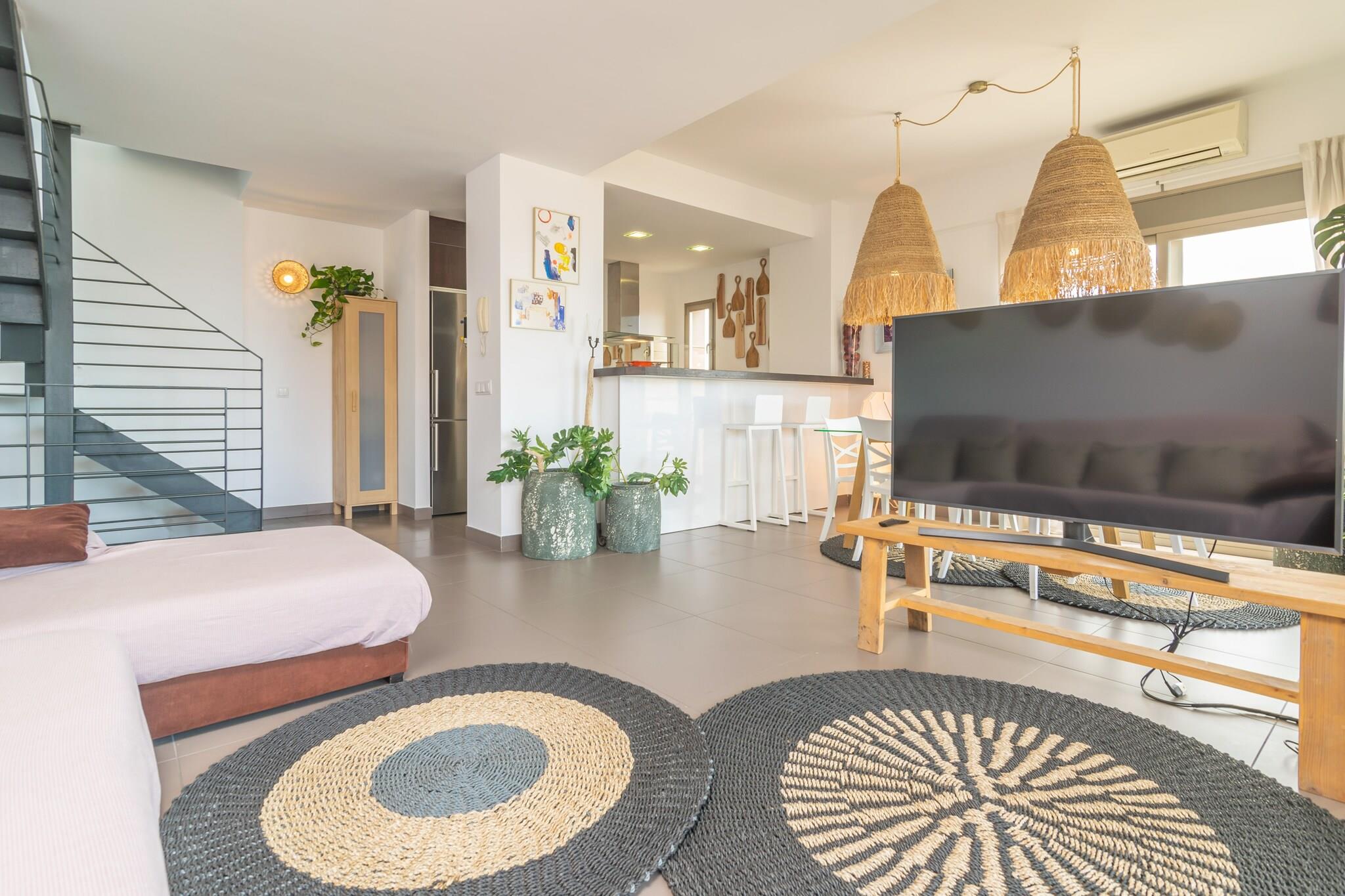 This beautiful triplex offers an amazing terrace perfectly furnished to spend unforgettable evenings. It features a large exterior table with chairs where you will be able to admire the sunrise and sunset while enjoying a delicious breakfast or a good dinner with the best company. And even better, you can sit on the couch or armchairs and relax while admiring the stunning beauty of the sea. The private entrance to the house is on the ground floor and it leads to the first floor with the common areas like the modern and surprising kitchen open to living and dining room. It has AC and a panoramic view to the sea as if you were sailing the quiet Mediterranean waters. Here you find a comfortable sofa where you can sit and watch TV, the dining area and the kitchen, which is equipped with a ceramic top, good appliances and a bar with stools. On the same level there is a bathroom with shower that serves the floor and two bedrooms with wardrobe and air conditioning, both with double bed. One of them also has an en-suite bathroom with shower. On the top floor you find the last bedroom that features a single bed and exit to a terrace with amazing views to the sea and to the island of Cabrera. At this terrace you will find the washing machine, the iron and the ironing board. Colonia de Sant Jordi is a wonderful coastal area, beautiful and lively, where you will enjoy good restaurants serving fresh fish. The village offers all kinds of services and entertainment. You can spend a great day at the beach for instance in the beach of Colonia de Sant Jordi, about 700 metres away from the property, or in others like the one in es Trenc about 6 km away. You can make boat excursions to the island of Cabrera, for example, or you can drive skirting the coast to know other lovely towns and places in the island. You are not allowed by the residents association to hang towels or other kind of clothes on the terrace railing. Consult the advertiser for possible charges. Pets are not allowed. The holding of events is forbidden. Distances Beach: 0.7 km - Colònia de Sant Jordi Airport: 46.5 km - Son Sant Joan Golf course: 43.6 km - Golf Maioris Town: 0.01 km - Colònia de Sant Jordi Train station: 52.7 km - Palma Bus stop: 0.2 km - Colònia de Sant Jordi Ferry: 54 km - Palma Hospital: 42.5 km - Hospital de Manacor Tourist license: ETVPL/14301Single Rental Registry: ESFCTU00000700800117120300000000000000000ETVPL/143011Homerti - Central de Reservas CR/33