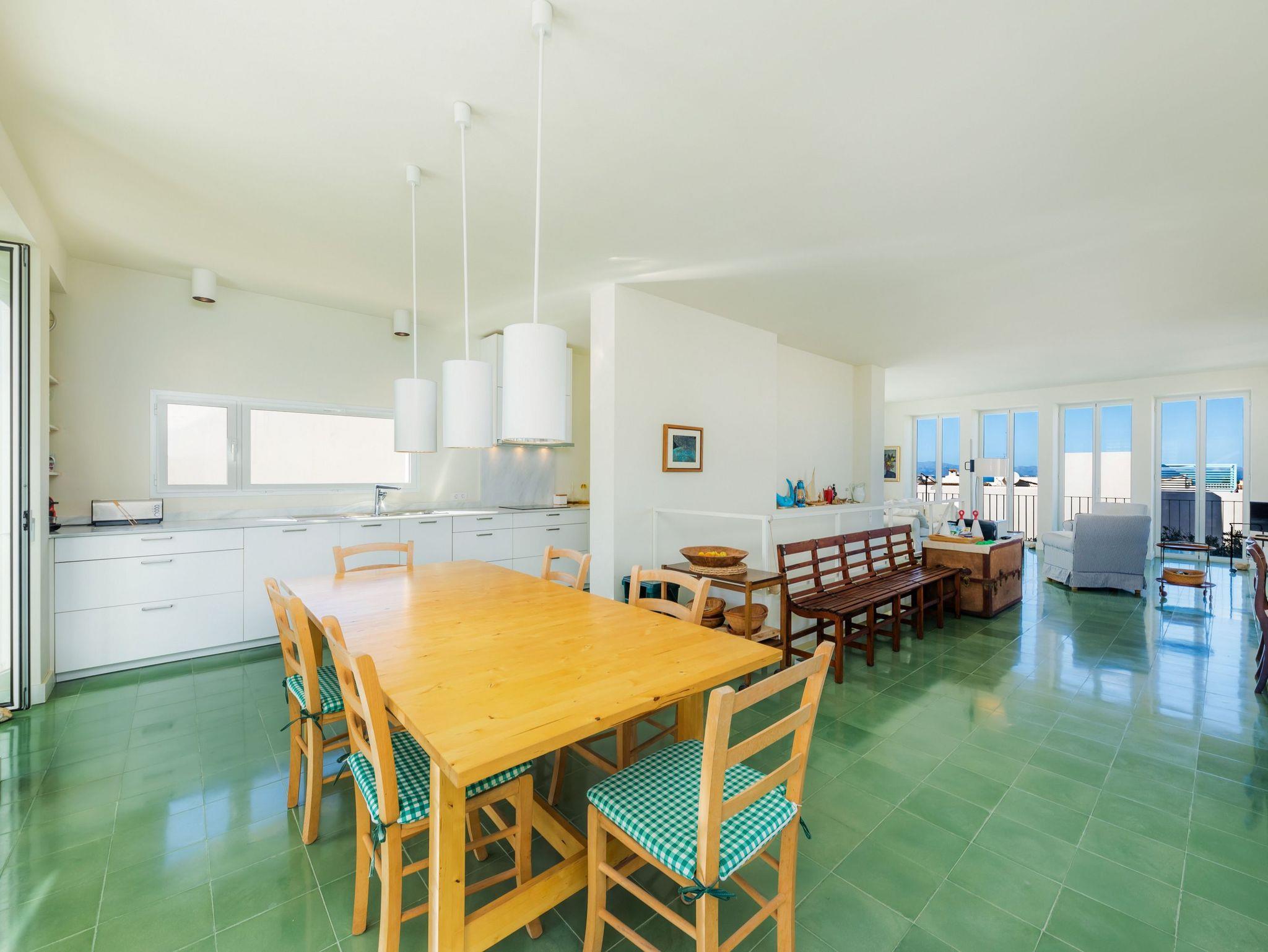 Durch die moderne Treppe gelangen Sie zum geräumigen Wohn-Essbereich mit Meerblick.