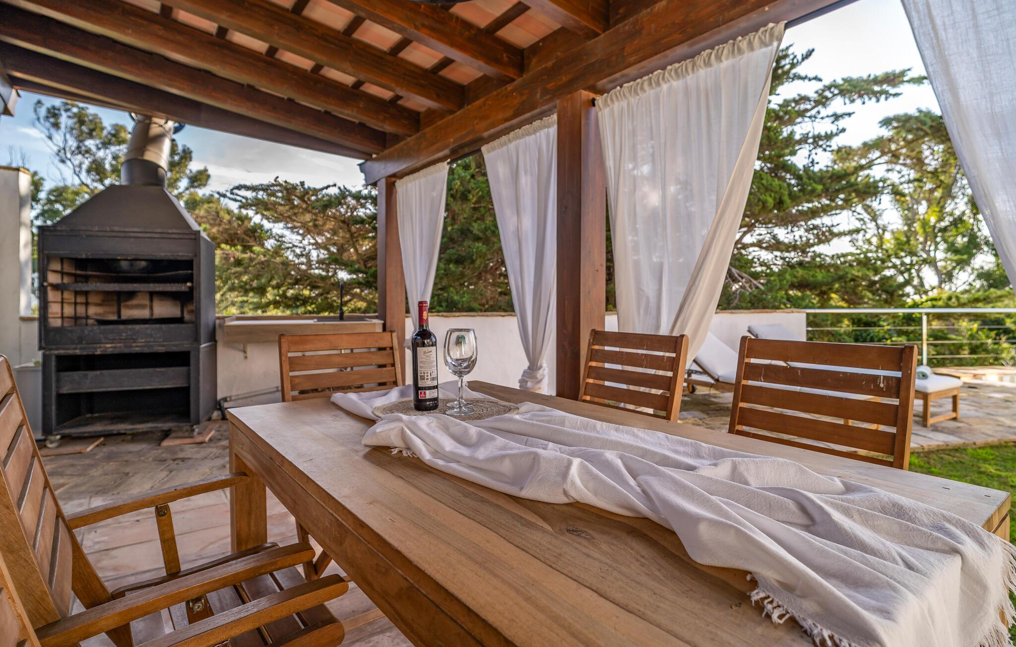 Sichern Sie sich Ihren Lieblingsplatz im gepflegten Außenbereich. Hier erwartet Sie eine traumhafte Terrasse mit Panoramablick auf das Meer, ideal für ein Frühstück oder ein Glas Wein in der Abenddämmerung. Erfrischen Sie sich nach Belieben im privaten Pool und freuen Sie sich auf entspannte Grillabende unter der überdachten Pergola.