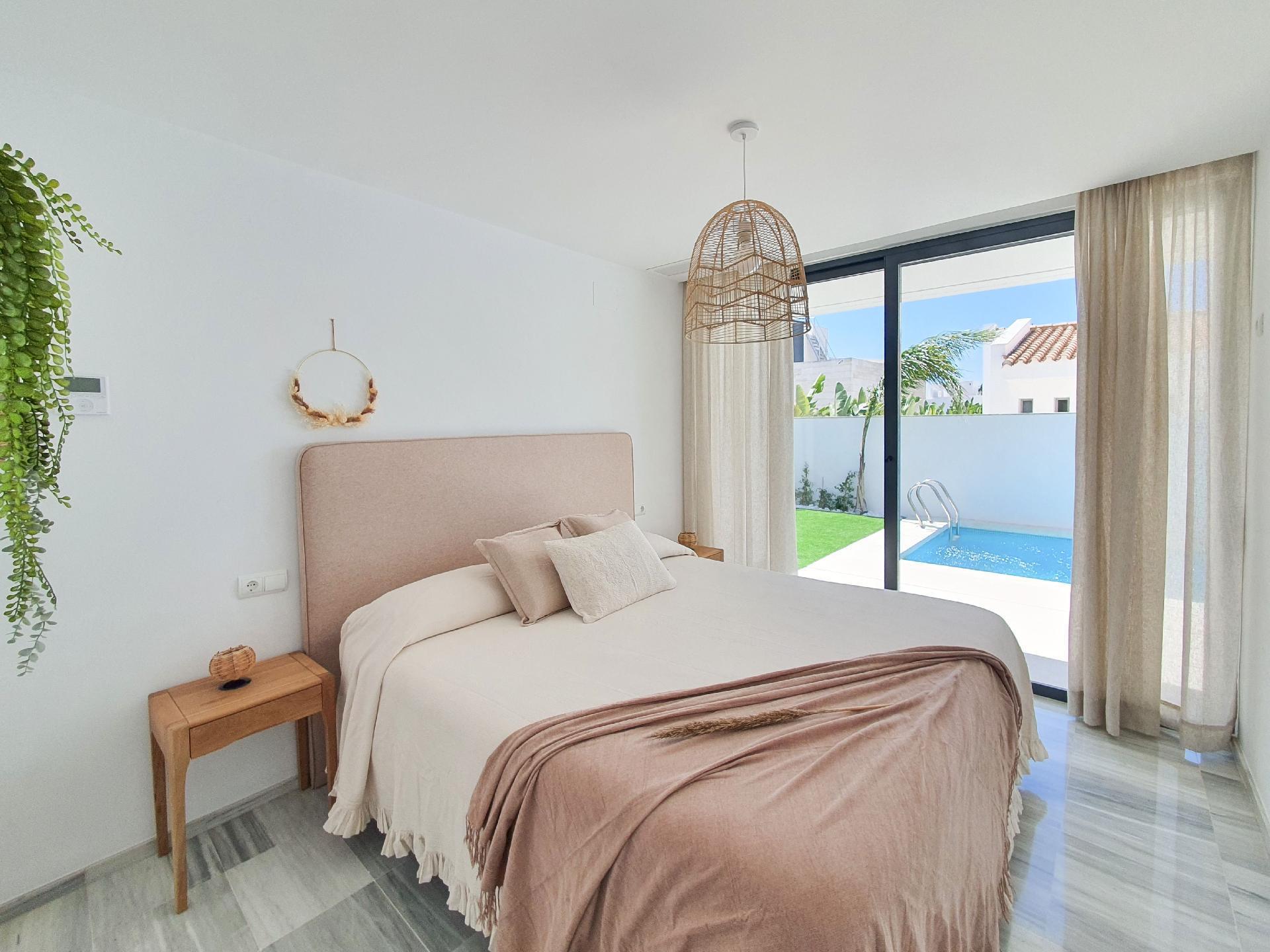 Outside, La Casetta de Conil boasts a spectacular 12-metre long saline chlorinated swimming pool, complemented by an elegant garden, barbecue areas, ground level terraces and two solariums. These outdoor facilities have been specially designed to enjoy the warm climate all year round, making this property a perfect choice for both summer days and cooler seasons.