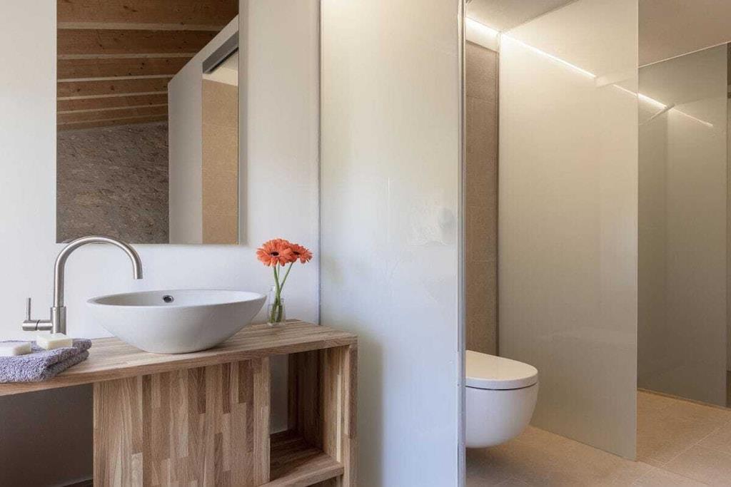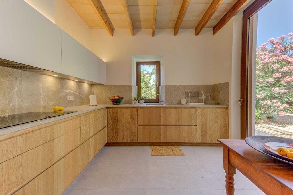 Straightforward, modern, and yet so cozy – these are the advantages of this finca on the outskirts of Consell. Traditional quarry stone walls combine with stylish, contemporary furnishings on two floors. In the recent restoration of this old family home, the architect succeeded in blending the qualities of old and new into an atmospheric unity. The striking lighting, which creates a truly cosy atmosphere, is particularly striking. The approximately 430 square meters comfortably accommodate 10 guests. The five double bedrooms, each with air conditioning and en-suite bathrooms, ensure pleasant, restful nights. Four of these are located on the upper floor, while two guests can make themselves comfortable in the fifth bedroom on the ground floor. The ground floor also features a spacious living room with an open, interconnected kitchen and an office area for those seeking relaxation. Here, you can cook together, play games, chat in peace, or watch movies.
