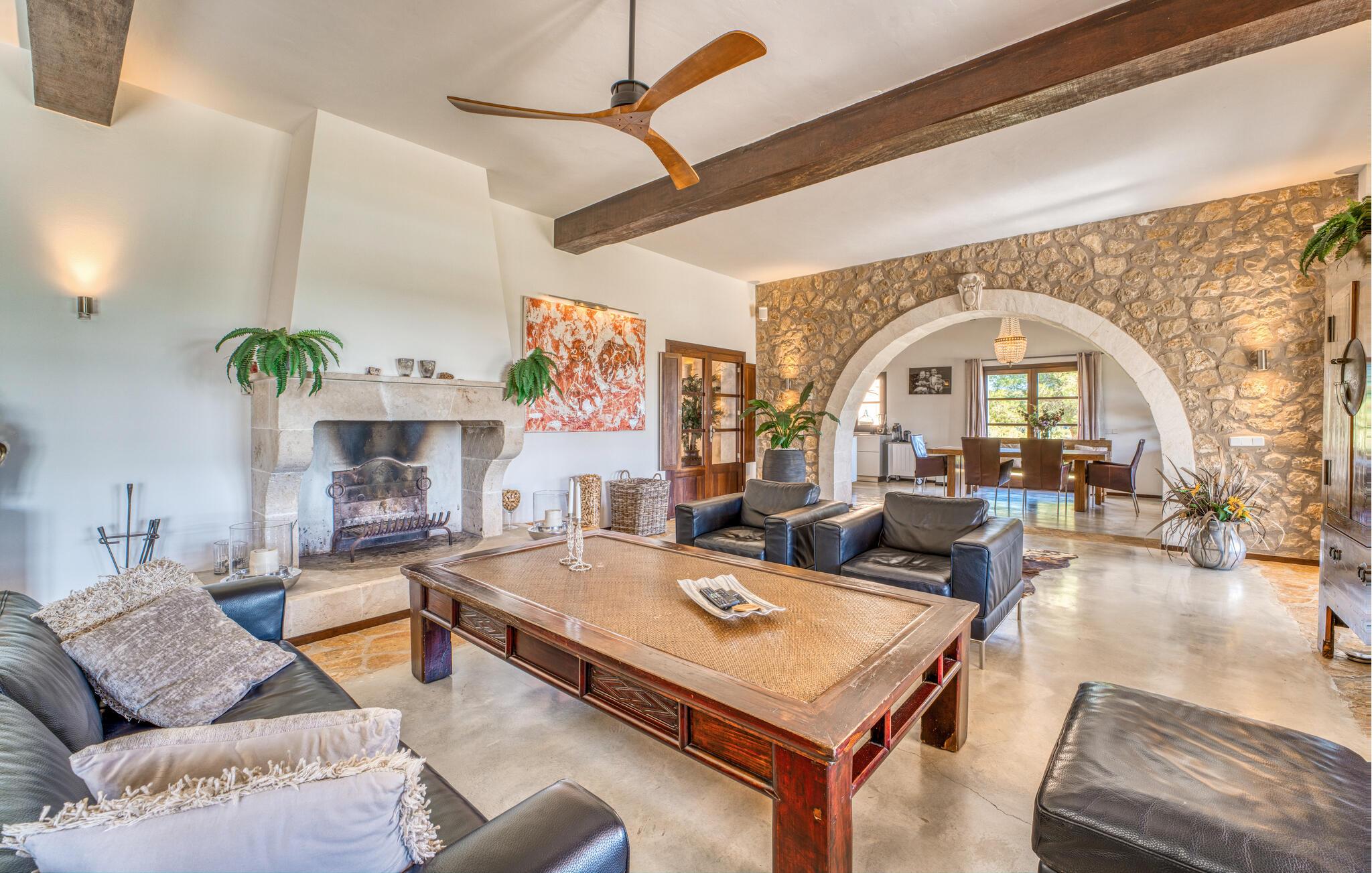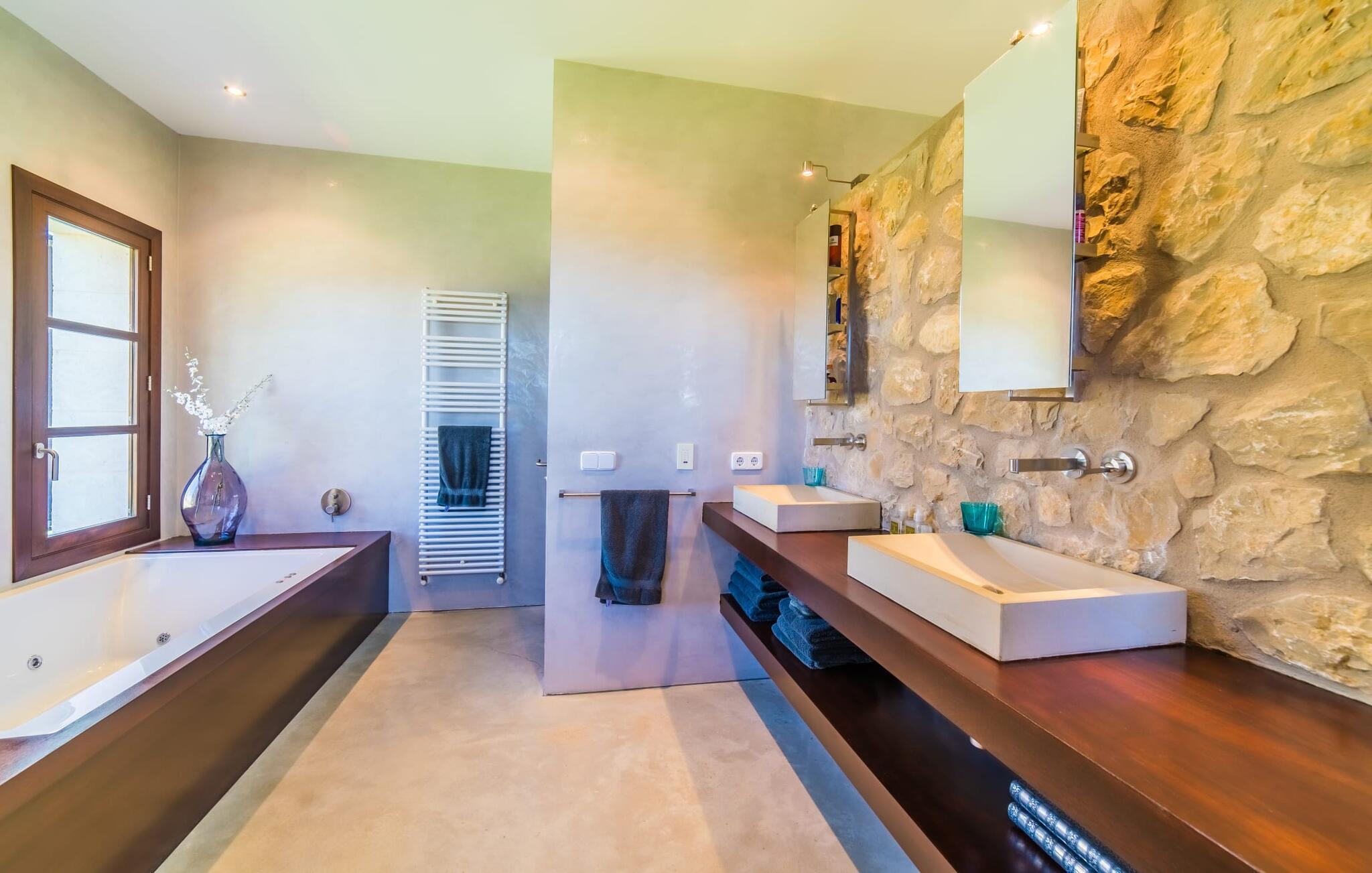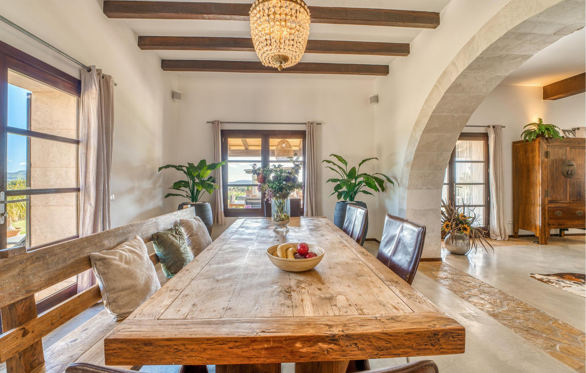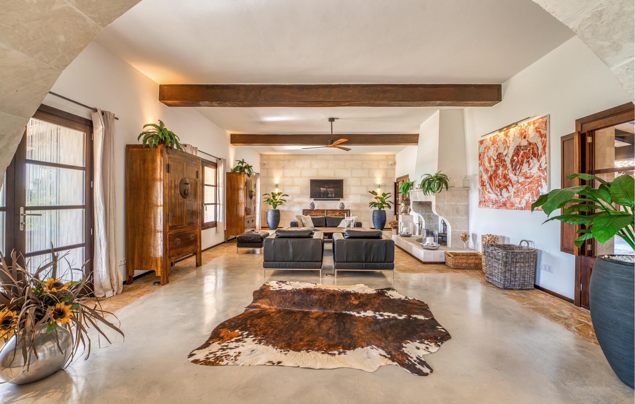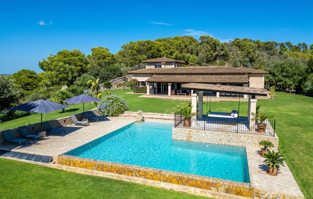 Majestätisch verteidigt sie ihre Anhöhe(n) mit einer langen Auffahrt, damit unerwünschte Besucher – hier sind übrigens auch Kinder herzlich willkommen – nicht zu nahe kommen oder die Ruhe ihrer Gäste stören – doch ihre weit verstreuten Nachbarn legen Wert auf ihre Privatsphäre Also. So offen und entgegenkommend die Villa – die sogar über einen Turm verfügt – auch wirkt, man erwartet eigentlich nicht, dass im Inneren große Überraschungen auf einen warten. Neben der Terrasse, ausgestattet mit exquisiten Rattan-Loungemöbeln und einem langen Esstisch, sticht der L-förmige Pool mit eigenem Minigarten hervor; Den Pool erreichen Sie über einen spielerisch angelegten Steinweg über den Rasen, der Sie sicher zu den breiten Stufen führt, die in den Pool hinunterführen. Auf der Poolterrasse erwarten Sie Liegestühle und Sonnenschirme mit herrlichem Blick auf die grüne mallorquinische Landschaft. Wenn Sie möchten, können Sie das Gelände zu Fuß erkunden, vielleicht bei einem schönen Nachmittagsspaziergang. Möglicherweise brauchen Sie einen Spaziergang, nachdem Sie auf dem fantastischen Gasgrill experimentiert haben, der für viele der perfekte Ort ist, um ihren kulinarischen Säften freien Lauf zu lassen.