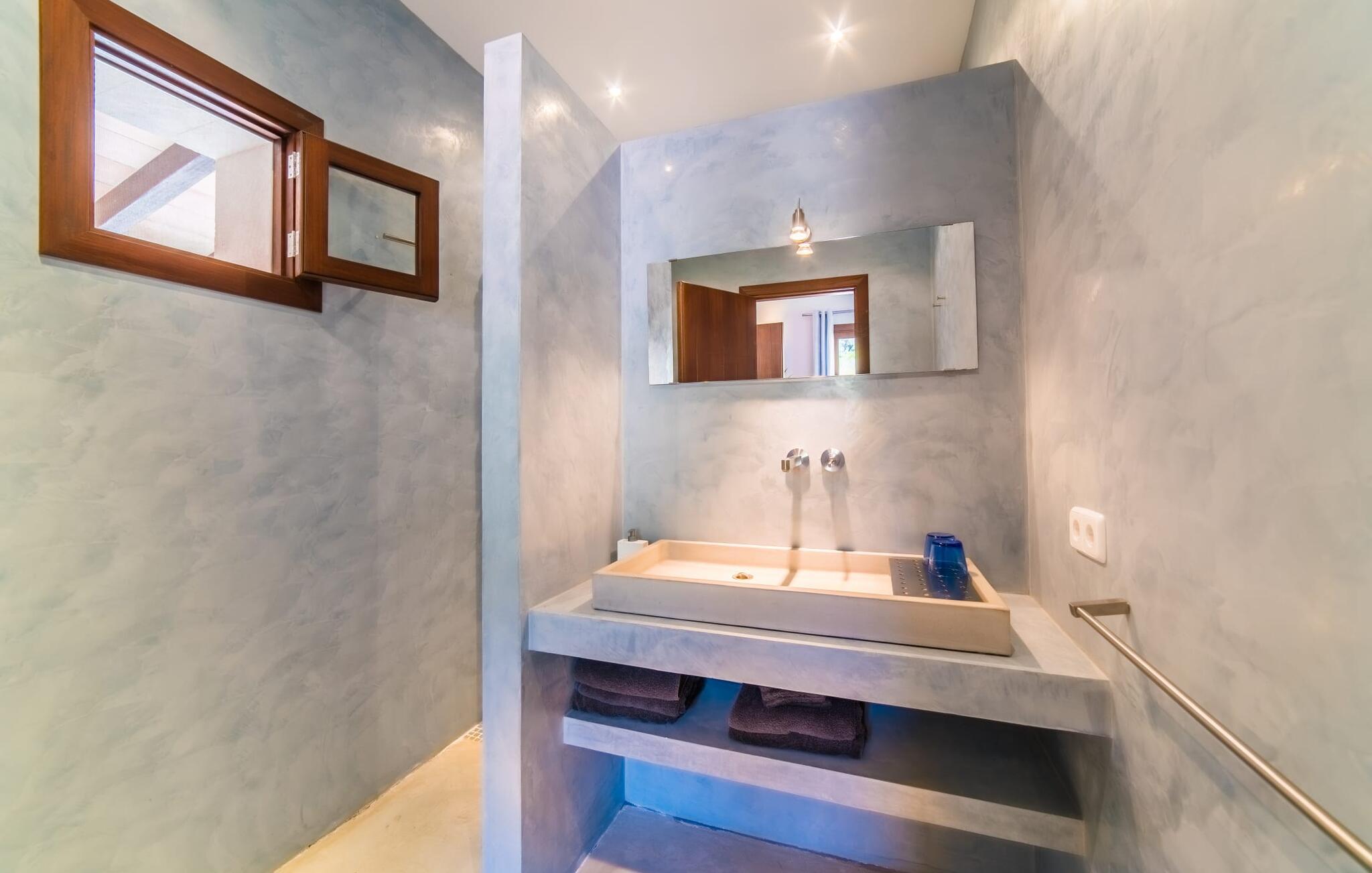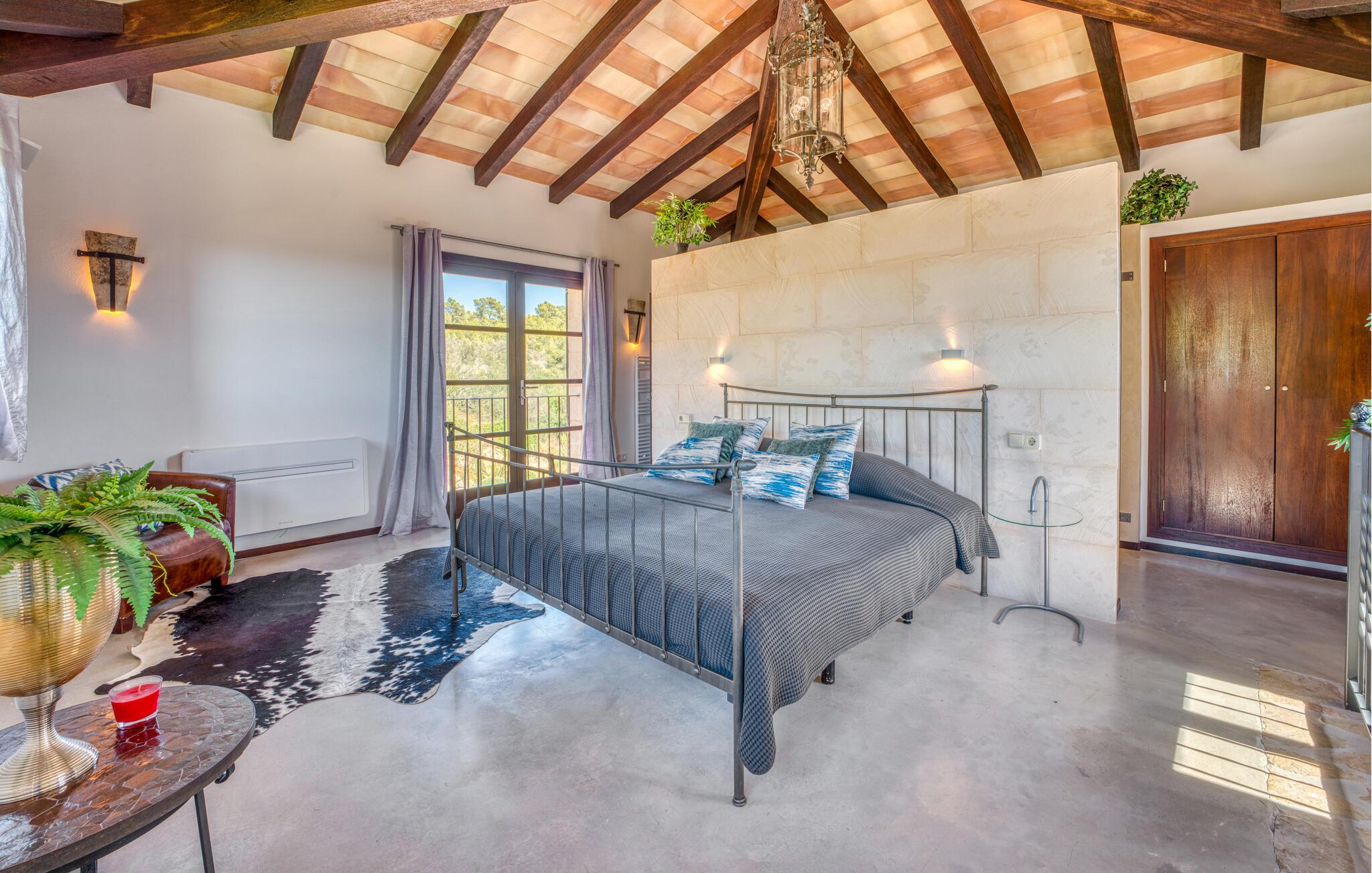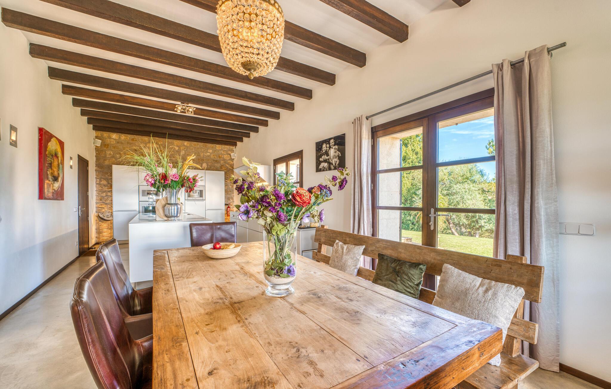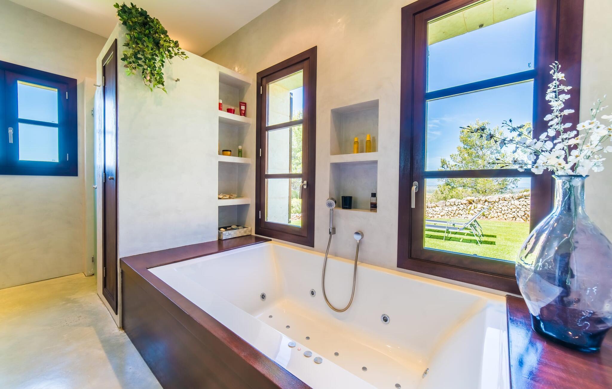 Majestätisch verteidigt sie ihre Anhöhe(n) mit einer langen Auffahrt, damit unerwünschte Besucher – hier sind übrigens auch Kinder herzlich willkommen – nicht zu nahe kommen oder die Ruhe ihrer Gäste stören – doch ihre weit verstreuten Nachbarn legen Wert auf ihre Privatsphäre Also. So offen und entgegenkommend die Villa – die sogar über einen Turm verfügt – auch wirkt, man erwartet eigentlich nicht, dass im Inneren große Überraschungen auf einen warten. Neben der Terrasse, ausgestattet mit exquisiten Rattan-Loungemöbeln und einem langen Esstisch, sticht der L-förmige Pool mit eigenem Minigarten hervor; Den Pool erreichen Sie über einen spielerisch angelegten Steinweg über den Rasen, der Sie sicher zu den breiten Stufen führt, die in den Pool hinunterführen. Auf der Poolterrasse erwarten Sie Liegestühle und Sonnenschirme mit herrlichem Blick auf die grüne mallorquinische Landschaft. Wenn Sie möchten, können Sie das Gelände zu Fuß erkunden, vielleicht bei einem schönen Nachmittagsspaziergang. Möglicherweise brauchen Sie einen Spaziergang, nachdem Sie auf dem fantastischen Gasgrill experimentiert haben, der für viele der perfekte Ort ist, um ihren kulinarischen Säften freien Lauf zu lassen.