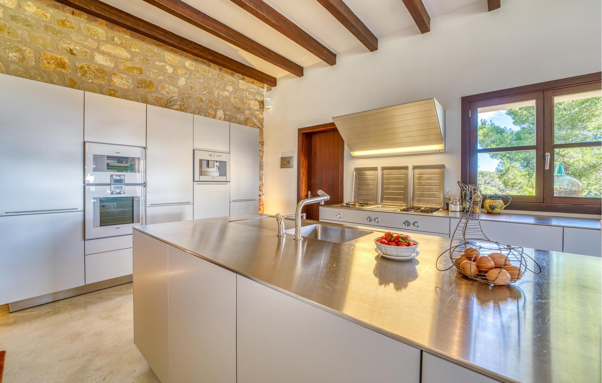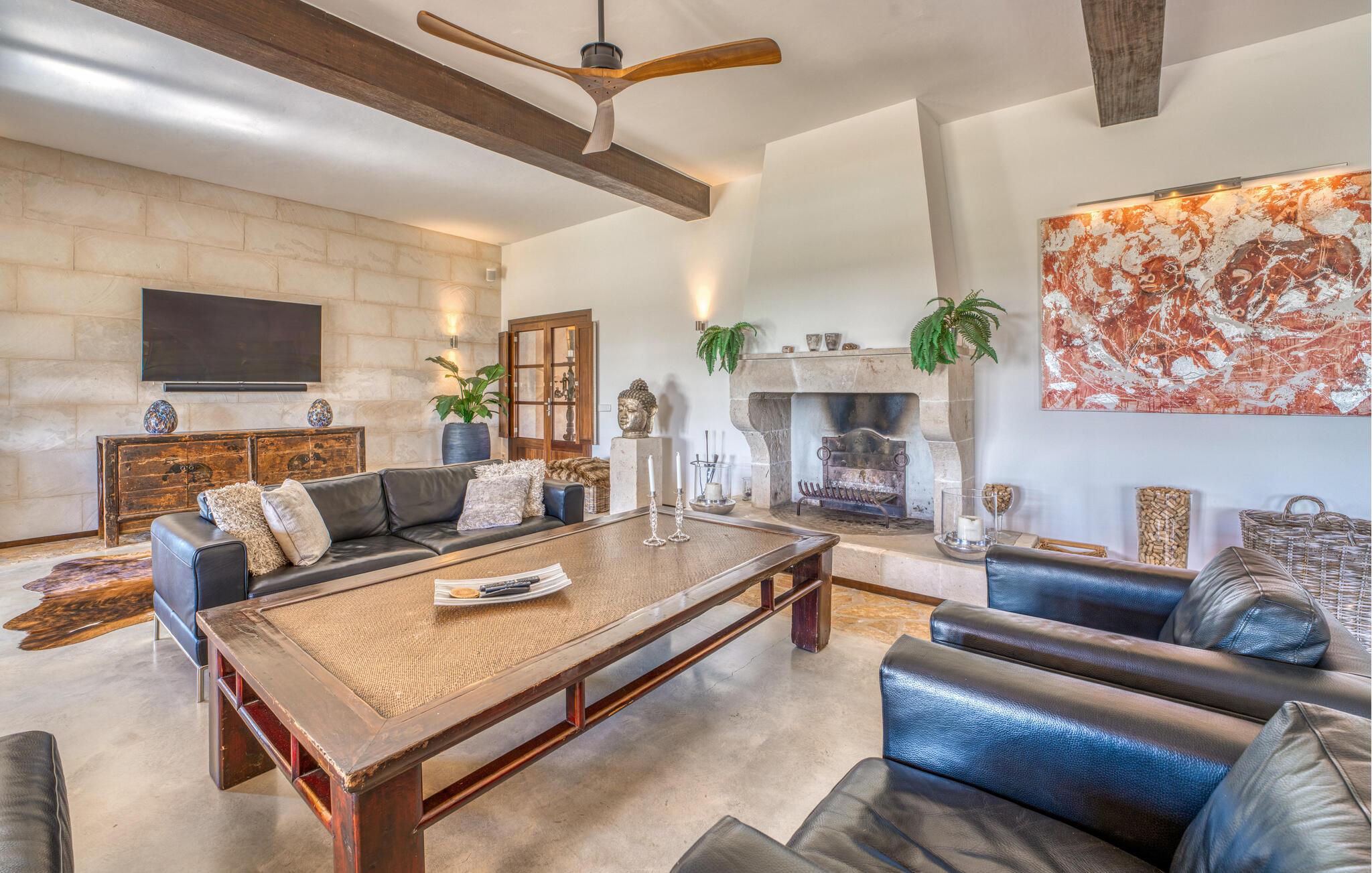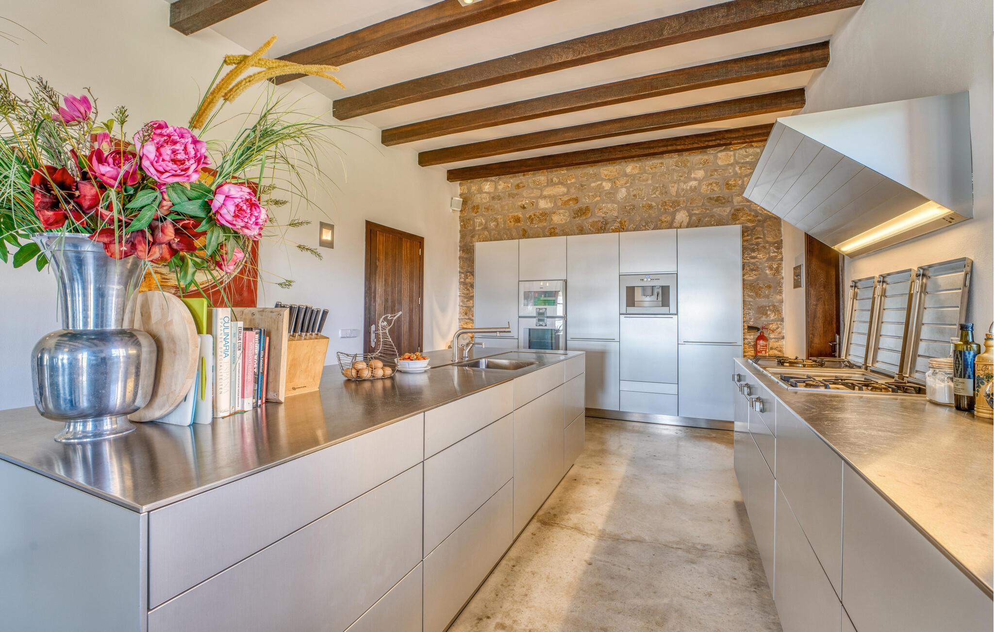 Die große Überraschung, die „Da Na Bibiana“ bereithält, ist natürlich der charmant gestaltete Innenhof mit einem antiken Brunnen an der sonnigen Stelle in der Mitte – drei der vier Schlafzimmer mit eigenem Bad sind von hier aus zugänglich (das vierte hat der Turm eine Etage höher ganz für sich allein). Auf diese Weise können Sie Luft und Freiraum genießen, sowohl zum Innenhof als auch zum Garten oder sogar zur jeweils eigenen Terrasse hin; Große Tierfelle liegen auf dem Boden, bequeme Sessel bieten einen erholsamen Rückzugsort, Natursteinelemente verleihen den Räumen das gewisse Etwas und XXL-Doppelbetten versprechen ungestörten Schlaf. In einem der Zimmer wurde zudem ein begehbarer Kleiderschrank versteckt. Die privaten, pastellfarbenen Badezimmer sind komfortabel ausgestattet, teilweise mit Doppelwaschbecken, Badewanne, begehbarer Dusche und Handtuchwärmer – gerade im Urlaub möchte man sie nicht mit anderen teilen; Stattdessen möchten Sie in der Lage sein, sich in Ihrem eigenen Tempo fortzubewegen. Besonders beliebt ist auch der große, asiatisch inspirierte Wohnbereich mit Flatscreen-TV und Kamin: ein idealer Ort für Whiskey-Gespräche mit den Jungs, während die Damen es sich draußen auf den Korbsesseln bei einem Glas Wein gemütlich machen Prosecco. Das Einzige, was geklärt werden muss, ist, wer für die Küche verantwortlich ist, obwohl es nicht gerecht wird, es einfach nur Küche zu nennen: Es handelt sich um ein offenes Wunderwerk aus Edelstahl, komplett mit Milchaufschäumer, Küchenmaschine, Herdabdeckungen und Saftmixer – alles griffbereit! Hier wird vielleicht sogar ein überzeugter Fast-Food-Fan zum Maestro de las ensaladas!