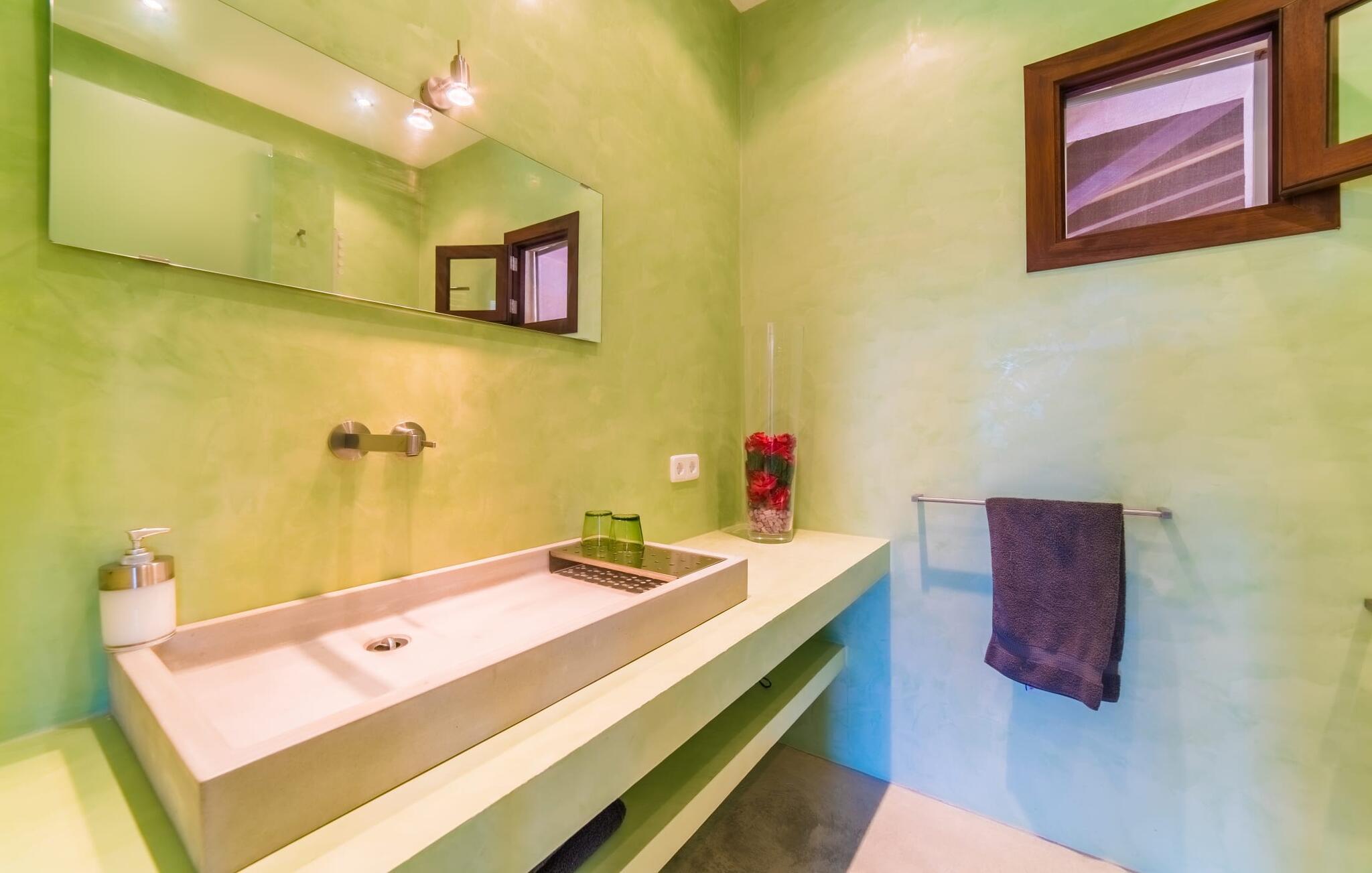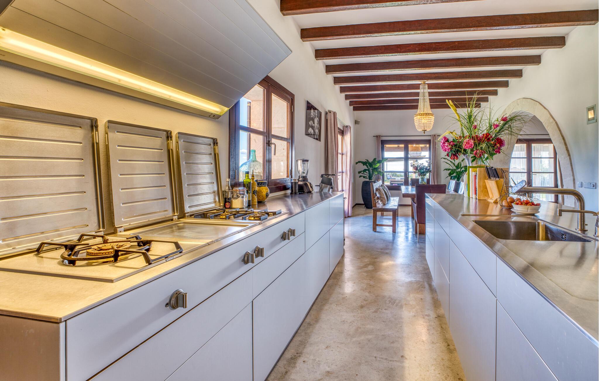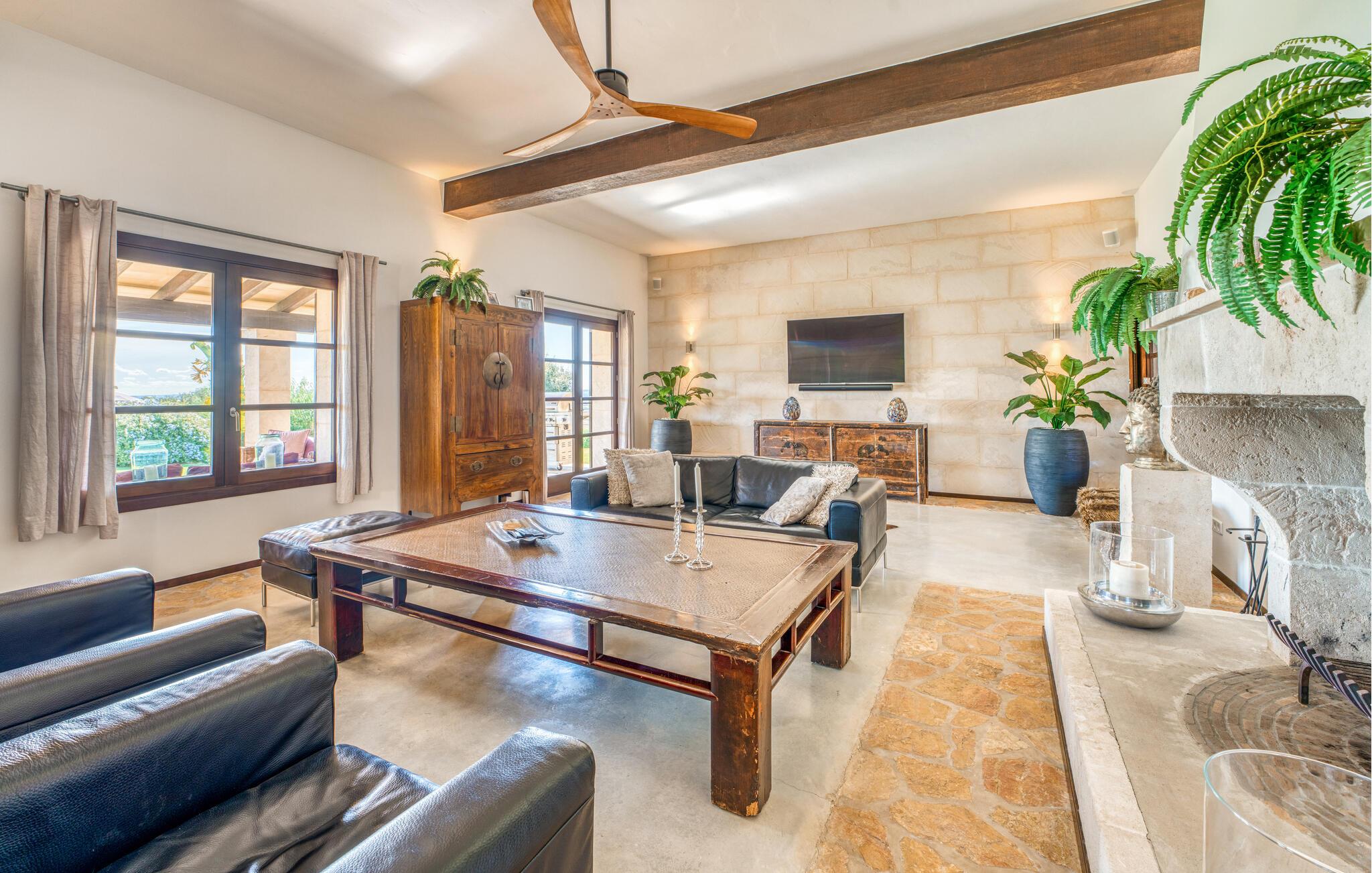 Die große Überraschung, die „Da Na Bibiana“ bereithält, ist natürlich der charmant gestaltete Innenhof mit einem antiken Brunnen an der sonnigen Stelle in der Mitte – drei der vier Schlafzimmer mit eigenem Bad sind von hier aus zugänglich (das vierte hat der Turm eine Etage höher ganz für sich allein). Auf diese Weise können Sie Luft und Freiraum genießen, sowohl zum Innenhof als auch zum Garten oder sogar zur jeweils eigenen Terrasse hin; Große Tierfelle liegen auf dem Boden, bequeme Sessel bieten einen erholsamen Rückzugsort, Natursteinelemente verleihen den Räumen das gewisse Etwas und XXL-Doppelbetten versprechen ungestörten Schlaf. In einem der Zimmer wurde zudem ein begehbarer Kleiderschrank versteckt. Die privaten, pastellfarbenen Badezimmer sind komfortabel ausgestattet, teilweise mit Doppelwaschbecken, Badewanne, begehbarer Dusche und Handtuchwärmer – gerade im Urlaub möchte man sie nicht mit anderen teilen; Stattdessen möchten Sie in der Lage sein, sich in Ihrem eigenen Tempo fortzubewegen. Besonders beliebt ist auch der große, asiatisch inspirierte Wohnbereich mit Flatscreen-TV und Kamin: ein idealer Ort für Whiskey-Gespräche mit den Jungs, während die Damen es sich draußen auf den Korbsesseln bei einem Glas Wein gemütlich machen Prosecco. Das Einzige, was geklärt werden muss, ist, wer für die Küche verantwortlich ist, obwohl es nicht gerecht wird, es einfach nur Küche zu nennen: Es handelt sich um ein offenes Wunderwerk aus Edelstahl, komplett mit Milchaufschäumer, Küchenmaschine, Herdabdeckungen und Saftmixer – alles griffbereit! Hier wird vielleicht sogar ein überzeugter Fast-Food-Fan zum Maestro de las ensaladas!