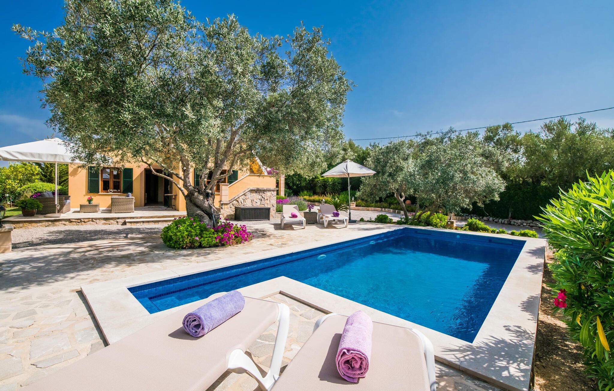 Die Villa „Desol“ ist ein Ferienhaus, das seinesgleichen sucht. In wunderschöner Lage, weniger als fünf Kilometer von Artà entfernt, ist es von Magie umgeben, die schon beim ersten Betreten des Anwesens spürbar wird. Es sind die liebevollen Details und das Gespür für stilvolle Kompositionen, die die besondere Ästhetik ausmachen, die bereits auf den ersten Blick sehr einladend wirkt. Die Villa wurde 2011 komplett renoviert und renoviert. Glücklicherweise wurden bei der Neugestaltung des Gartens und der Campos die alten Oliven- und Algarrobabäume beibehalten. Dadurch entsteht ein sehr gelungener Kontrast zum modernen Erscheinungsbild des Hauses. Im Jahr 2013 kam eine eigene lizenzierte Bohrung hinzu. Die Pflanzen und der Rasen werden mit einer automatischen Bewässerung versorgt. Hübsche Kies-, Gras- und Terrassenflächen prägen das Gelände. In seiner Mitte liegt der hübsche Pool, der dekorativ gefliest und über eine Treppe erreichbar ist. Auf den bequemen Liegestühlen können Sie nach Lust und Laune in der Sonne entspannen und die wunderschöne Urlaubszeit ausgiebig genießen. Insgesamt drei Sonnenschirme stehen bereit, um Sie vor übermäßiger UV-Strahlung zu schützen. Zwei Terrassenflächen am Haus, eine davon überdacht, laden ebenfalls zum Verweilen ein. Zur Verfügung stehen gemütliche Polyrattan-Loungemöbel sowie ein Esstisch zum gemeinsamen Essen. Das Frühstück ist hier zweifellos genauso ein Genuss wie das kulinarische Abendessen am Abend. Auch der Grill lädt garantiert zu einem herzhaften Barbecue ein.