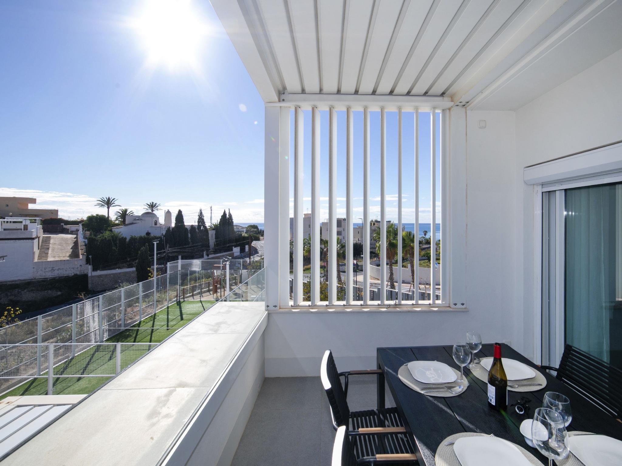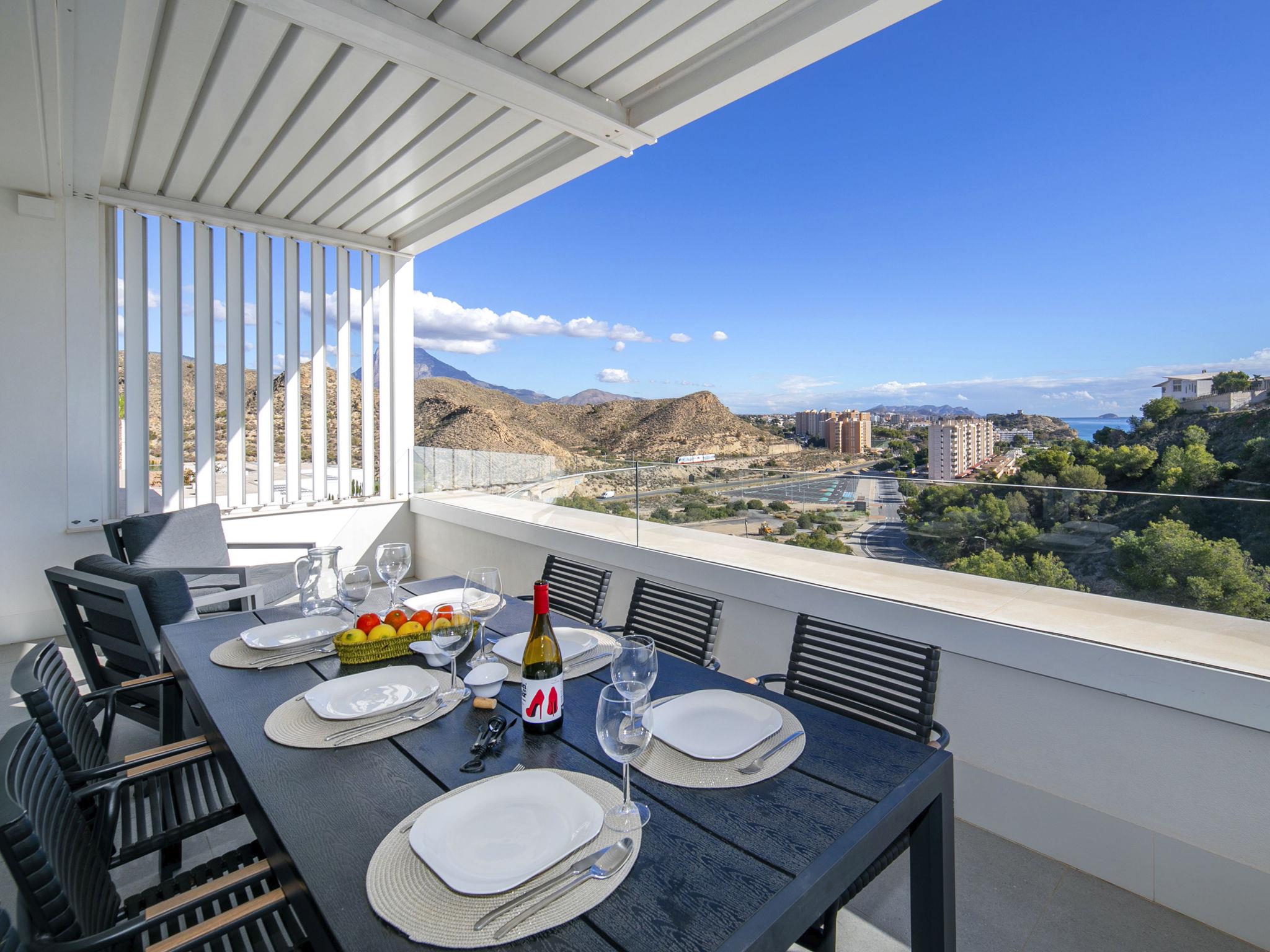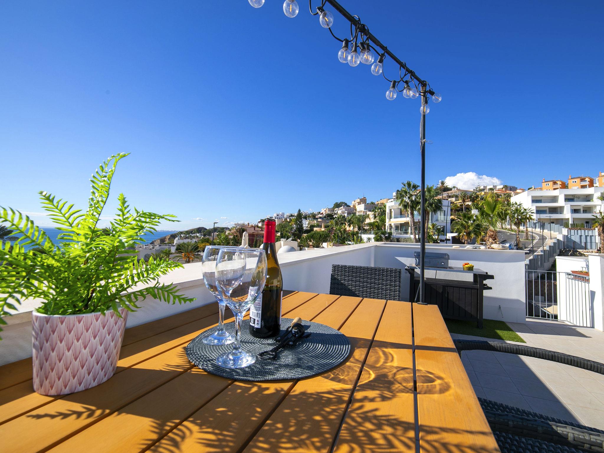 "Urbanizacion Blueviews", 3-room apartment 170 m2 on 2 levels. Object suitable for 4 adults. Spacious and bright, comfortable and tasteful furnishings: living/dining room 27 m2 with digital TV, air conditioning and forced-air heating. Exit to the terrace. 8 m2, 1 room with 1 french bed (150 cm, length 190 cm), shower/WC, air conditioning and forced-air heating. Exit to the terrace. 9 m2, 1 room with 2 beds (90 cm, length 190 cm), air conditioning and forced-air heating. Open kitchen (oven, dishwasher, 3 ceramic glass hob hotplates, toaster, kettle, microwave, freezer, electric coffee machine). Shower/WC. Large terrace 20 m2, large terrace 86 m2. Terrace furniture, barbecue, deck chairs. Distant view of the sea and the mountains. Facilities: washing machine, iron, hair dryer. Internet (WiFi, free). Parking space n 16. Please note: non-smokers only. VT-509203-A // Reg. Nr.: ESFCTU00000307900077281800000000000000000VT-509203-A6