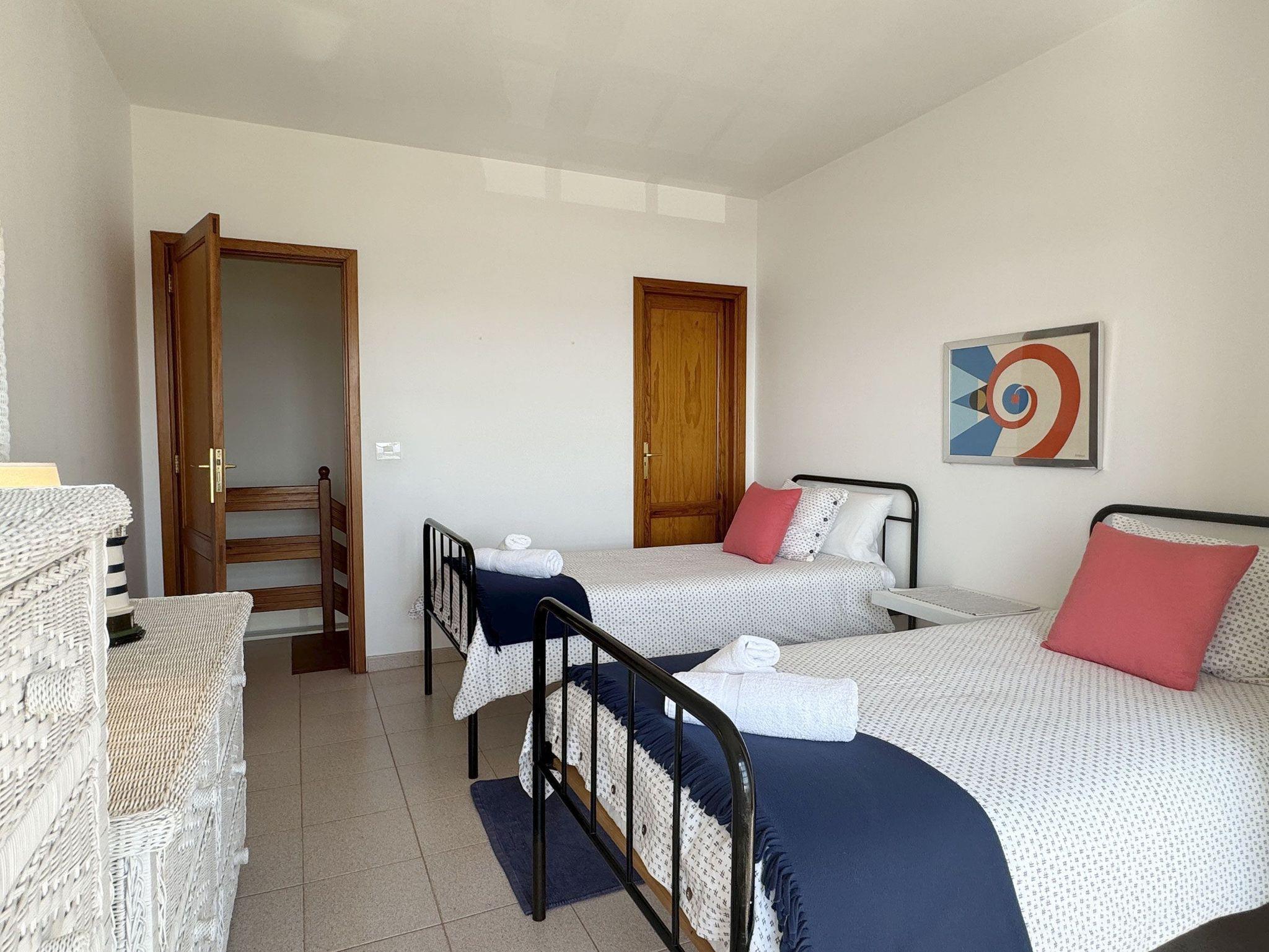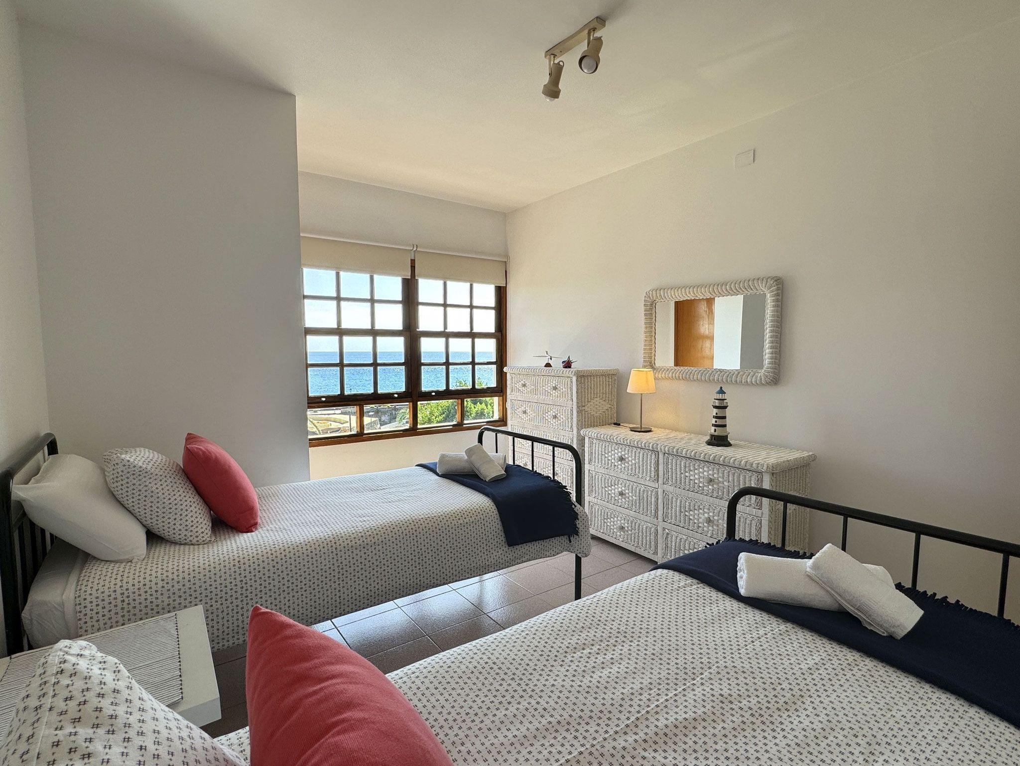 Im Obergeschoss befindet sich ein Schlafzimmer mit einem französischen Doppelbett und sowie einem Sitzplatz am Fenster mit Blick auf das Meer. Das zweite Schlafzimmer ist mit zwei Einzelbetten ausgestattet. In 2 Rattankommoden und einem kleinen Abstellraum findet das Urlaubsgepäck Platz.