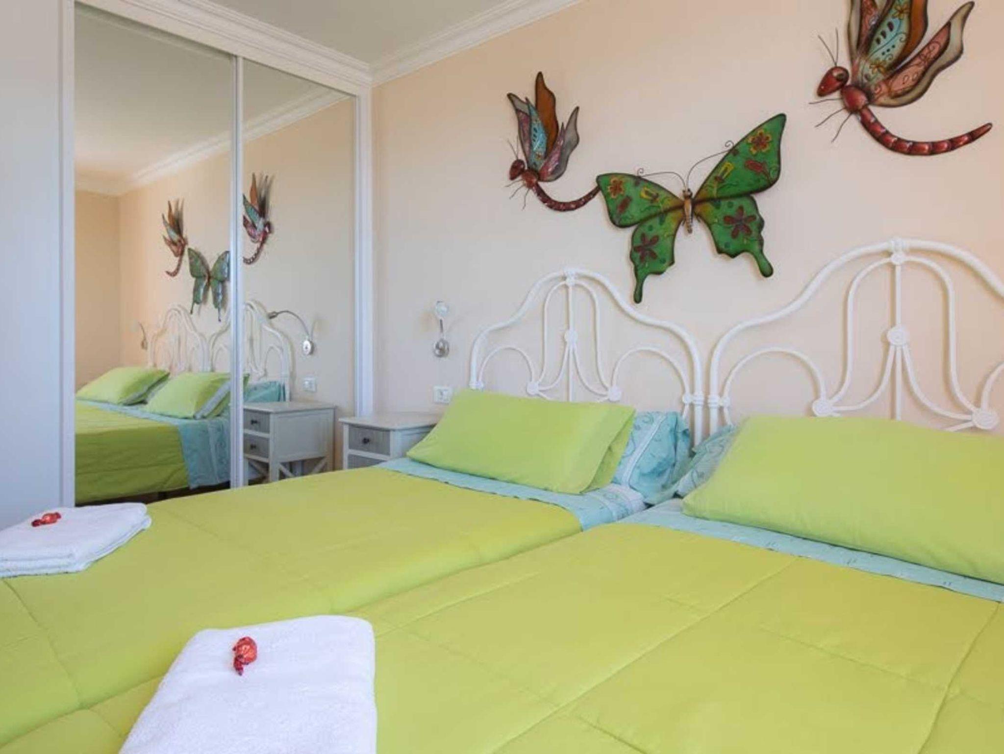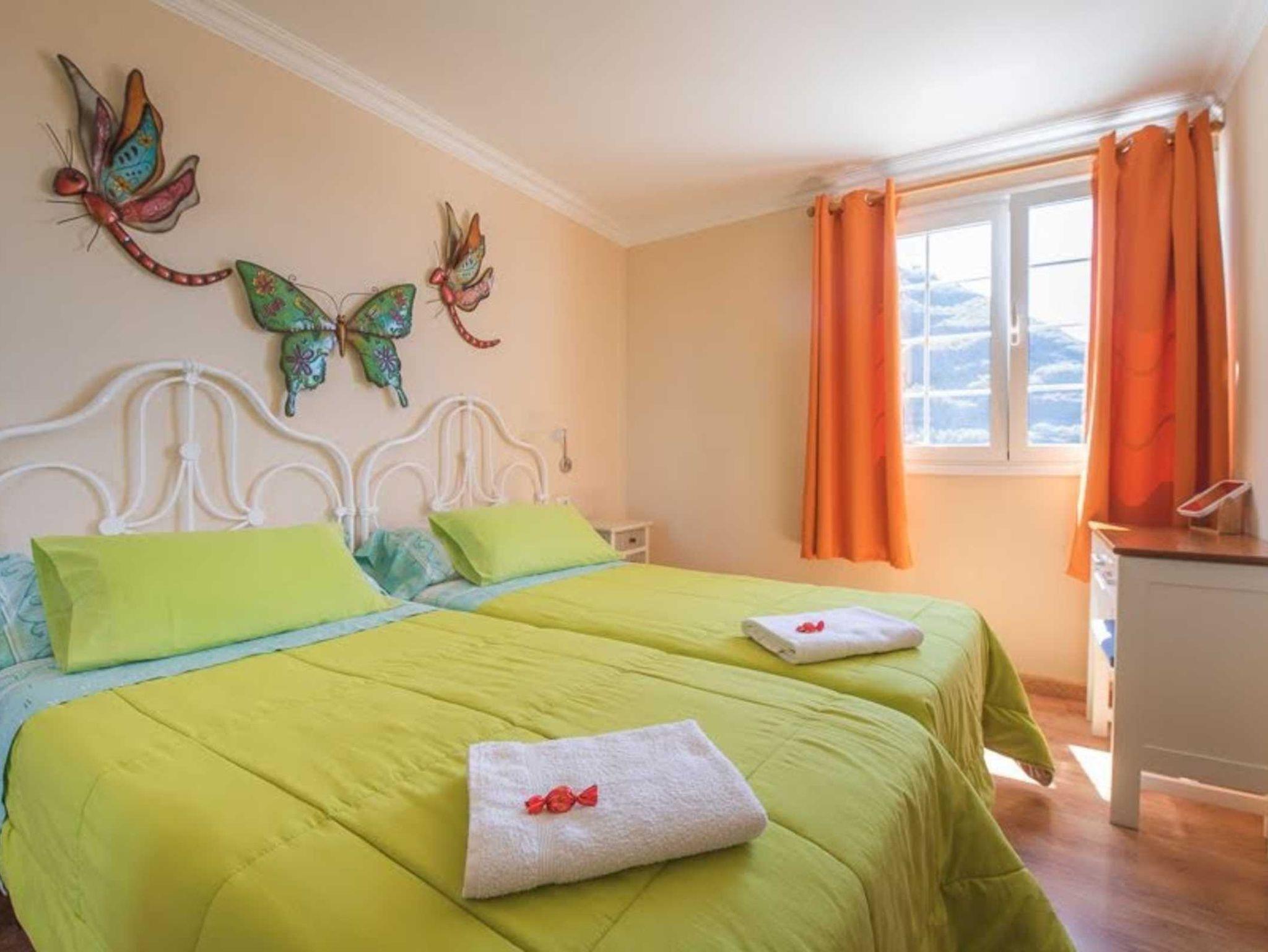 El dormitorio también da a la zona peatonal. Cuenta con dos camas individuales juntas, una cómoda y un amplio armario con espejo.