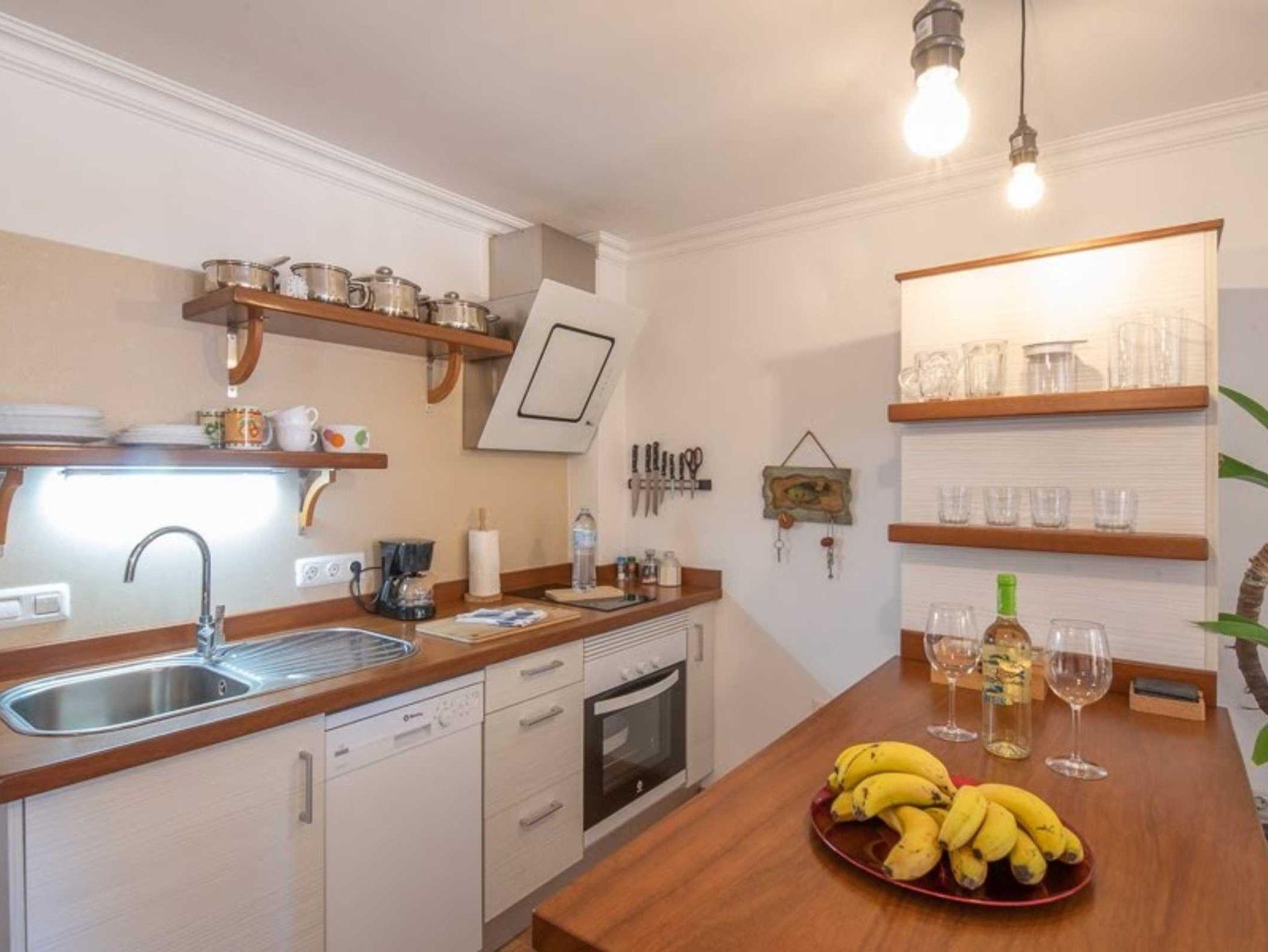 La cocina americana está perfectamente equipada para unas vacaciones: una placa de inducción de dos fuegos con una elegante campana extractora, horno, microondas e incluso lavavajillas.