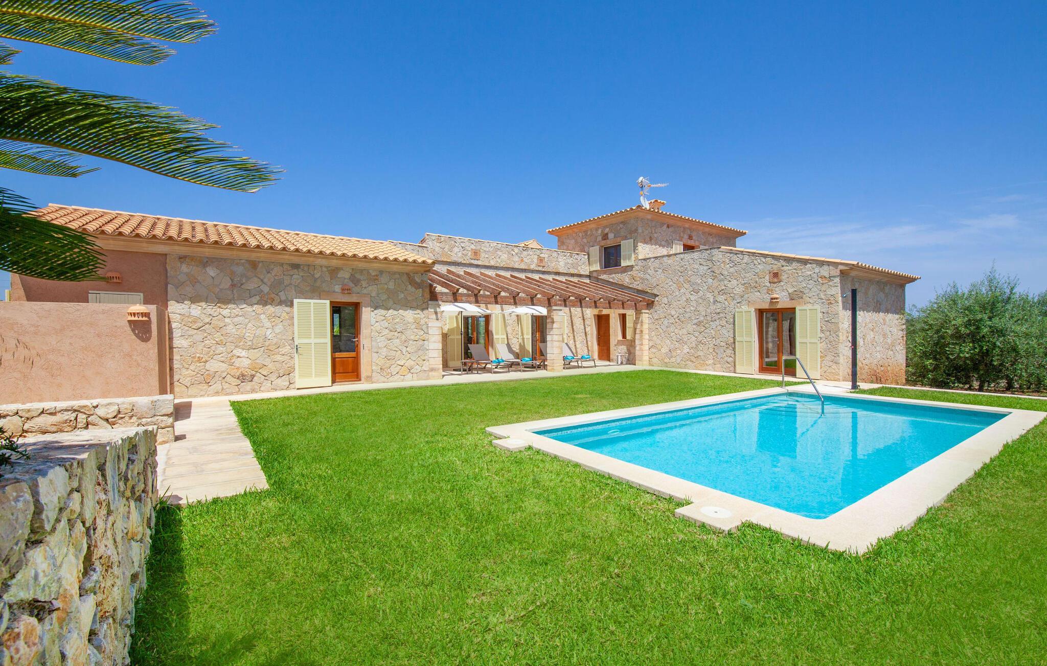 Zwischen sanften Hügeln und weitem Himmel, umgeben von Oliven und Palmen, offenbart sich Ihnen die moderne Mietfinca „Fetget Can Bosco“. Das Ferienhaus ist mit Bruchstein verkleidet und verfügt über Holzfenster mit natürlichem Charme. Damit fügt es sich perfekt in die sanfte Landschaft des Ostens Mallorcas ein, deren Charme sich auf die Atmosphäre der Finca überträgt. Genießen Sie den Rasenpool – völlig abgeschieden und privat. Auf zahlreichen Sitzplätzen im Freien können Sie die mediterrane Ruhe genießen: Auf der teilweise überdachten Veranda stehen bequeme Sonnenliegen mit Sonnenschirm, sodass Sie beim Entspannen den Pool im Blick haben. Unter der überdachten Terrasse auf der anderen Seite des Hauses befindet sich ein lauschiger Essbereich – dort erwartet Sie ein idealer Frühstücksplatz vor der phänomenalen Kulisse der ganzjährig grünen Küstenlandschaft. Der spektakuläre Ausblick wiederholt sich auf der sonnendurchfluteten Dachterrasse im Obergeschoss, von der aus das Panorama noch malerischer wirkt.