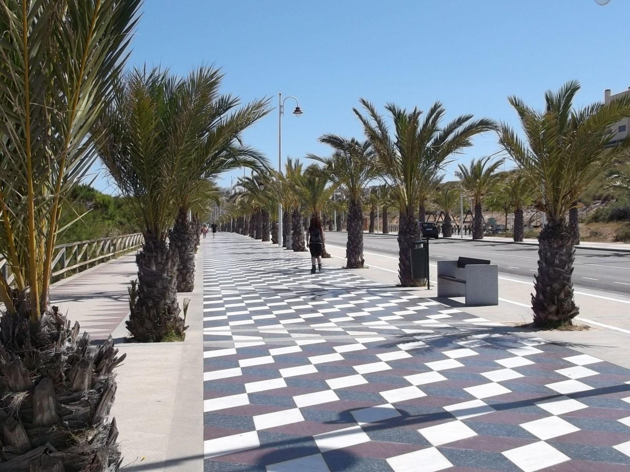 The distance to the sea is only 800 m and you can walk this distance in 15 minutes while admiring the Mediterranean vegetation: bougainvillea, jasmine, oleanders and palm trees. Gran Alacant is a quiet seaside village located on the Costa Blanca 12 km south of Alicante, 5 km from the centre of the pretty tourist village of Santa Pola and just 9 km from Alicante International Airport. Gran Alacant is located directly by the sea, on the charming sandy beach of Carabassi, which has boasted the Blue Flag for many years. Adjacent to the beach is a wide stretch of dunes with tropical vegetation under protection and a nature reserve forming part of the so-called El Paraje Natural Municipal Clot de Galvany. The nature park separates Gran Alacant to the north from the village of Arenales del Sol, which is lively in high season and offers all the usual attractions of a tourist destination. The two villages are connected by a beautiful palm-shaded seafront promenade, a favourite place for afternoon and evening strolls; and it takes approximately 40 minutes to walk from one village to the other. At the entrance to Gran Alacant, approximately 1800 m from the flat, there is a shopping centre with numerous restaurants and shops including Burger King, Mercadona, Lidl, Consum.