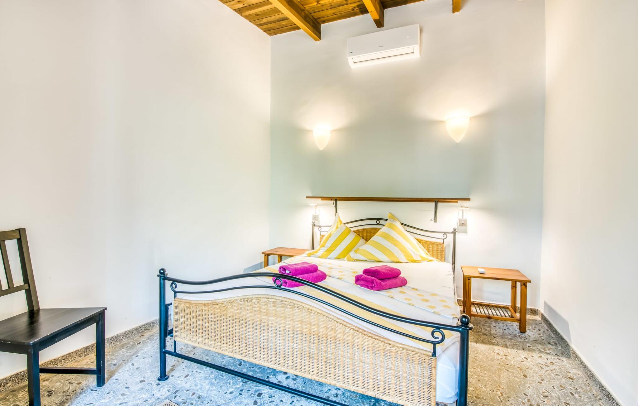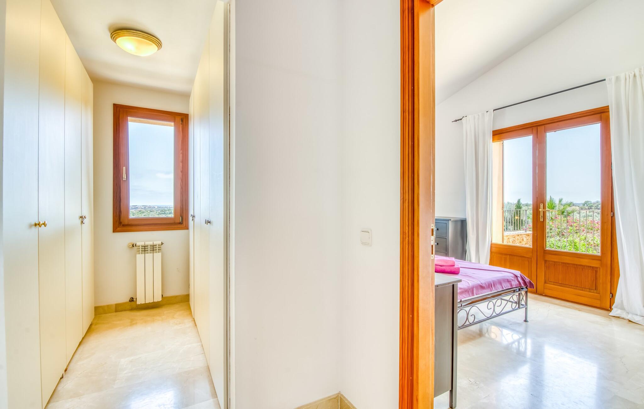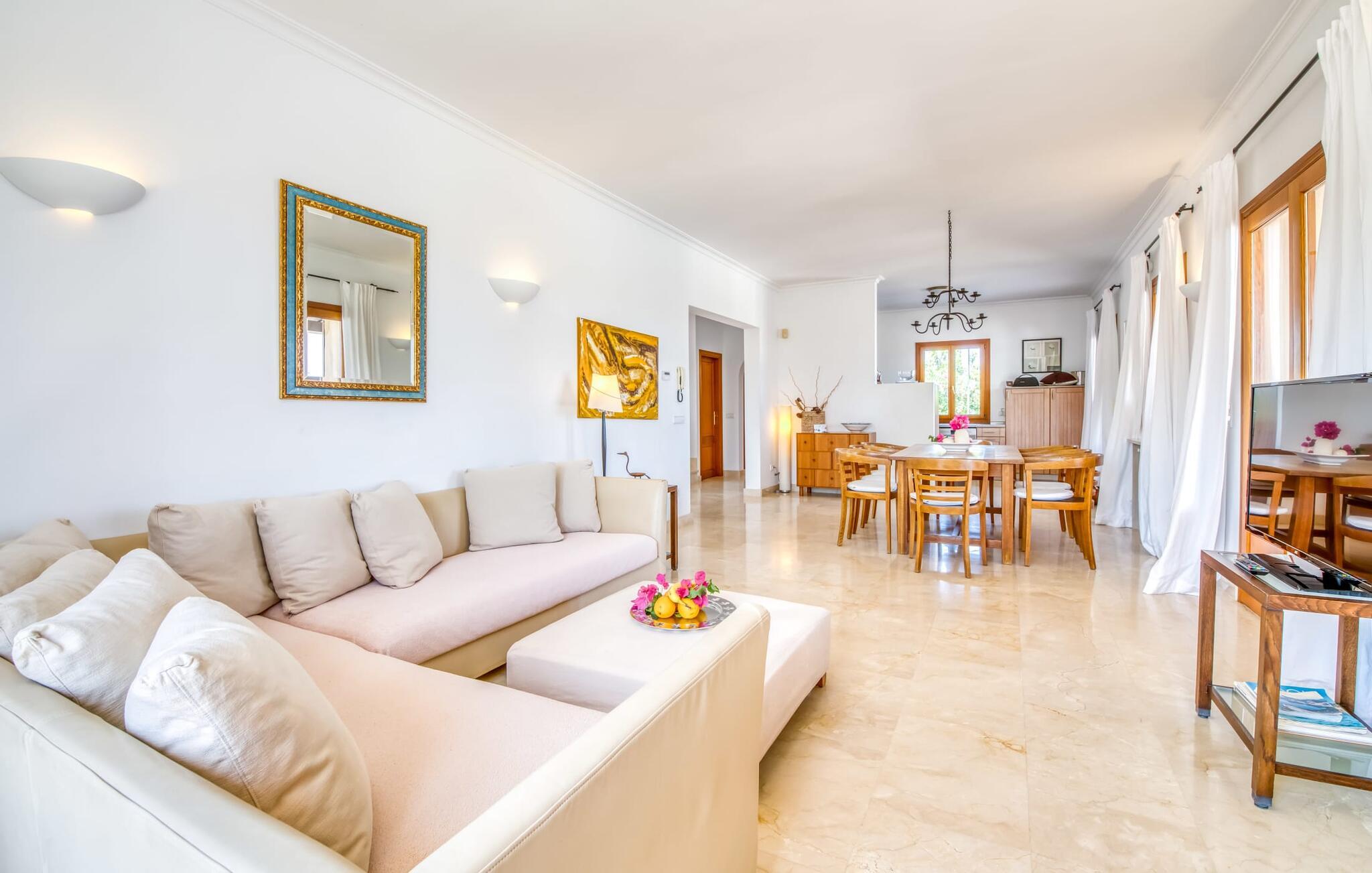 Im Inneren der Villa ist die Villa elegant mit Marmor gestaltet und mit Möbeln des Designers Günter Lambert ausgestattet. Der offene Wohn- und Essbereich verfügt über einen großen Esstisch, bequeme Sofas, moderne Annehmlichkeiten und eine voll ausgestattete Küche. Das Haupthaus verfügt über vier Doppelschlafzimmer und drei Bäder (zwei en suite), während das rustikal gestaltete Gästehaus zwei weitere Schlafzimmer (klimatisiert) und ein Badezimmer bietet. Die Zentralheizung sorgt das ganze Jahr über für Komfort.