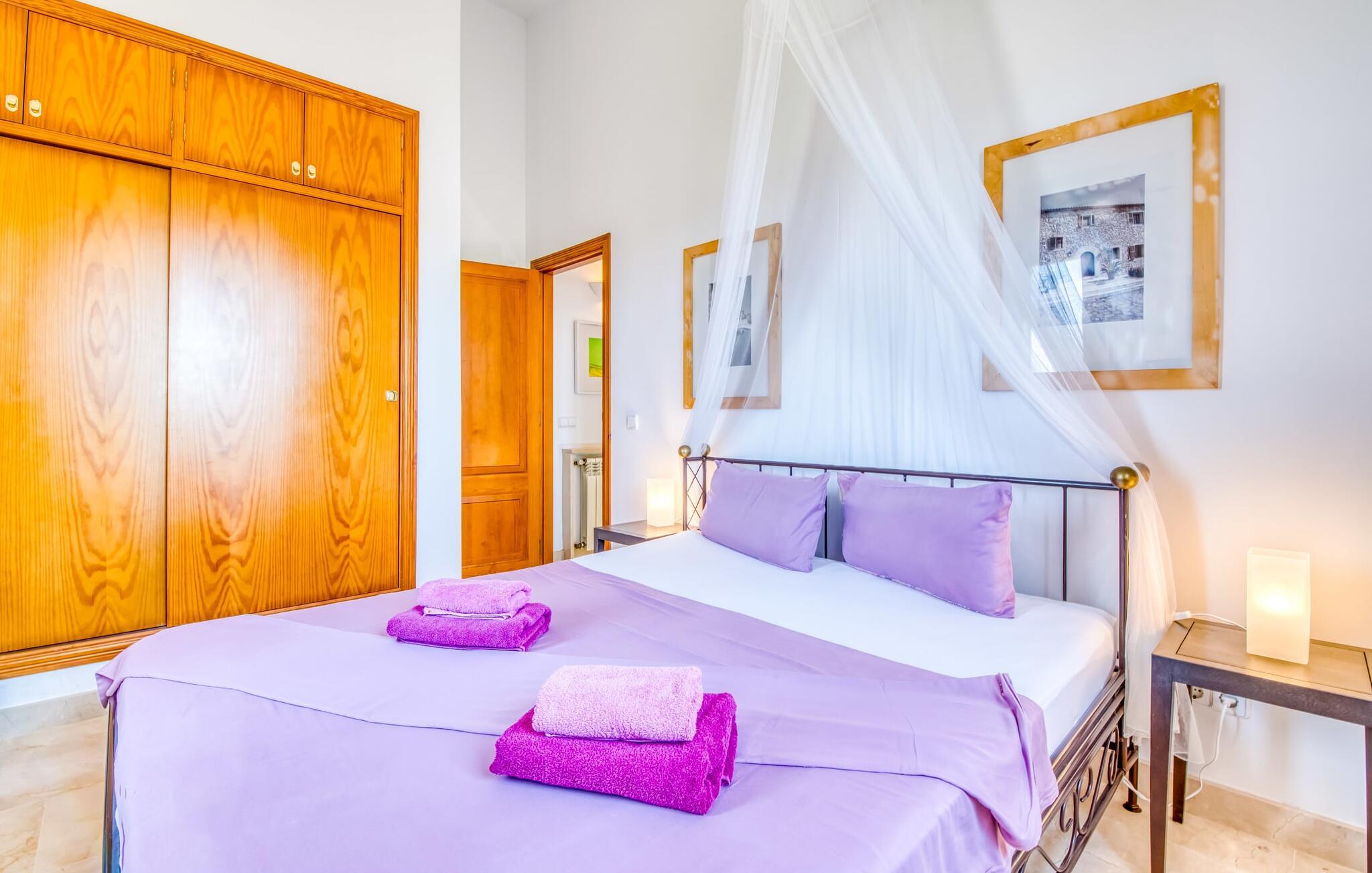 Das Prunkstück der Villa ist die weitläufige Poolterrasse, die einen atemberaubenden 180°-Meerblick bietet. Die kühle, weiße Terrasse aus Marés-Stein verfügt über zwei 60 Jahre alte Palmen, die Schatten und Ambiente spenden, neben einem beleuchteten Pool, Liegestühlen, Sonnenschirmen und einer großen Veranda mit großem Schiebedach. Eine geflieste Außendusche trägt zum Komfort bei. Der Außenbereich umfasst auch eine gemütliche Terrasse mit Pergola, ein Gästehaus mit eigener Terrasse mit Meerblick und einen überdachten Grill- und Barbereich - perfekt für Mahlzeiten bei Sonnenuntergang. Der rustikale Essbereich bietet Platz für 12 Personen und ist mit einem offenen Kamin, einem Gasgrill und einem mallorquinischen Backofen ausgestattet.