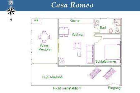 This 60 m² detached holiday home, the "Casa Romeo", boasts a large, bright, open plan living room. The house is furnished with modern furnishings, including a fireplace, a large sofa, a dining table for four and a kitchen unit. The kitchen unit is equipped with a four burner ceran stove, an oven/microwave/grill, a refrigerator, a toaster, a coffee maker, a kettle and a juicer. The spacious bedroom is furnished with a large double bed (2 x 0.90 m x 2.00 m) and a wardrobe. The adjacent bathroom boasts a hairdryer, a mirror, a shower with massage jets, a toilet, a bidet and electric heating. The flat has Wi-Fi, satellite television, radio and central heating. Towels, bath robes and bedding are supplied. Dine al fresco or under the pergola on the Westside of the house, protected from the sun and views; sun bathe on the patio on the south side of the house. In the garden in front of and near the house is a pavilion with a table and chairs, a sun terrace with sun loungers and an outdoor chess board which is communally used.