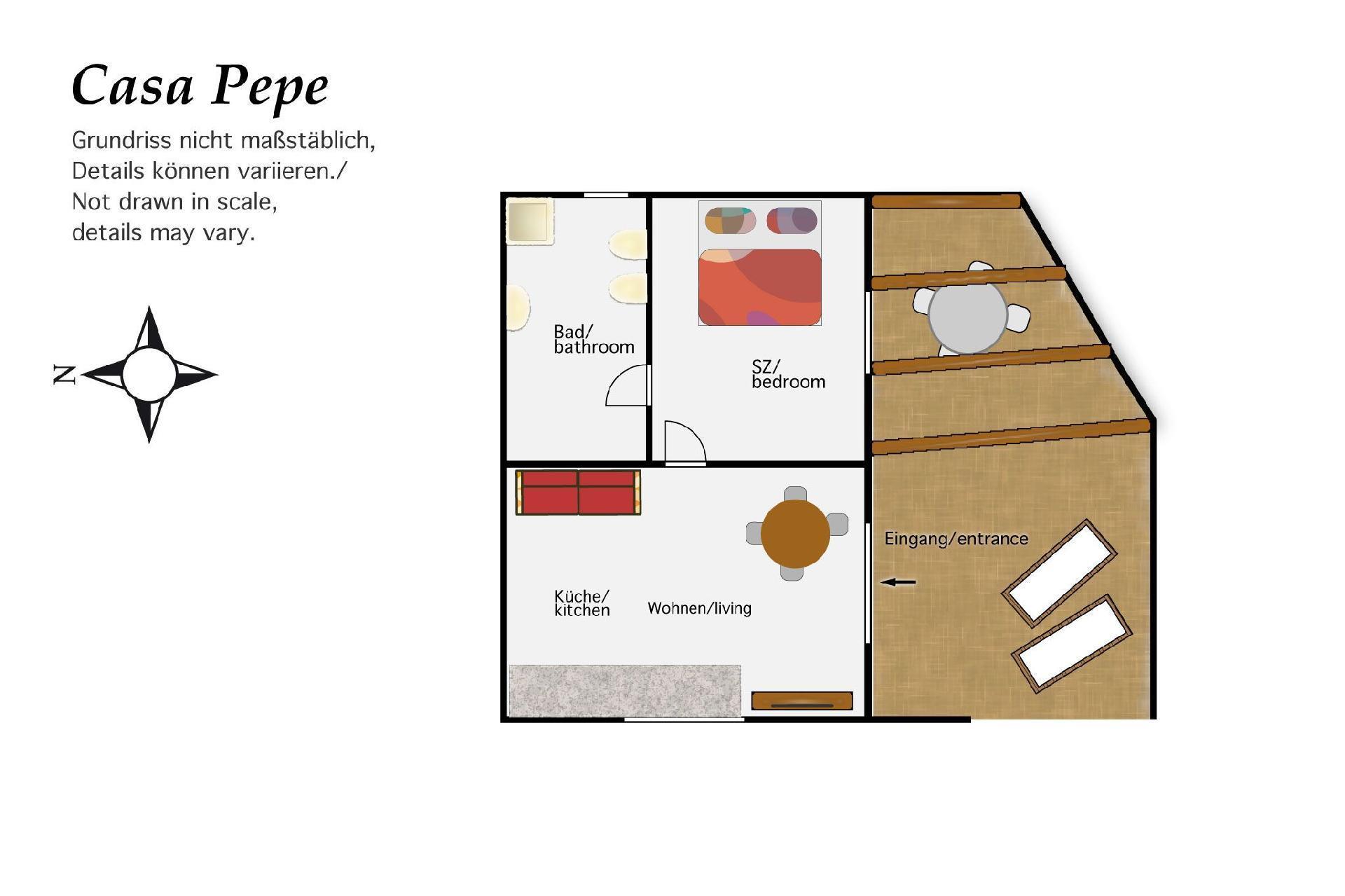 The “Casa Pepe” holiday house measuring 55m² provides an open living room with a kitchen unit and dining space, a bedroom and a bathroom. The kitchen unit is equipped with a dishwasher, a four-ring ceramic hob, a microwave, a fridge, sink, toaster, coffee machine, juicer and kettle. The living room has a dining table for four people, a sofa bed for two people for relaxing, and a stove for heating on cooler days. The bedroom is furnished with a comfortable double bed (two mattresses each 90 x 200cm) and has an en-suite bathroom with a shower and massage jets, a hairdryer, mirror, toilet, bidet and washbasin. Wireless Internet access, satellite TV and a radio with a CD player are provided. Plenty of towels, bathrobes and bed linen are available.