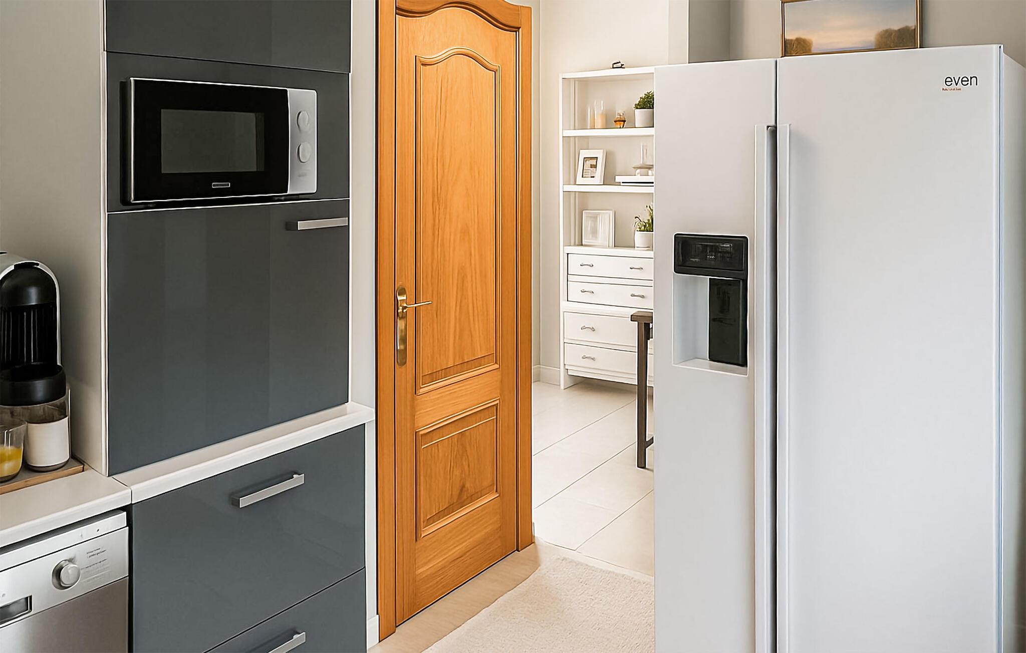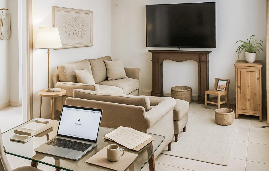 Machen Sie es sich auf dem großzügigen Sofa im Wohnbereich bequem und planen Sie bei einer Tasse Kaffee Ihre nächsten Ausflüge. Der große Fernseher sorgt für entspannte Abende, während dezente Farben und natürliche Materialien eine ruhige Atmosphäre schaffen. Verbringen Sie gemeinsame Stunden in stilvollem Ambiente und bereiten Sie Ihre Mahlzeiten in der praktisch gestalteten Küche zu.