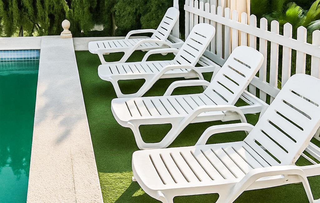 Öffnen Sie die Terrassentüren und treten Sie hinaus in den gepflegten Außenbereich. Nehmen Sie auf den bequemen Gartenmöbeln Platz oder entspannen Sie auf einer der Sonnenliegen am Pool. Ziehen Sie erfrischende Bahnen im Wasser oder lassen Sie unter südlicher Sonne einfach die Seele baumeln.