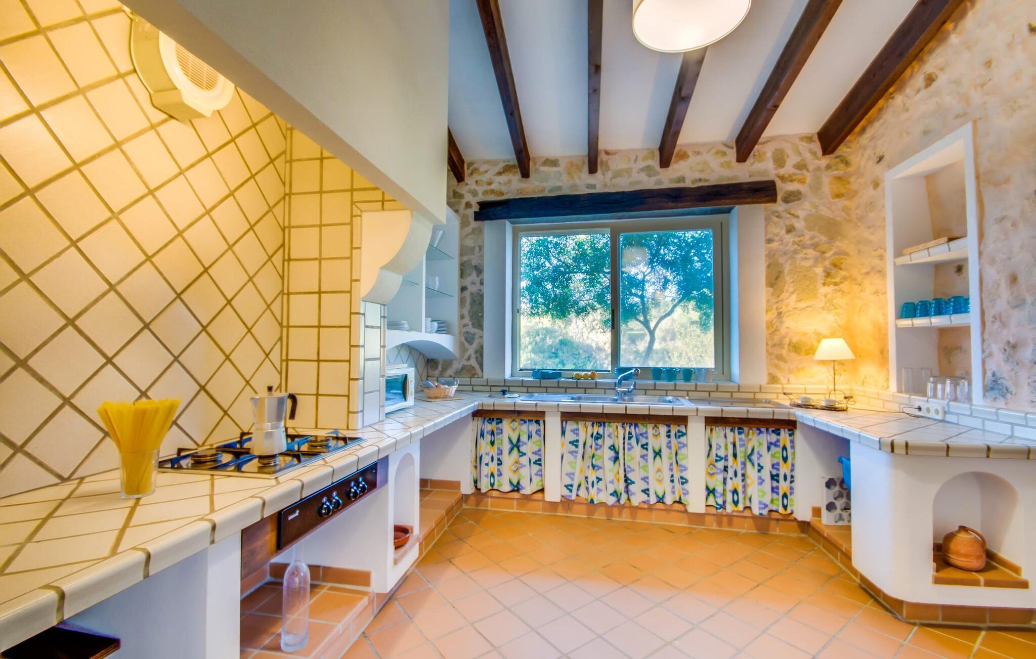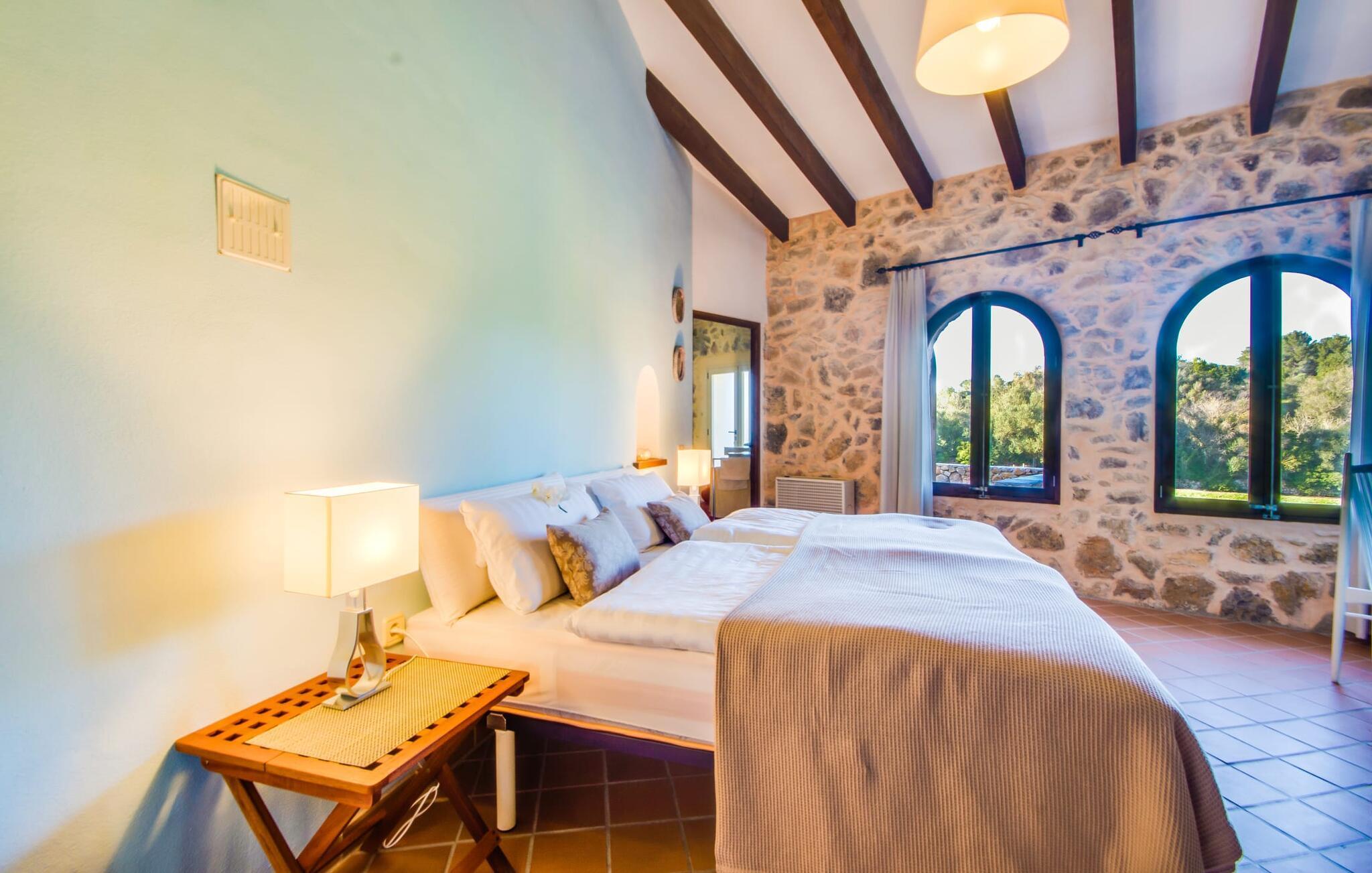 Auch wenn das typisch milde mallorquinische Klima Lust darauf macht, die Tage draußen im schönen Garten zu verbringen, darf auch das Innere der renovierten Villa nicht zu kurz kommen. Das Innendesign ist eine spannende Mischung aus authentischen mallorquinischen Bauelementen und modernem Purismus. Die gestalterische Sanierung erfolgte akribisch, was erklärt, warum alles so gut zusammenpasst – denn das Gebäude hat sich „entwickelt“. Die bisher kleinen Räume wurden zu einem großen Raum erweitert, in dem sich der Wohnbereich an den schicken weißen Esstisch und die offene Küche anschließt. Dezente und überwiegend helle Möbel, Küchenschränke aus Stein und ein gemütlicher Kamin bilden den Mittelpunkt des Gemeinschaftsraums. Terrakotta-Bodenfliesen, sichtbare Steinwände, Holzbänke und helle Räume verleihen dem Gebäude seinen modernen Charakter. Zwischen den einzelnen Räumen finden Sie oft ein paar Stufen. Diese leicht unterschiedlichen Ebenen unterstreichen den individuellen Charakter des Innenraums. Sehr praktisch ist auch, dass an beide Schlafzimmer ein Badezimmer angrenzt. Beide Schlafzimmer haben eine angenehme Größe und viel Stauraum. Eines der Badezimmer ist modern und verfügt über eine ebenerdige Dusche. Das zweite Badezimmer ist Luxus pur. Hier wurden die unterschiedlichen Ebenen genutzt, um im oberen Teil der Treppe eine Designbadewanne zu platzieren. Das Badezimmer verfügt außerdem über eine große ebenerdige Dusche und zwei angrenzende Waschbecken. Das Badezimmer hat eine Tür, die Sie direkt aus dem Haus führt. Es ist aber auch von beiden Schlafzimmern aus zugänglich, so dass beide Schlafzimmer en suite sind. Auch die Inneneinrichtung dieser Villa ist absolut fantastisch. Dank der Heizung und des Kamins, die besonders im Winter nützlich sind, kann die Villa das ganze Jahr über gemietet werden. Ökologisch hat diese Finca die Nase vorn: Der gesamte Strom wird über Photovoltaik bezogen (die Anlage wurde 2018 neu installiert). Für den Notfall steht ein Generator zur Verfügung.
