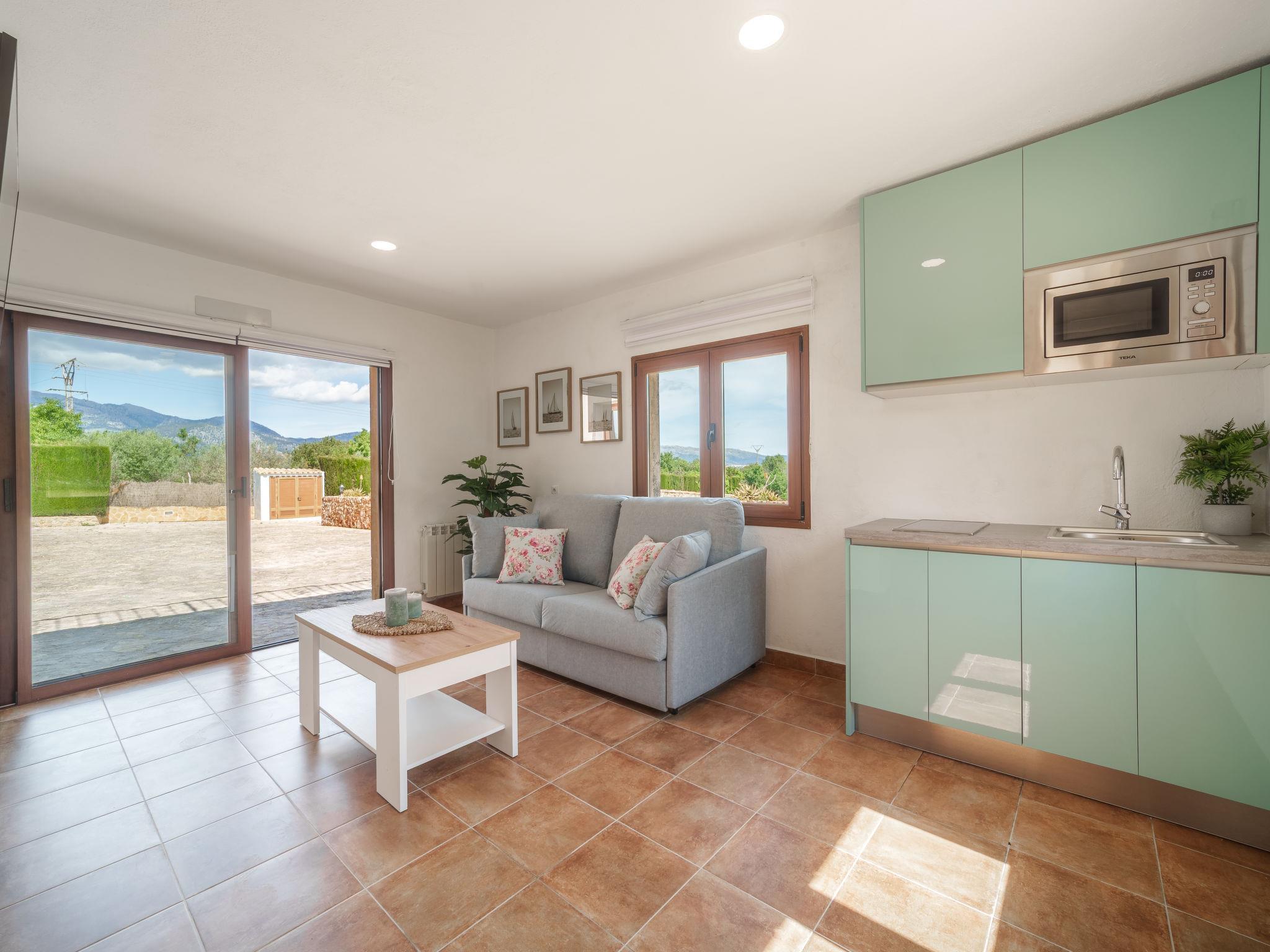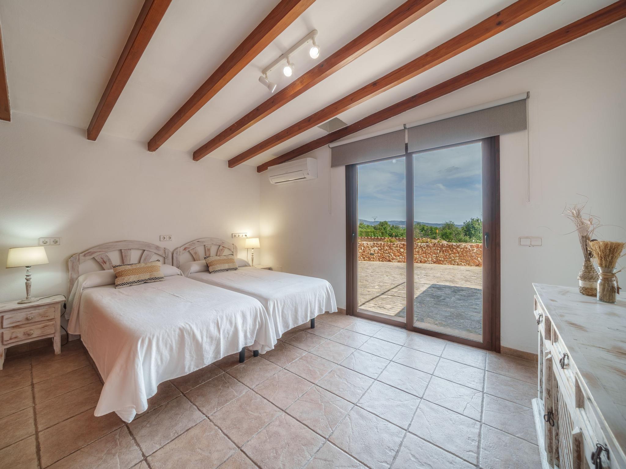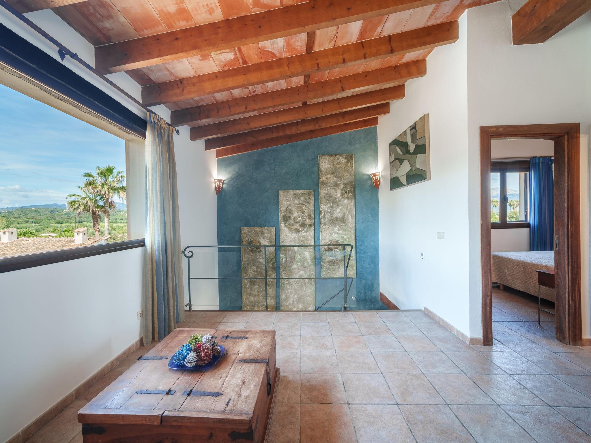"Son Bosc", 6-room villa 450 m2 on 2 levels. Object suitable for 9 adults. Spacious and bright, fully renovated, comfortable and cosy furnishings: large living room with panoramic window with digital TV, flat screen, air conditioning and forced-air heating. Exit to the patio. 1 large double bedroom with sliding door with 2 beds (90 cm, length 200 cm), digital TV, flat screen, air conditioning and forced-air heating. Exit to the patio. Lounge with digital TV, flat screen, air conditioning and forced-air heating. Exit to the patio. Kitchen-/living room (oven, dishwasher, 3 ceramic glass hob hotplates, microwave, freezer, electric coffee machine) with dining table, open-hearth fireplace (only for decoration), air conditioning and forced-air heating. Exit to the patio. Bath/WC, shower/WC. Upper floor: 1 large double bedroom with panoramic window Dressing room with 1 french bed (180 cm, length 200 cm), bath/shower/WC, double hand-basin, digital TV, flat screen, air conditioning and forced-air heating. (ladder), 1 double bedroom with panoramic window with 1 french bed (150 cm, length 200 cm), digital TV, flat screen, air conditioning and forced-air heating. (ladder), 1 double bedroom with panoramic window with 2 beds (90 cm, length 200 cm), digital TV, flat screen, air conditioning and forced-air heating. 1 large double bedroom with panoramic window with 1 french bed (150 cm, length 200 cm), air conditioning and forced-air heating. Exit to the balcony. Shower/WC, double hand-basin. Natural stone floors. Large balcony, large patio, lawn, porch. Terrace furniture, barbecue, deck chairs (9), covered balcony, sitting area. Very beautiful view of the mountains and the countryside. Facilities: washing machine, dryer, iron, children's high chair, baby cot for up to 2 year olds, hair dryer. Internet (WiFi, free). Parking (roofed), garage on the property at the house. Please note: suitable for families one double bedroom is outside the apartment. No lift. The pool mentioned in the description is for private use. ETV/11105 // Reg. Nr.: ESFCTU0000070110000267710000000000000000000ETV/111052