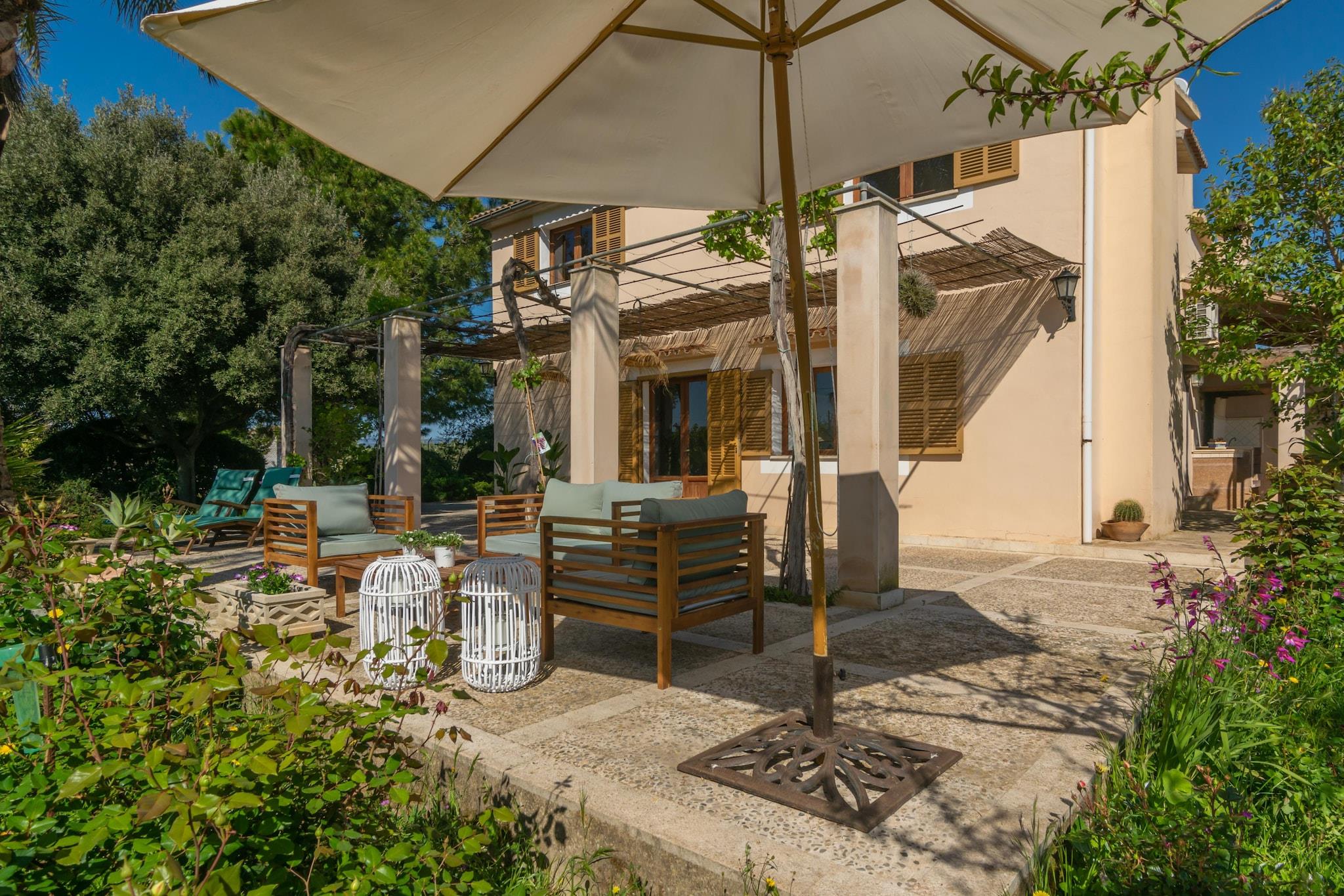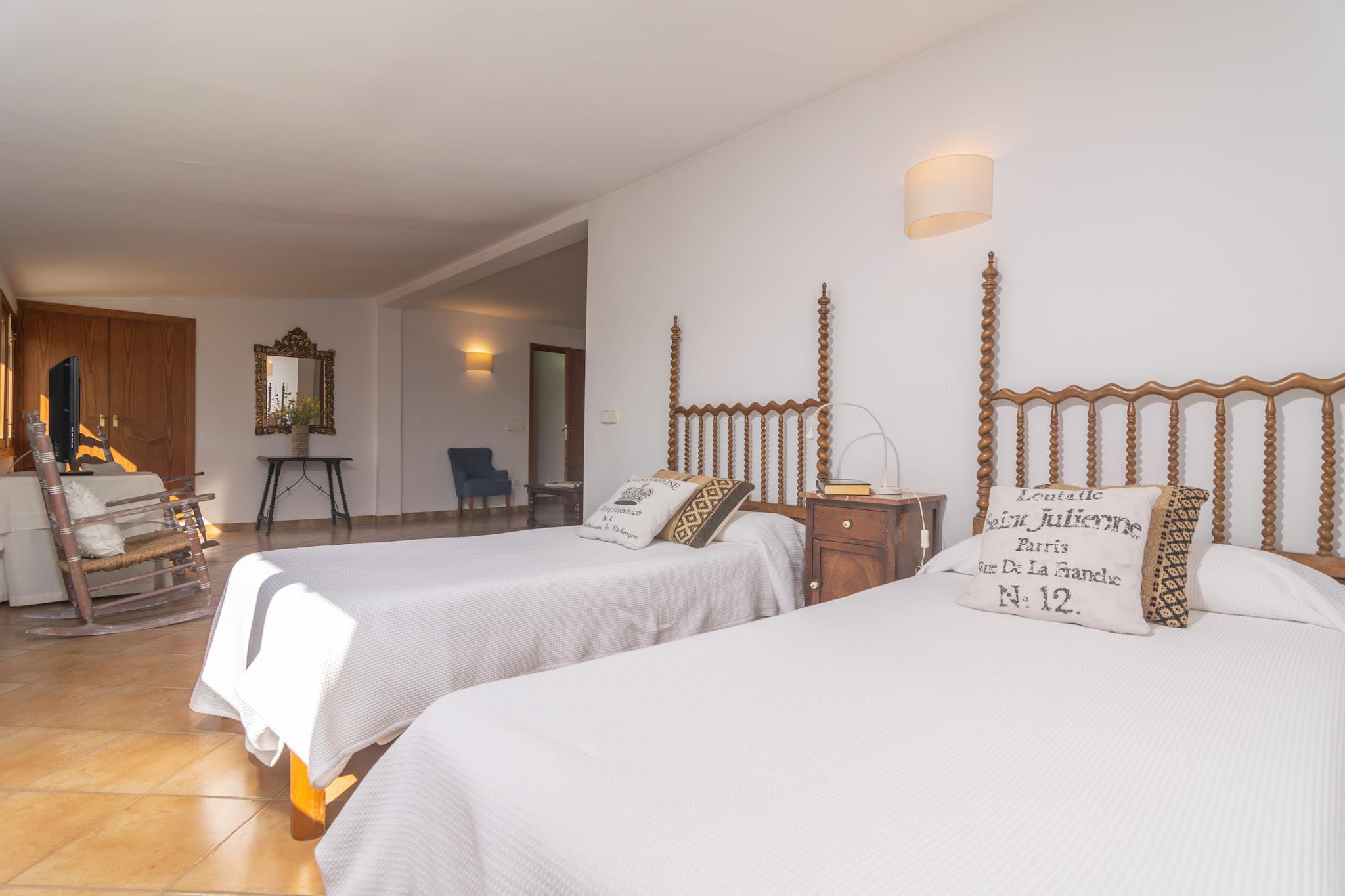 This cosy and great villa invites to relax thanks to the peace that the fields offer. The lovely exterior area that includes fruit trees, the furnished terrace with a barbecue and a natural pond with fishes, and the patio in front of the house also perfectly furnished with two sun loungers, tables with chairs to enjoy your appetisers alfresco, will make you fully enjoy your stay. The property is fenced and there are neighbours around. The house has two floors. Upon entering, you will find a spacious and comfortable living-dining room with air conditioning, ideal for dining together and then chatting or relaxing while watching satellite TV. The kitchen is independent and offers a gas stove, oven, and a beautiful Mallorcan style, among many other features. There are two bathrooms with showers on this same floor that serve the entire house, although one of them is located outside and accessed through the garage. For resting, there are three bedrooms, two on the main floor with wardrobes, one with a double bed and the other with a single bed. Then, there is the third bedroom upstairs with two single beds and a sitting area with a TV (without satellite). There is a washing machine on the terrace, as well as an iron and ironing board. A crib and a high chair are also available. Inca is a lovely and familiar city basically in the centre of the island offering all needed services for an independent stay such as bars, Majorcan restaurants, shops, supermarkets, etc. It also offers an easy access to any point of the island in a reasonable amount of time. You cannot miss its street market on Thursday morning that has been taking place for centuries and is the perfect place to buy local products. The nearest beach is Playa de Muro about 27.3 km away which is characterised by its crystal-clear water and fine sand. Note: This accommodation is intended for families and guests over 30 years old who are looking for a peaceful stay. Bookings for parties or celebrations are not accepted. A copy of the identification document of all guests will be required to confirm the reservation. Consult the advertiser for possible charges. Pets are not allowed. The holding of events is forbidden. There is exterior parking for 3 cars. Distances Beach: 27.3 km - Platges de Muro Airport: 37.3 km - Son Sant Joan Golf course: 29.5 km - Golf Alcanada Town: 1.3 km - Inca Train station: 2.5 km - Inca Bus stop: 2 km - Inca Ferry: 28.5 km - Puerto de Alcúdia Hospital: 2.8 km - Hospital Comarcal d'Inca Tourist license: ETV/12466Single Rental Registry: ESFCTU0000070110002977820000000000000000000ETV/124665There's a mandatory tourist tax in Balearic Islands, called Ecotasa. All guests, except people under 16 years, have to pay this tax. The amount varies between 0.55EURO/night and guest during the low season and 2.2EURO/night and guest during the high season .The tax is reduced by half from the 9th day for your stay. Homerti - Central de Reservas CR/33
