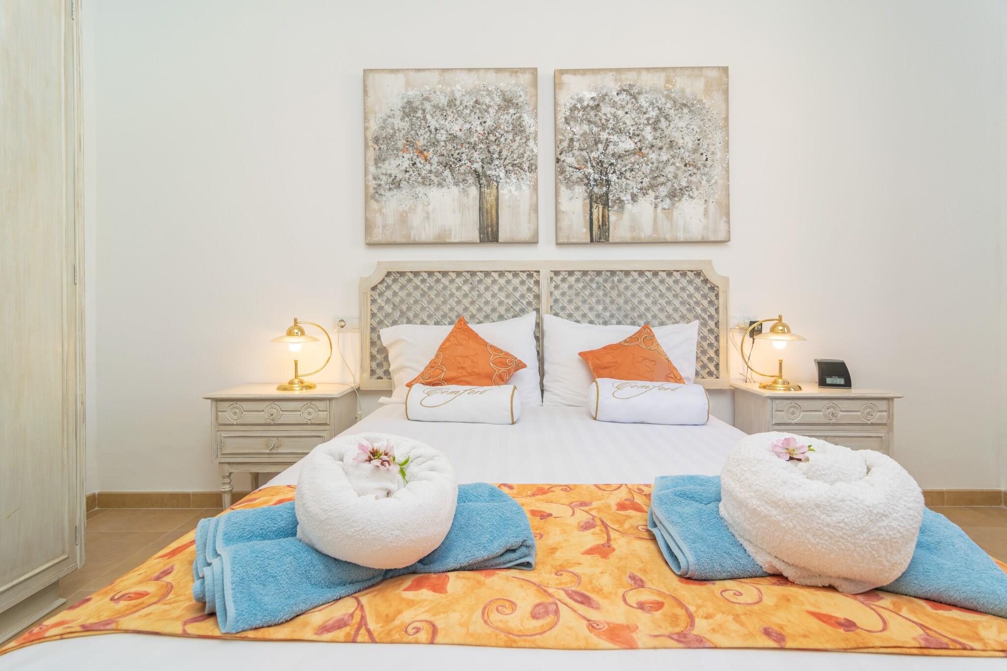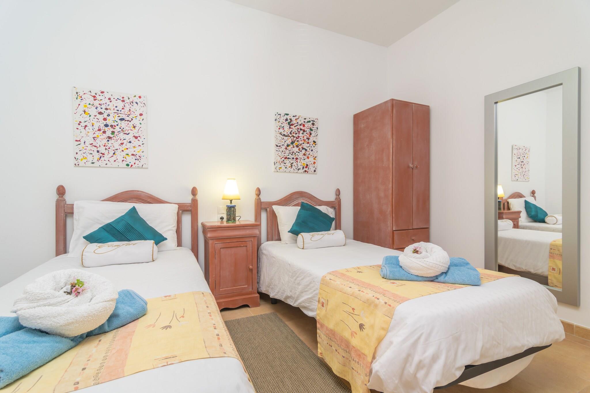Living room, Living room, Kitchen(coffee machine, oven), bedroom(2x single bed), bedroom(double bed), bathroom, bathroom, cooker, microwave, dishwasher, fridge-freezer, shower, washbasin, washbasin, toilet, toilet, air conditioning, BBQ, swimming pool, children's bed, high chair