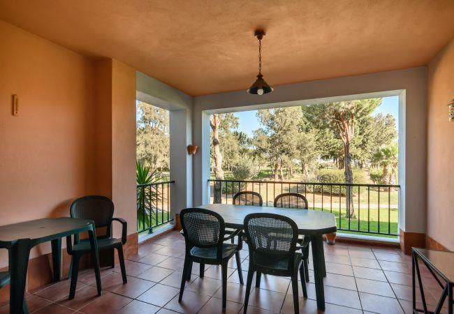 The apartment in Isla Canela has 3 bedroom(s) and can accommodate 6 people. Cosy and fully equipped accommodation of 112 m², located on the first line of the golf course, with views of the garden. It is located 0 m from the supermarket, 0 m from the metro, 1 km from the 'Isla Canela Old Course' golf course, 3 km from the 'Playa de Isla Canela' sandy beach, 4 km from the 'Estación de Autobuses' bus station, 5 km from the town of 'Ayamonte', and is located in an ideal area for children and within a residential complex. It has a lift, garden, garden furniture, fenced plot, 20 m² terrace, washing machine, iron, internet access (wifi), hairdryer, tennis court, paddle tennis court, heat pump heating, air conditioning throughout the accommodation, communal+children's pool, covered parking in the same building, 1 TV. The independent kitchen, with ceramic hob, is equipped with fridge, microwave, oven, freezer, dishwasher, crockery/cutlery, cooking utensils, coffee maker, toaster and juicer.