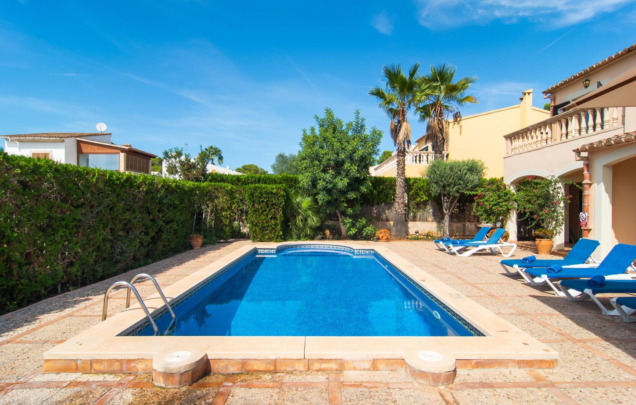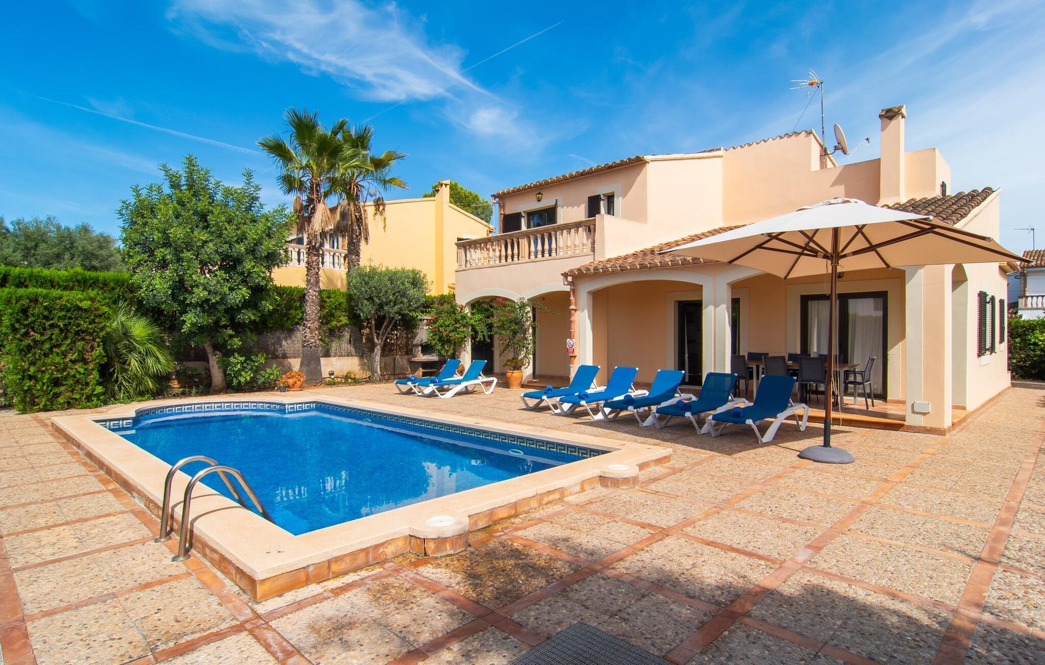 Die gepflegte Villa „Karen“ im Süden Mallorcas ist über ein kleines Tor zugänglich und von Hecken und Terrassen umgeben. Der schöne, lange Naturstrand von Sa Rápita ist bequem mit dem Fahrrad zu erreichen.